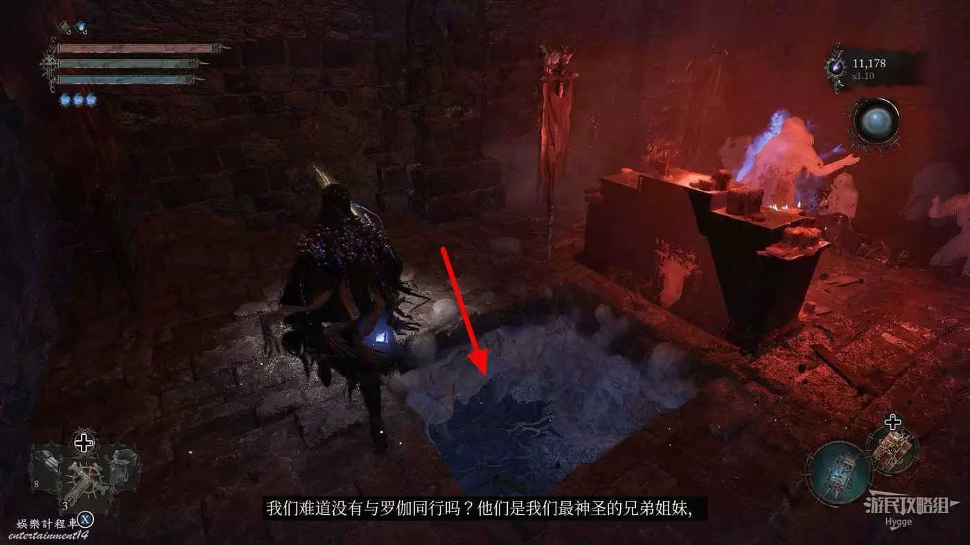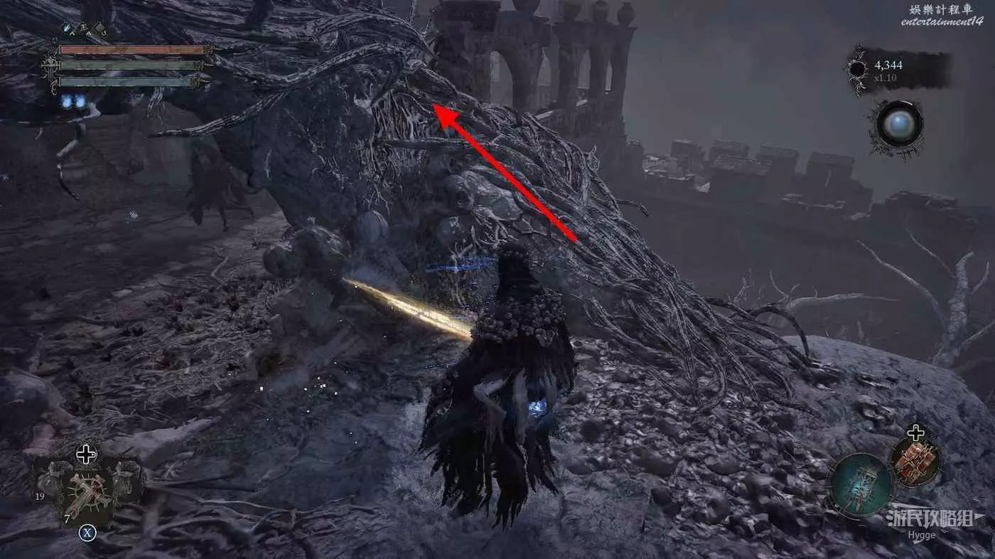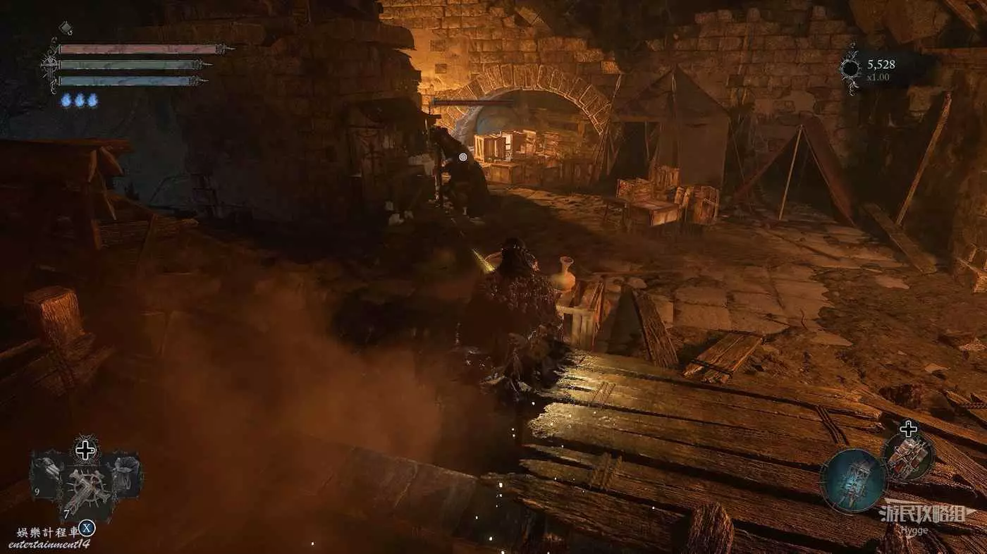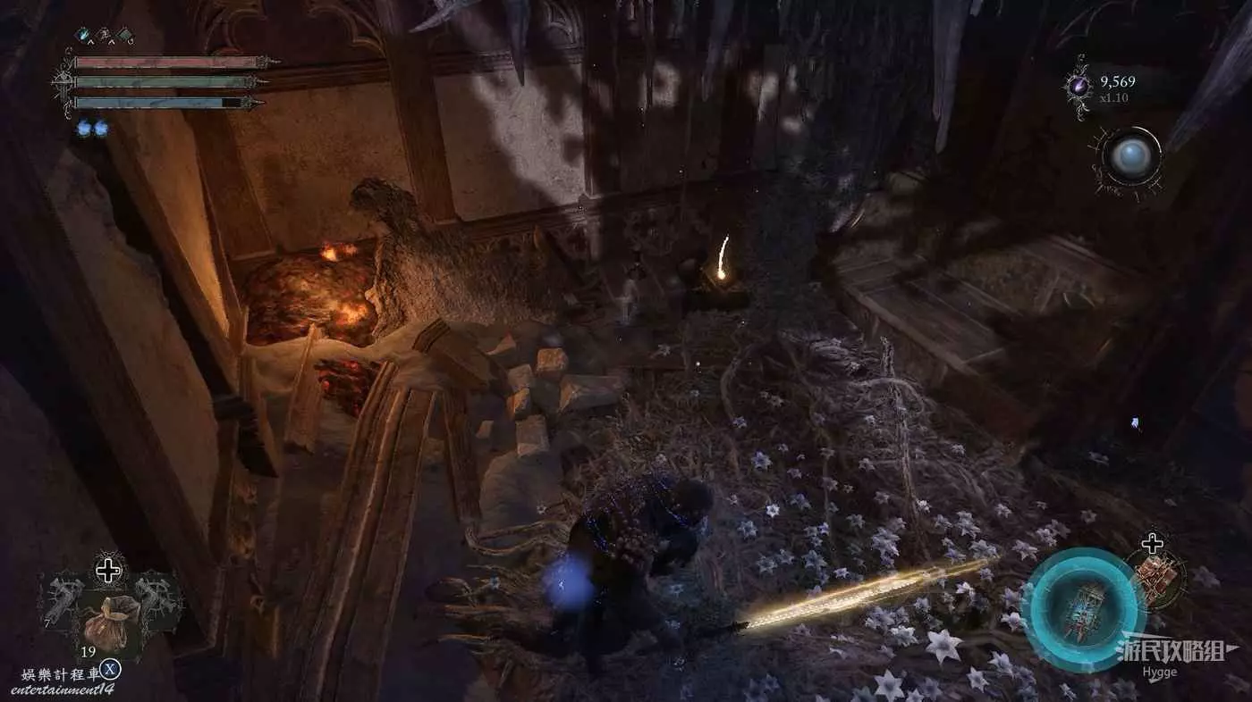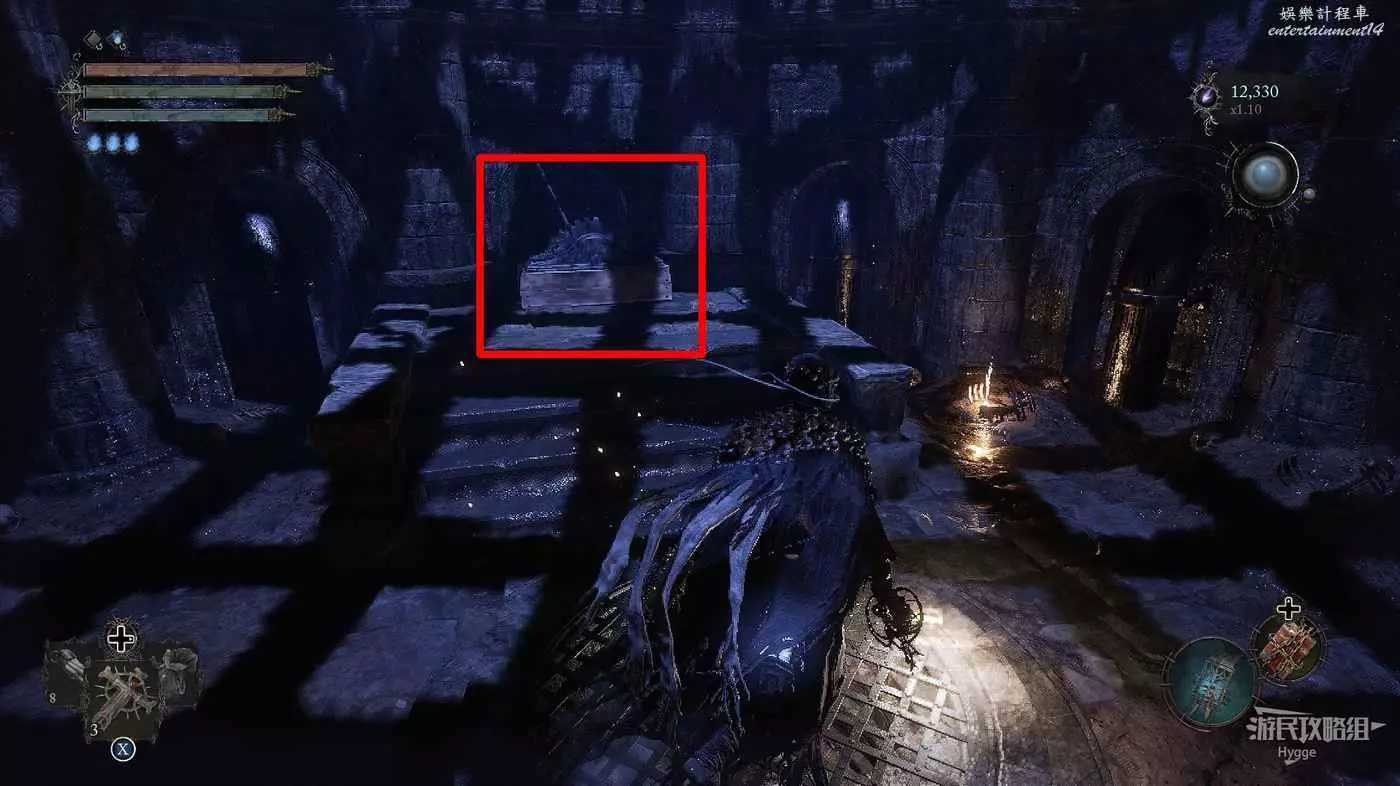 在前方右側的屋子裡先啟動【麻木女巫莉蒂亞遺骸】,然後回到屋外平臺放下梯子前往下層廣場。