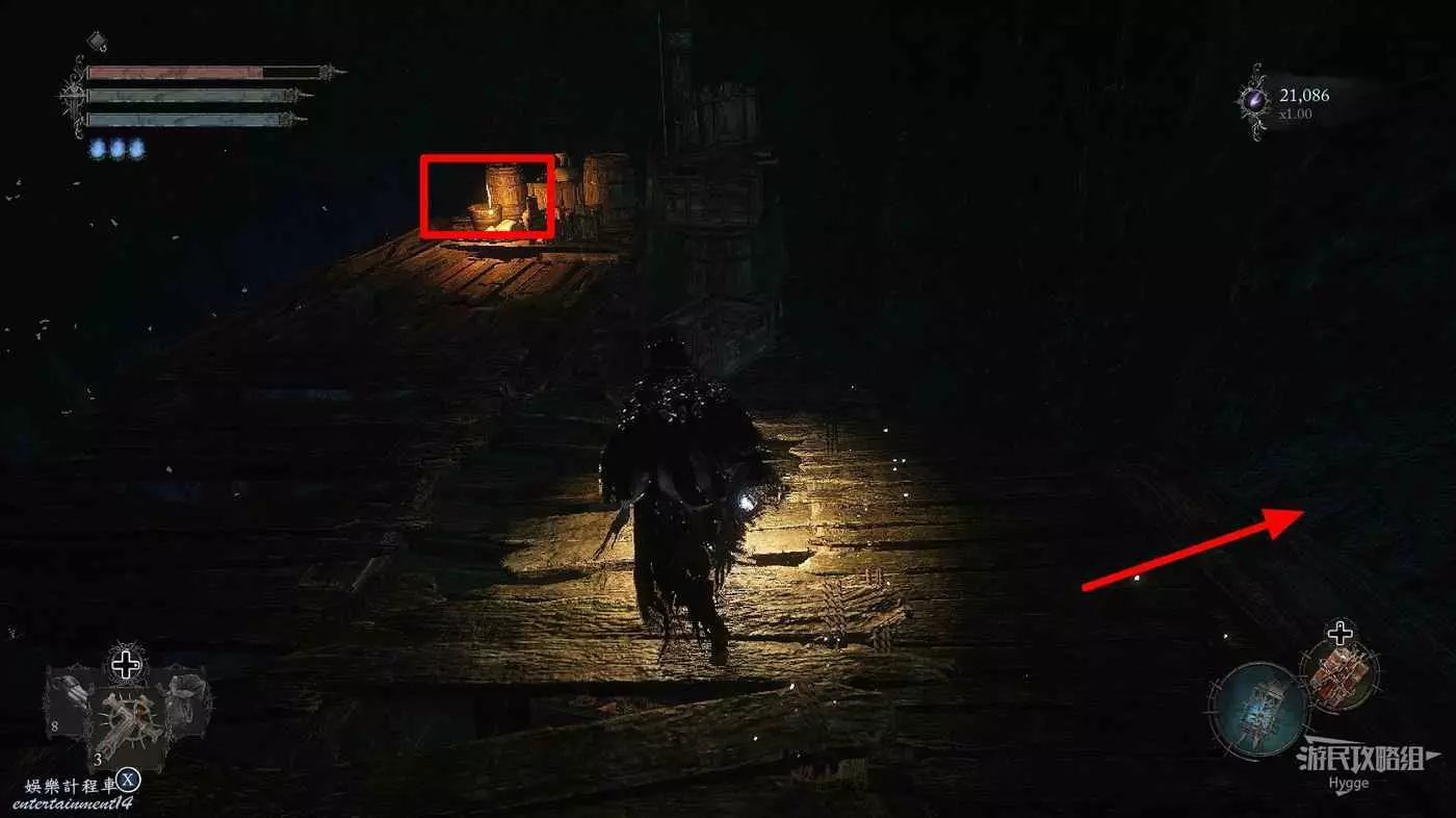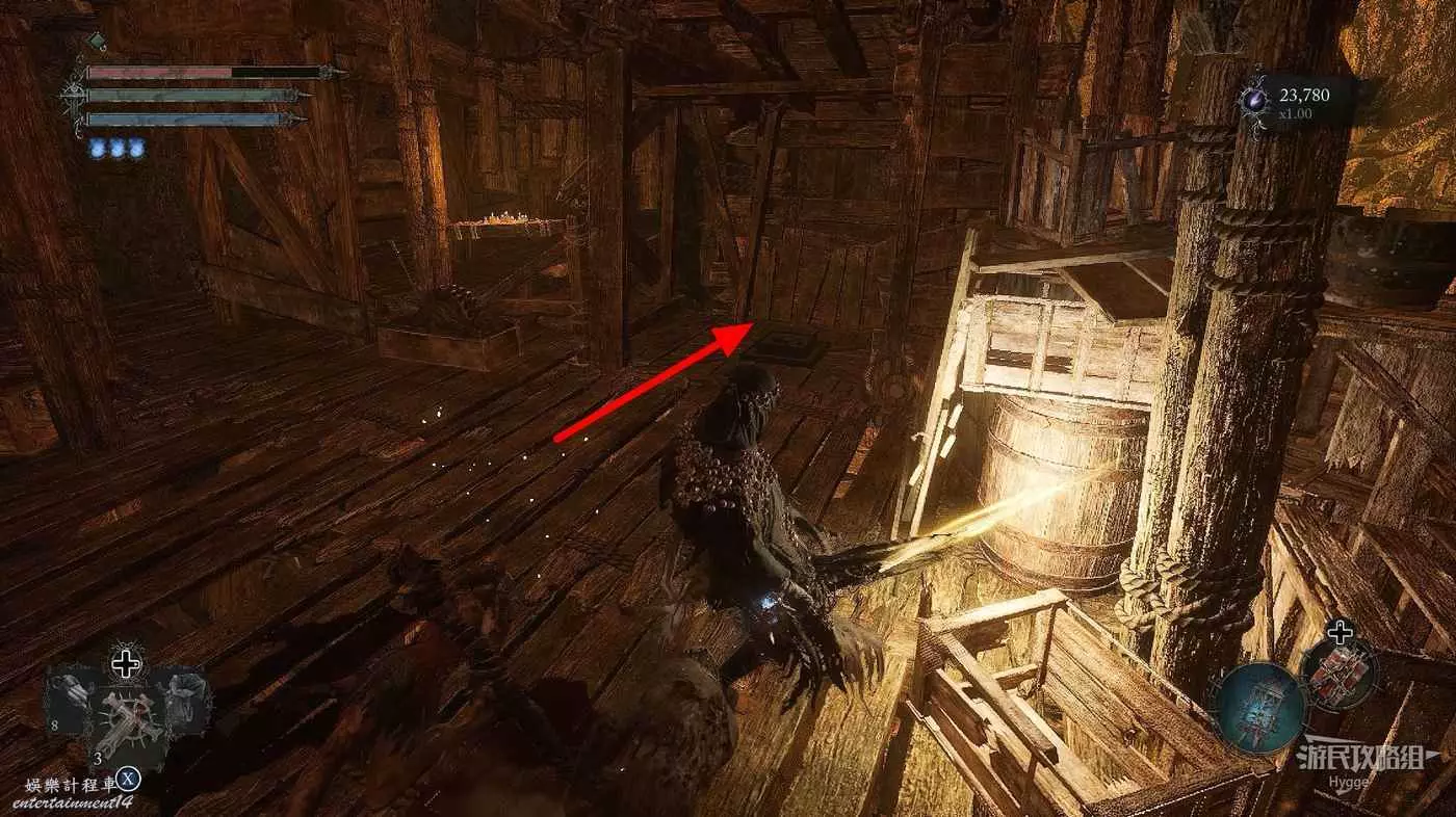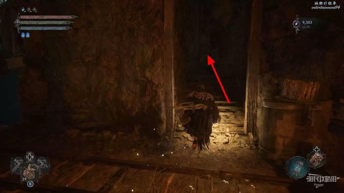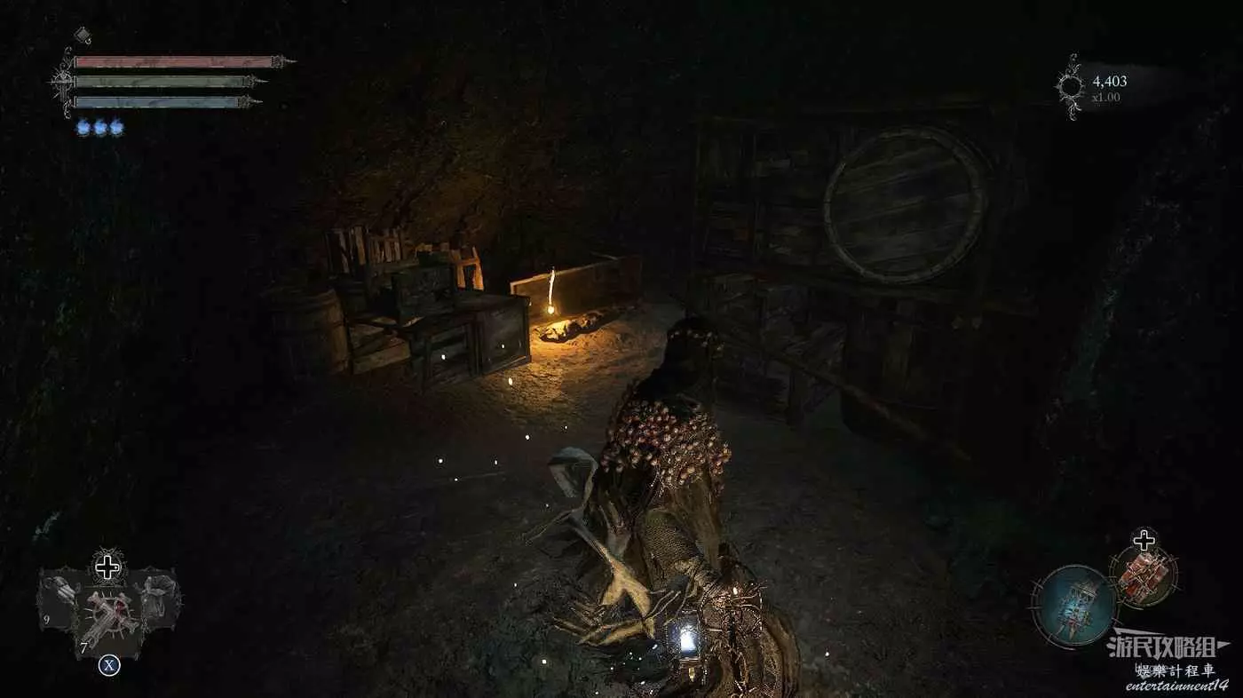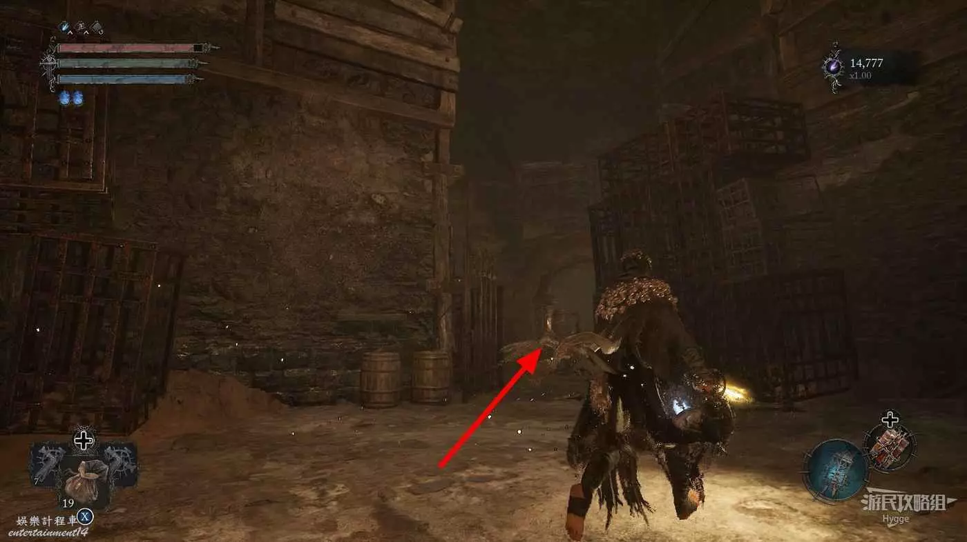 沿著樓梯向上,在看到道具時小心,右側的臺階上會滾下一個木桶。躲開木桶後擊殺房間中的雙斧戰士。