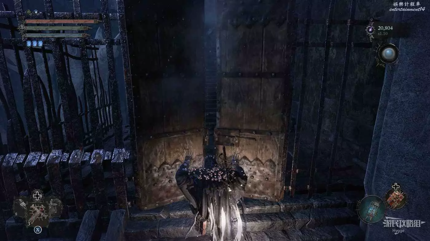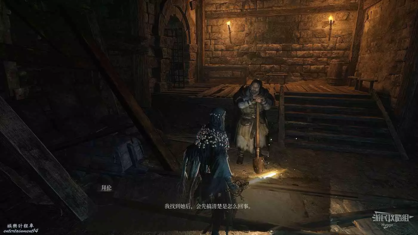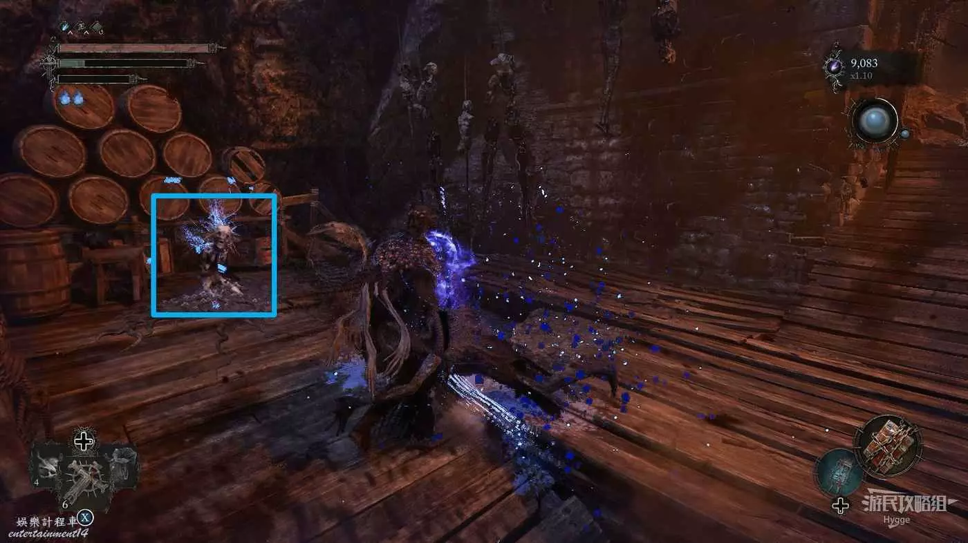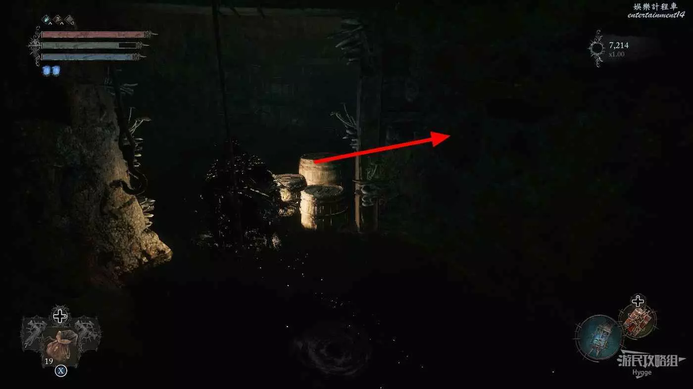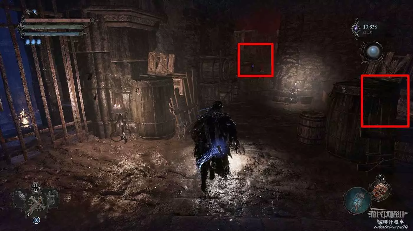 沿著樓梯向上,在看到道具時小心,右側的臺階上會滾下一個木桶。躲開木桶後擊殺房間中的雙斧戰士。