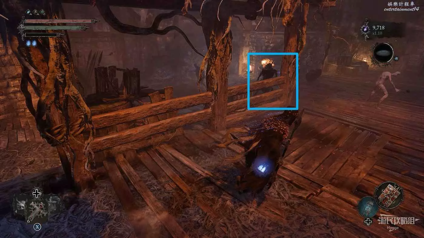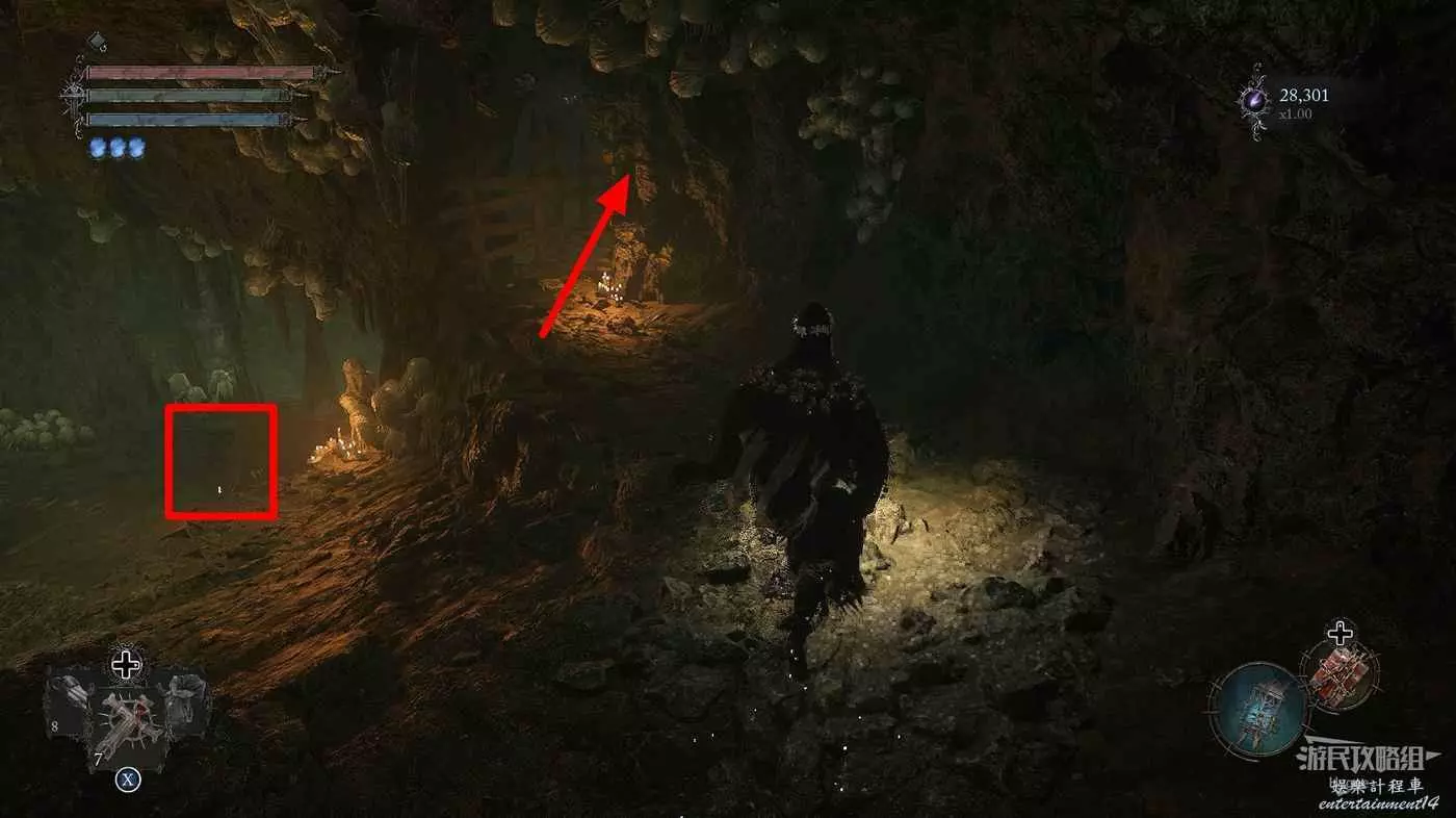 在岔路口先往左走點燃一個篝火後,跳到右側的平臺擊殺一名真菌弓箭手。
