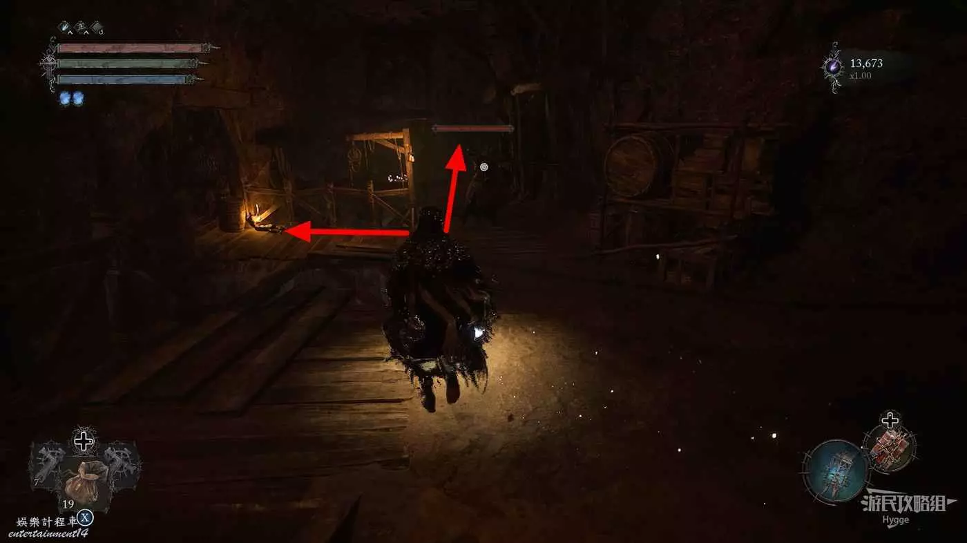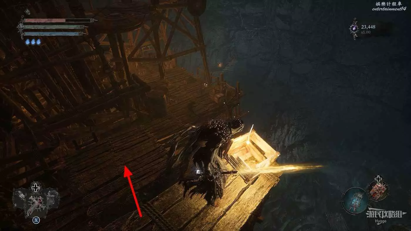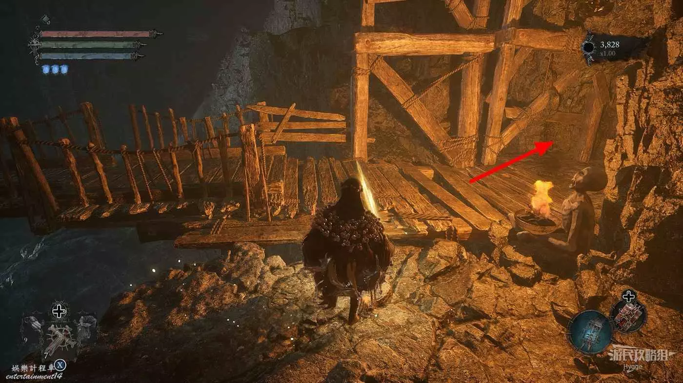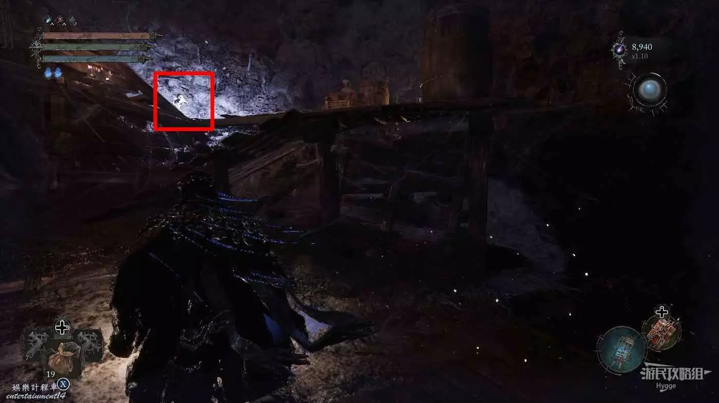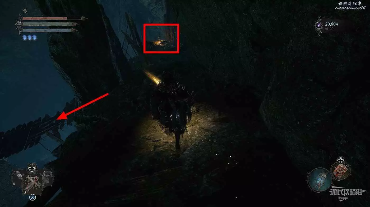 在平臺角落裡可以拿到一個精力,道具前的木板會塌陷導致我們掉落至下層,但是和從右側的山洞走沒有區別。