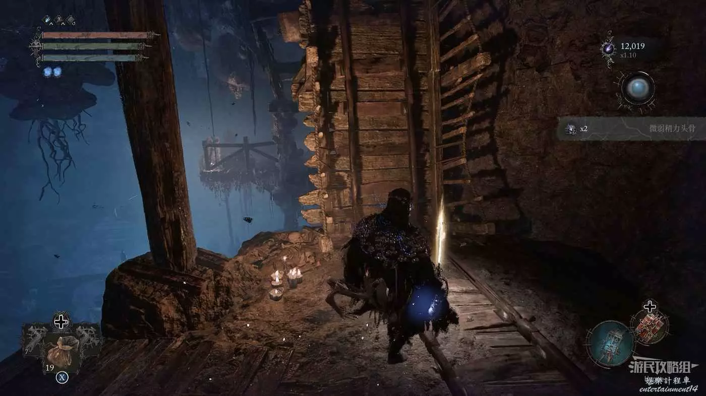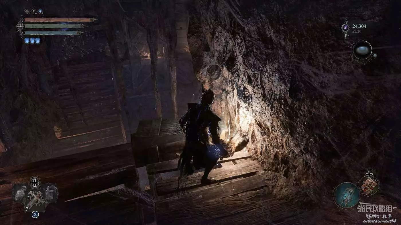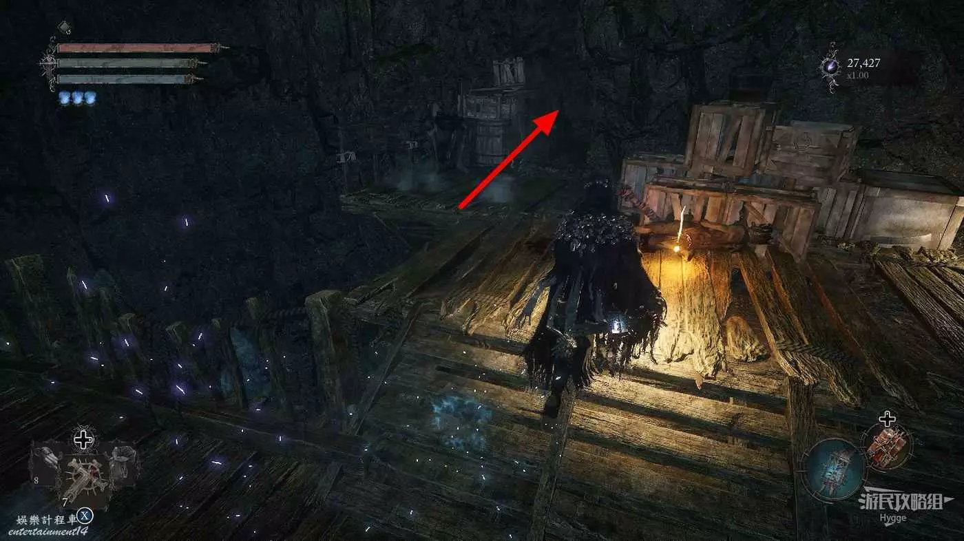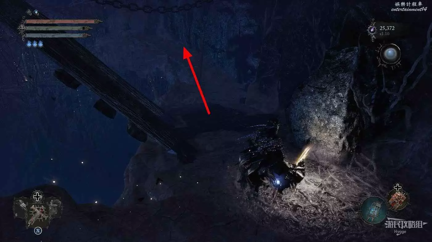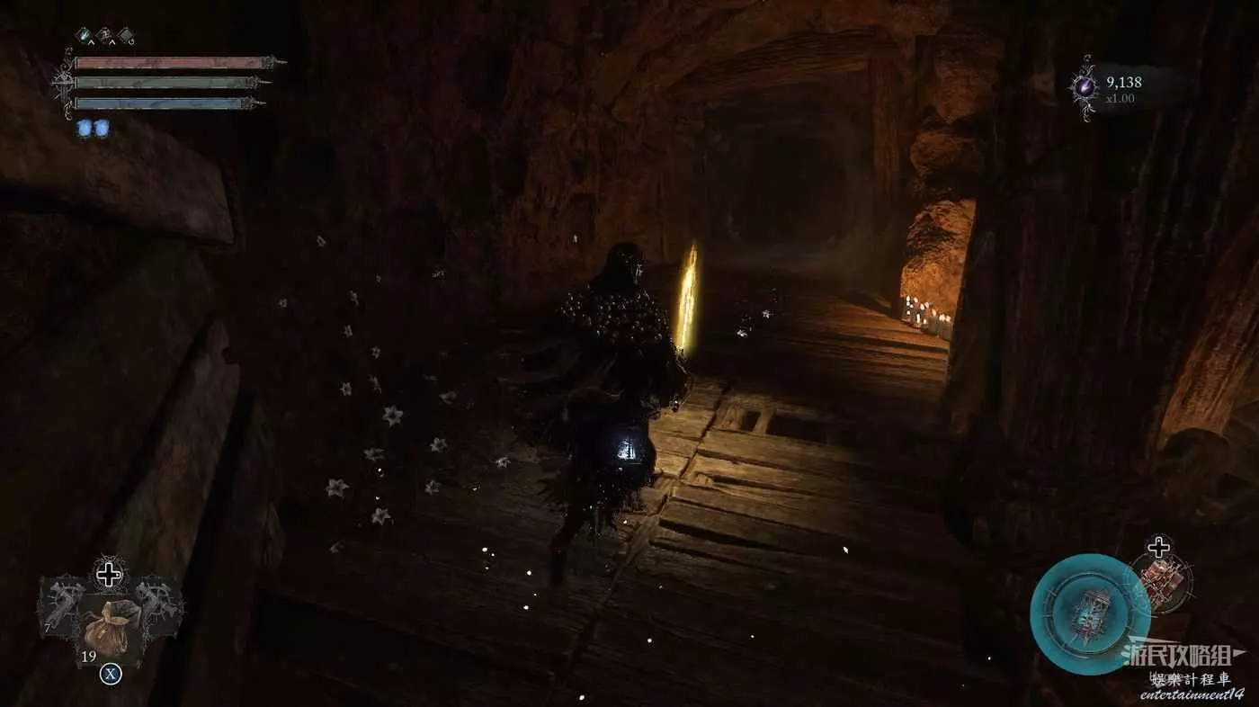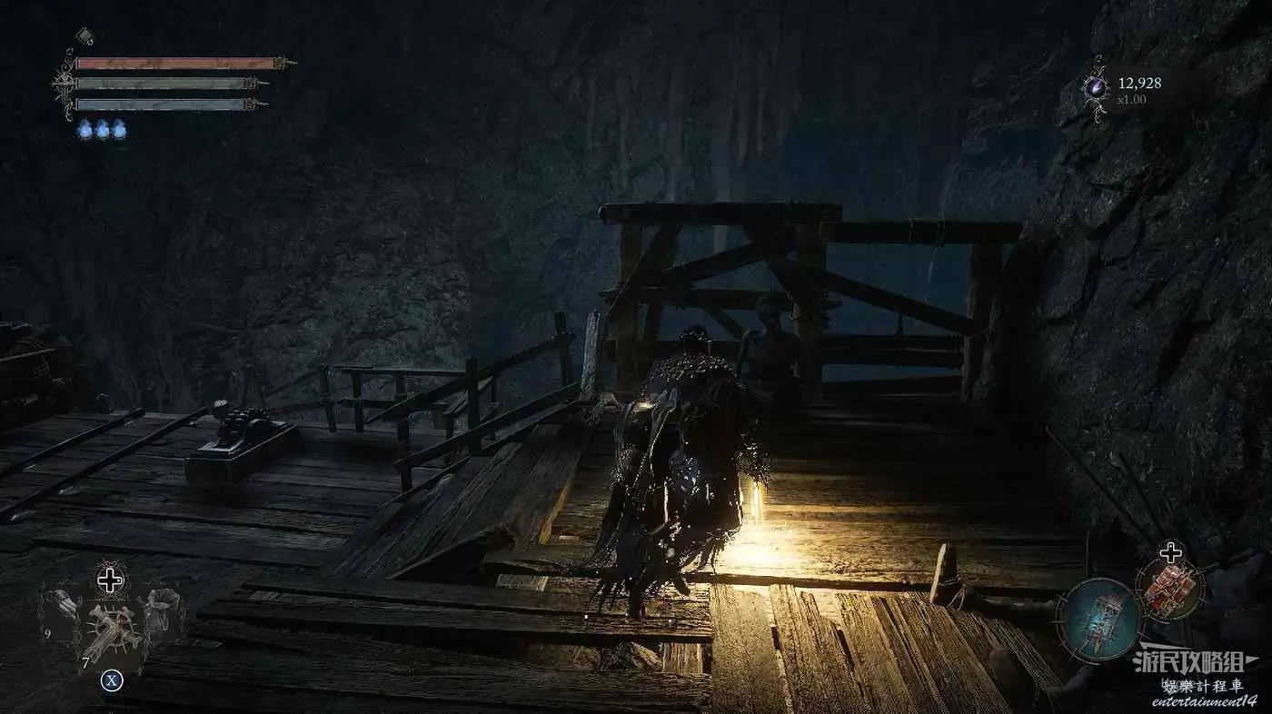 在平臺角落裡可以拿到一個精力,道具前的木板會塌陷導致我們掉落至下層,但是和從右側的山洞走沒有區別。