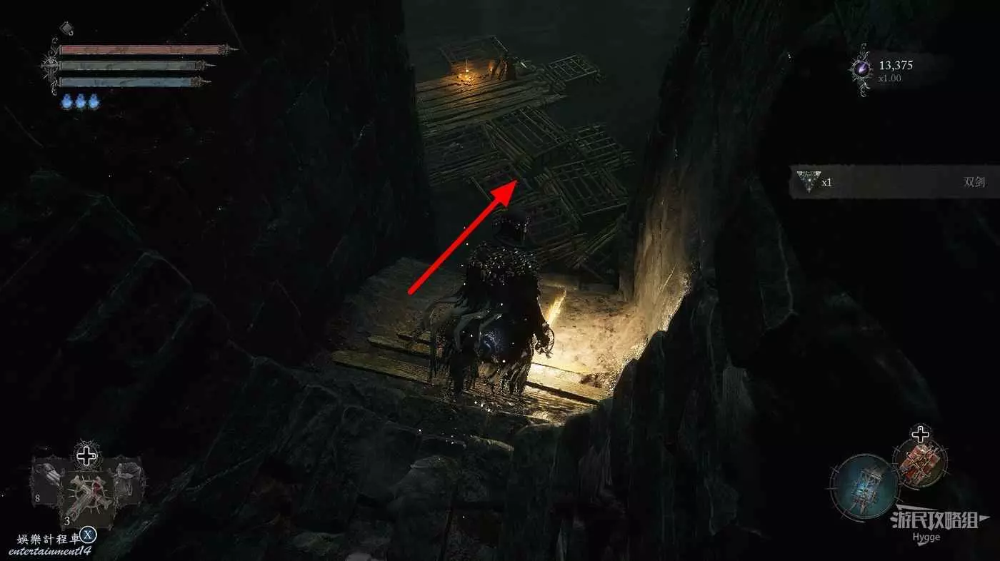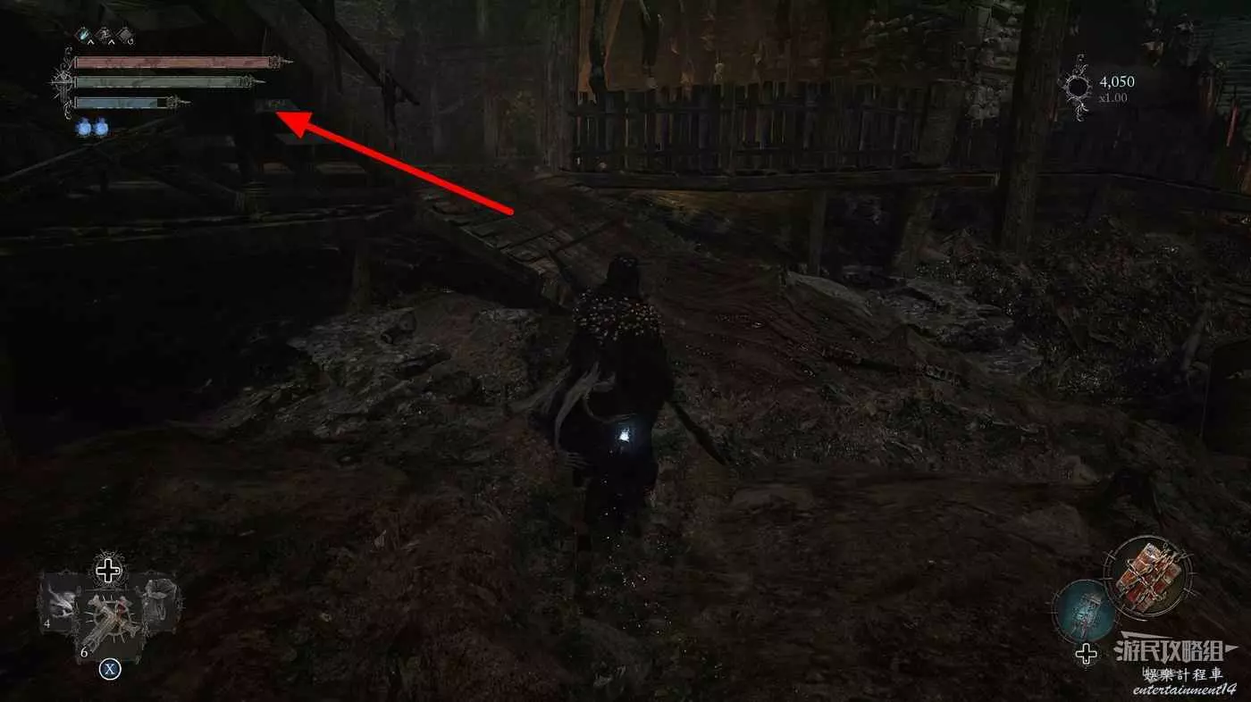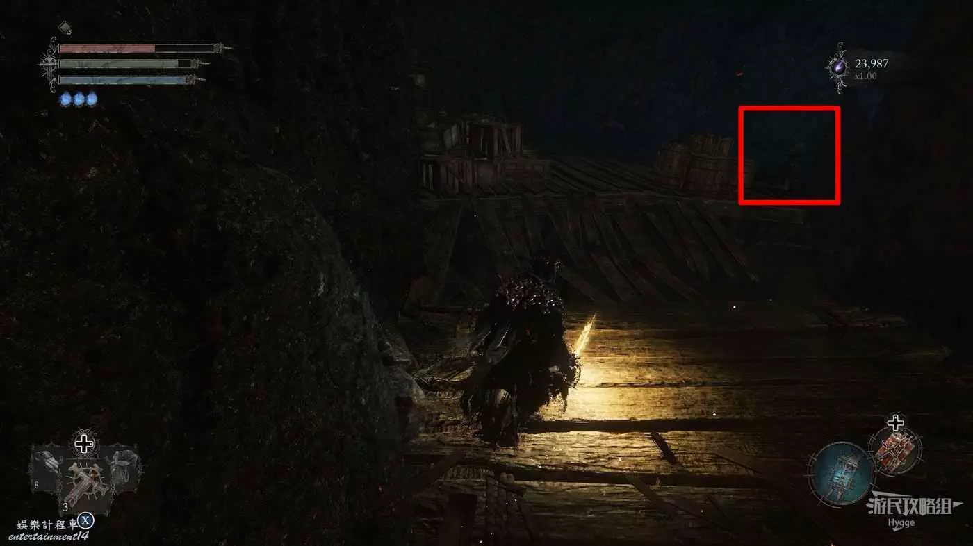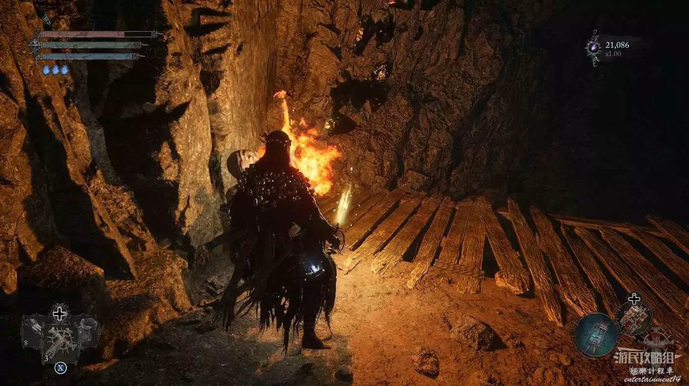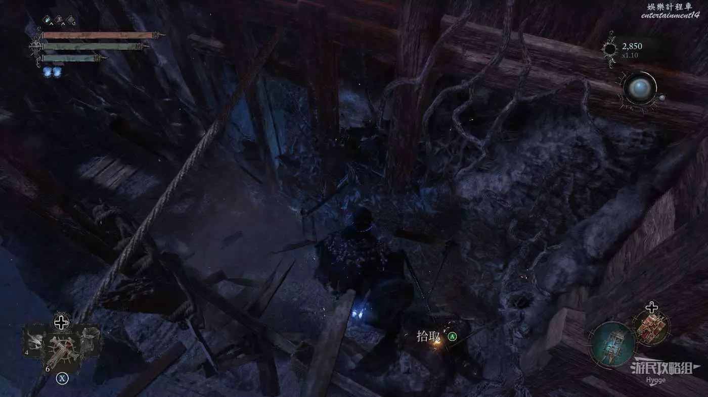 在平臺角落裡可以拿到一個精力,道具前的木板會塌陷導致我們掉落至下層,但是和從右側的山洞走沒有區別。