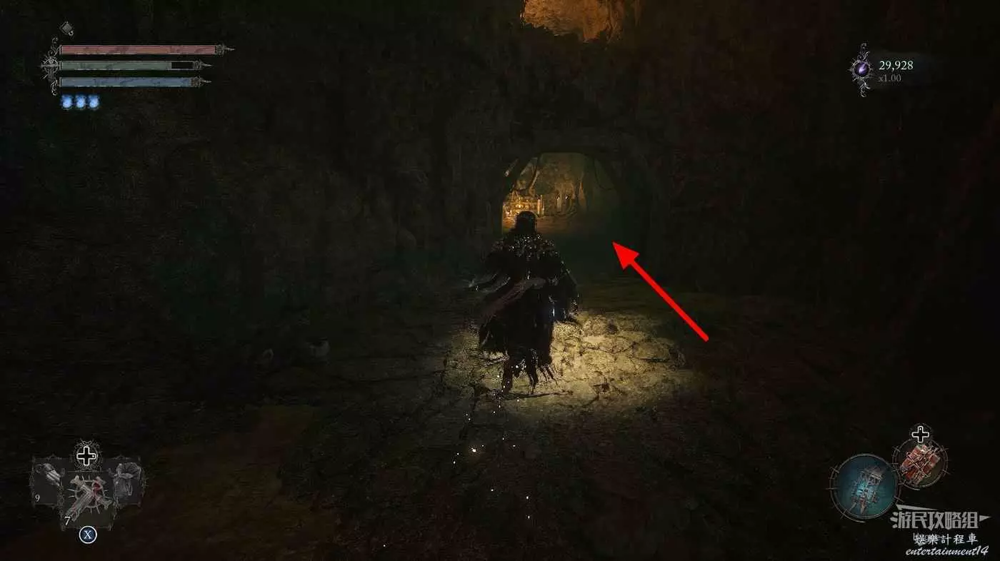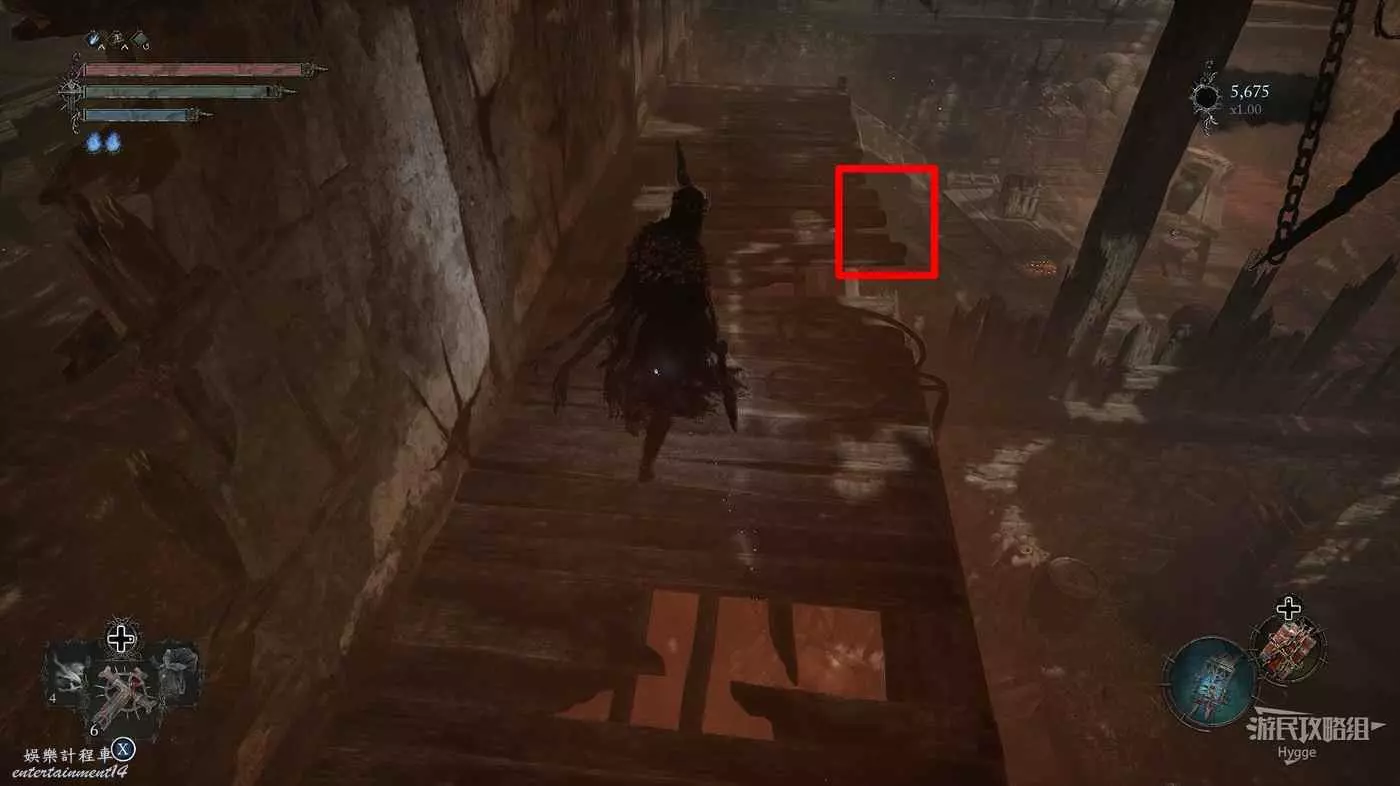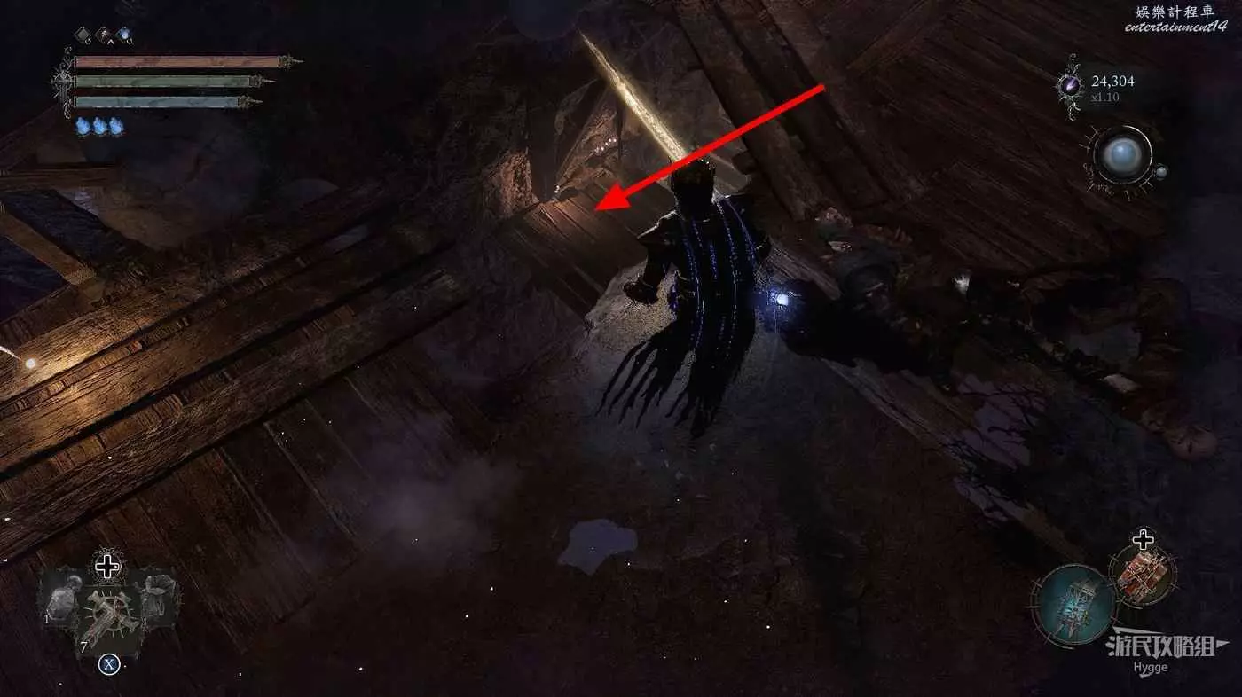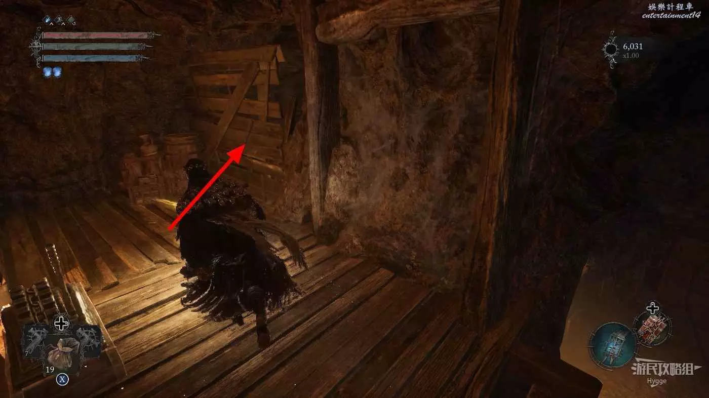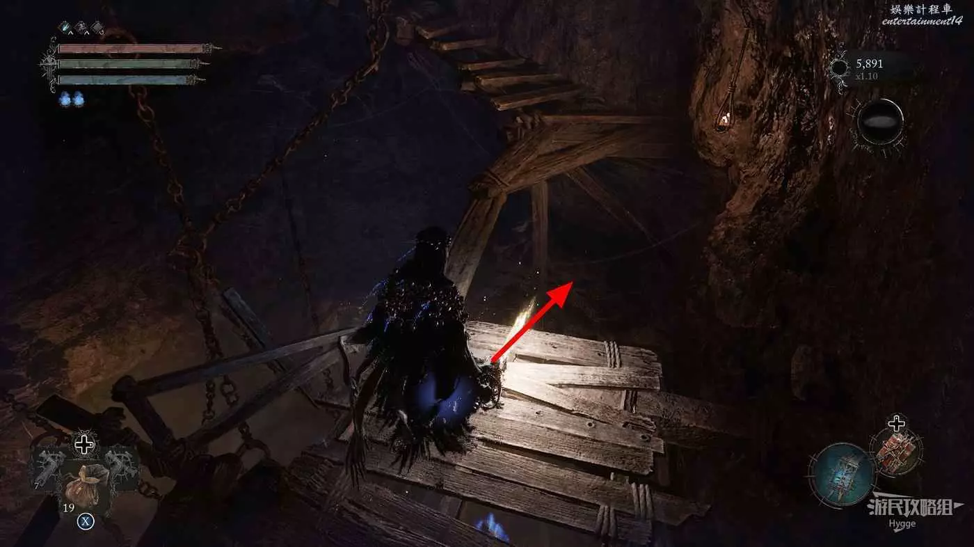 在平臺角落裡可以拿到一個精力,道具前的木板會塌陷導致我們掉落至下層,但是和從右側的山洞走沒有區別。