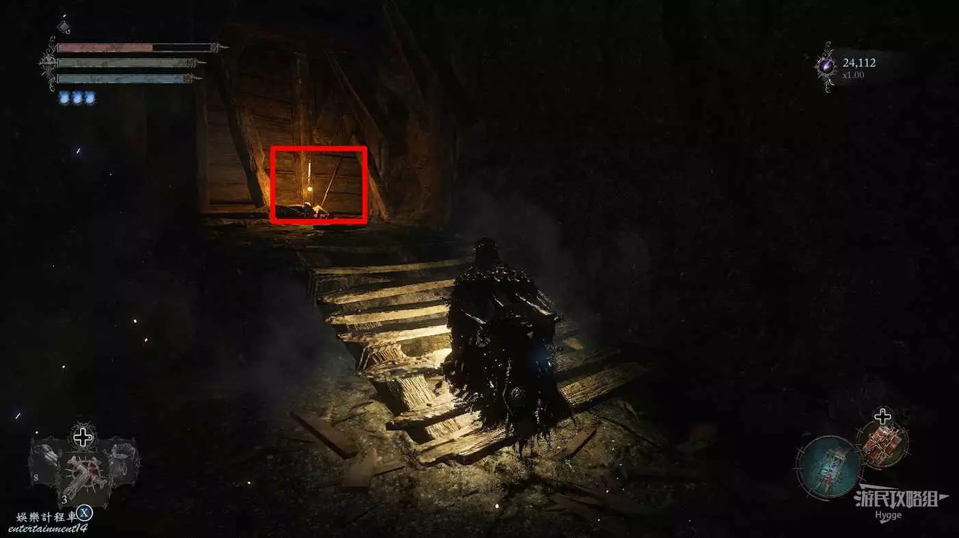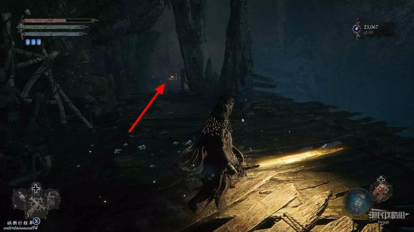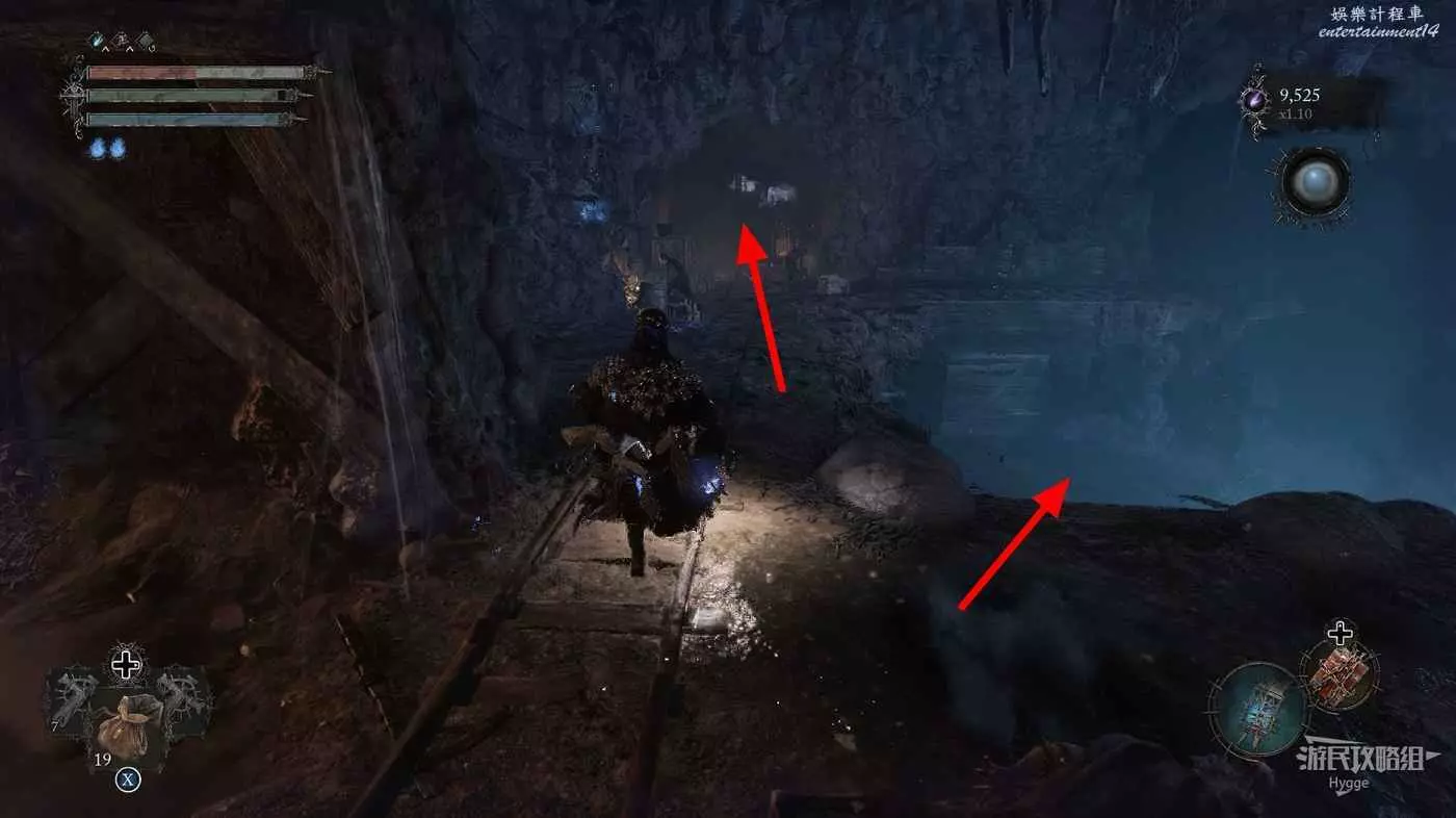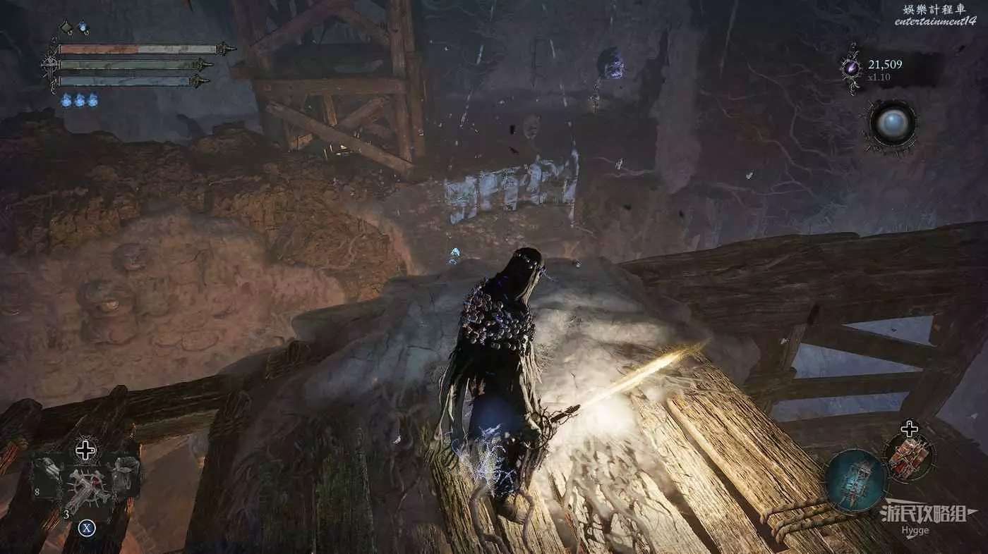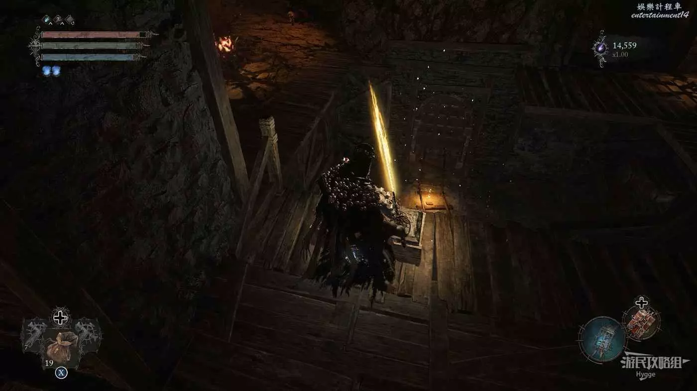 在平臺角落裡可以拿到一個精力,道具前的木板會塌陷導致我們掉落至下層,但是和從右側的山洞走沒有區別。
