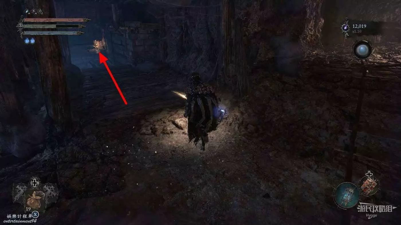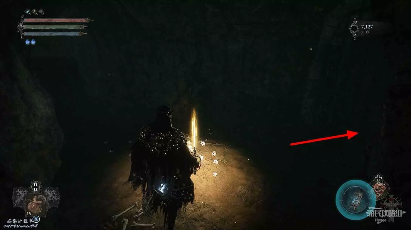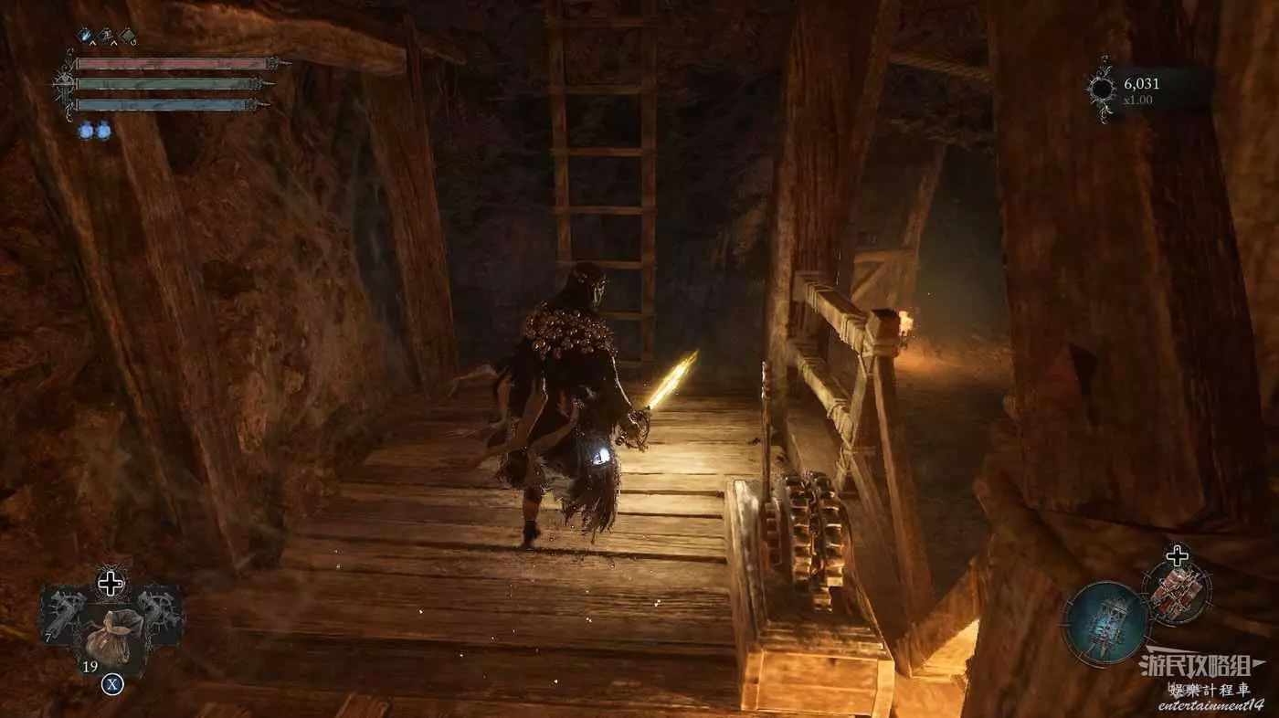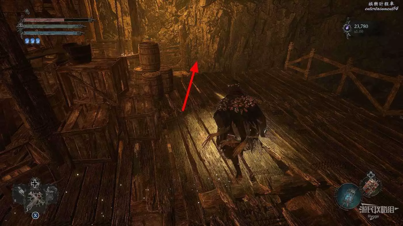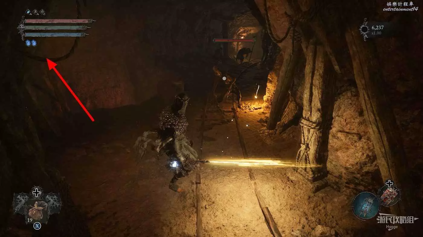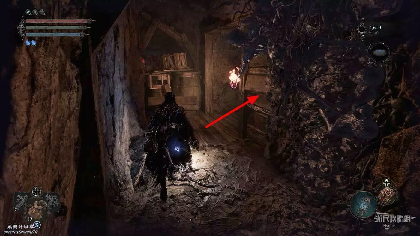 在平臺角落裡可以拿到一個精力,道具前的木板會塌陷導致我們掉落至下層,但是和從右側的山洞走沒有區別。