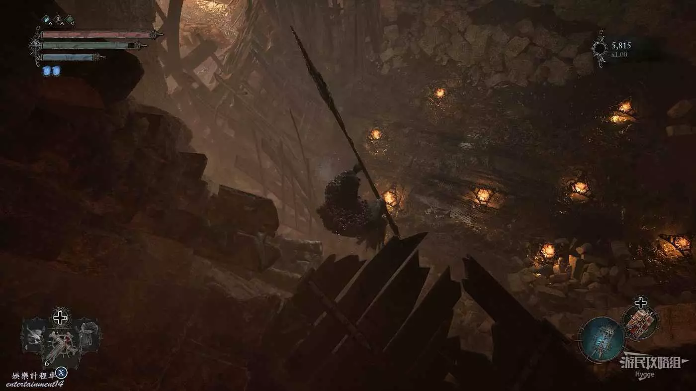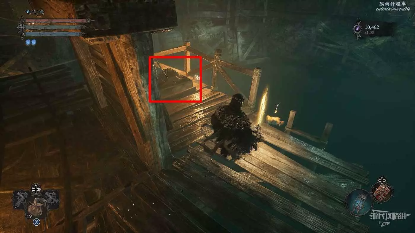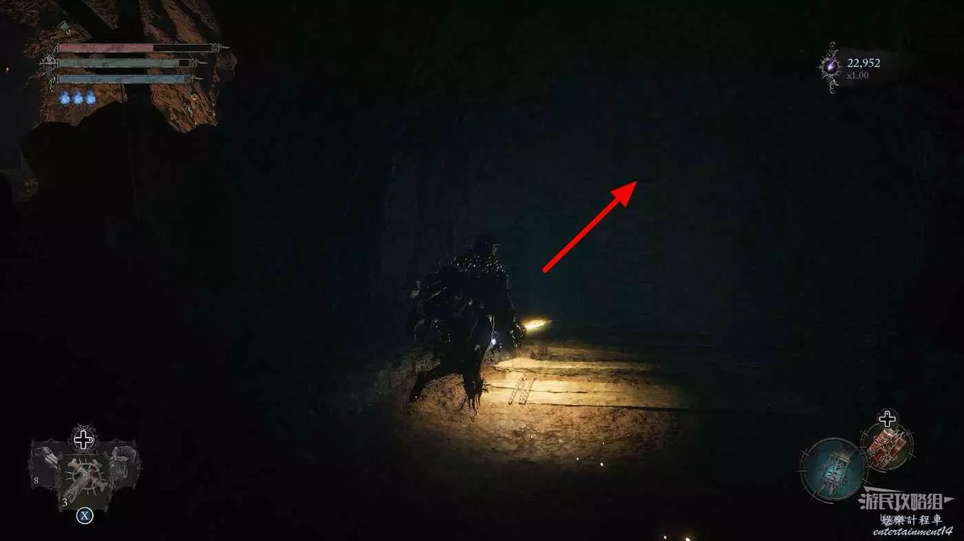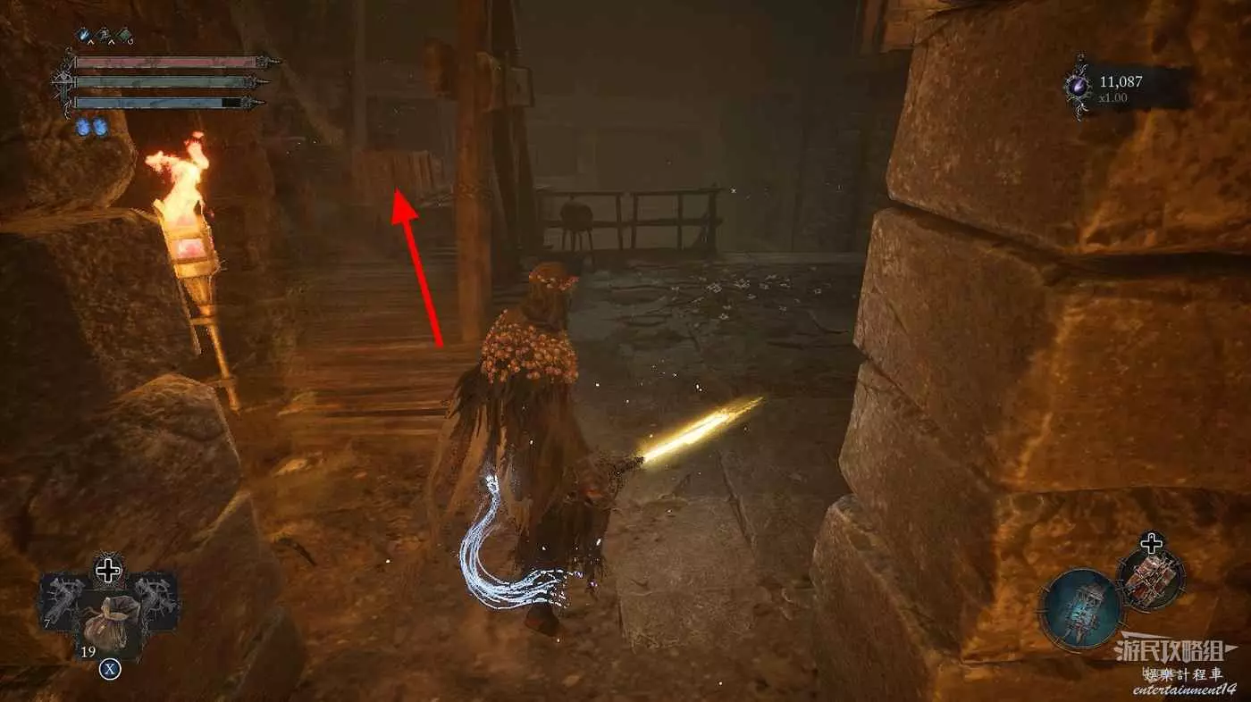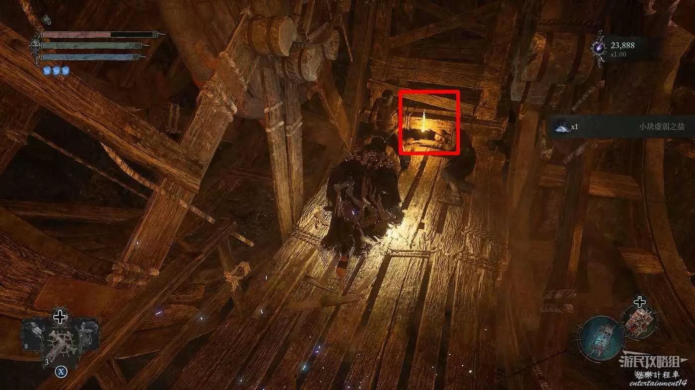 在平臺角落裡可以拿到一個精力,道具前的木板會塌陷導致我們掉落至下層,但是和從右側的山洞走沒有區別。