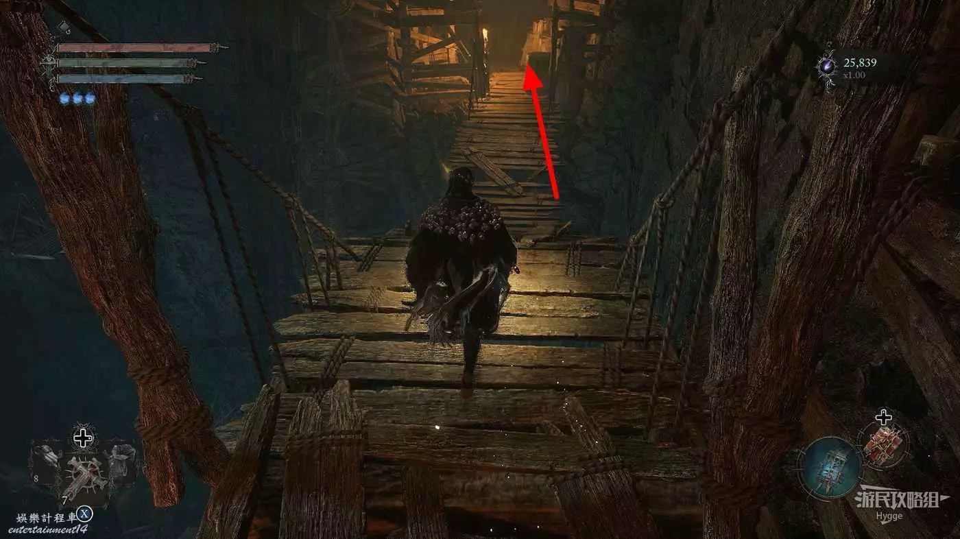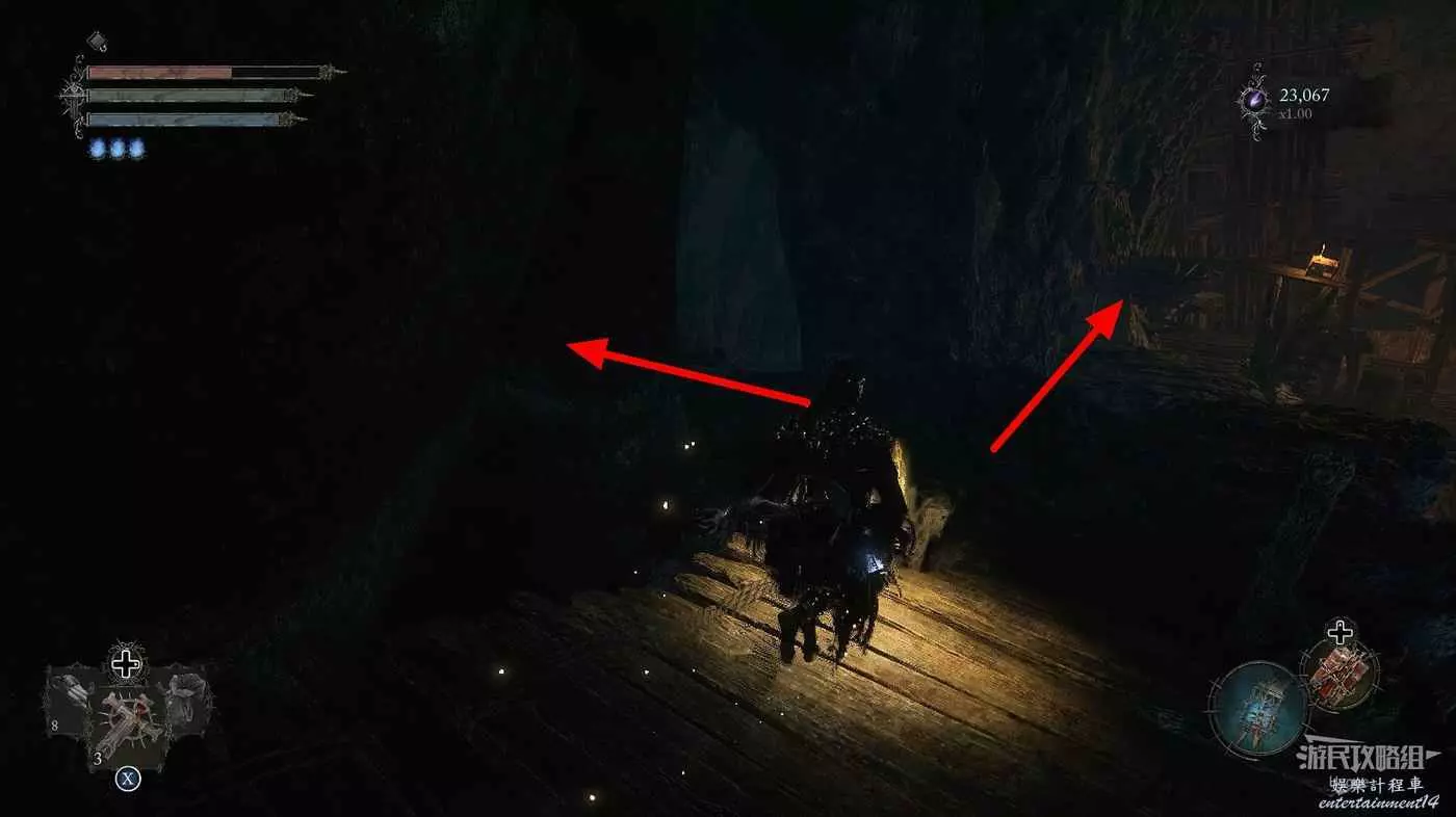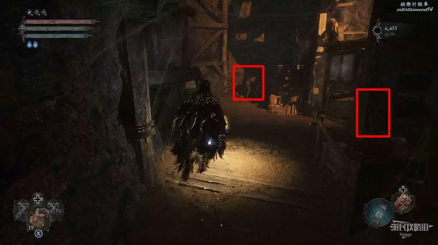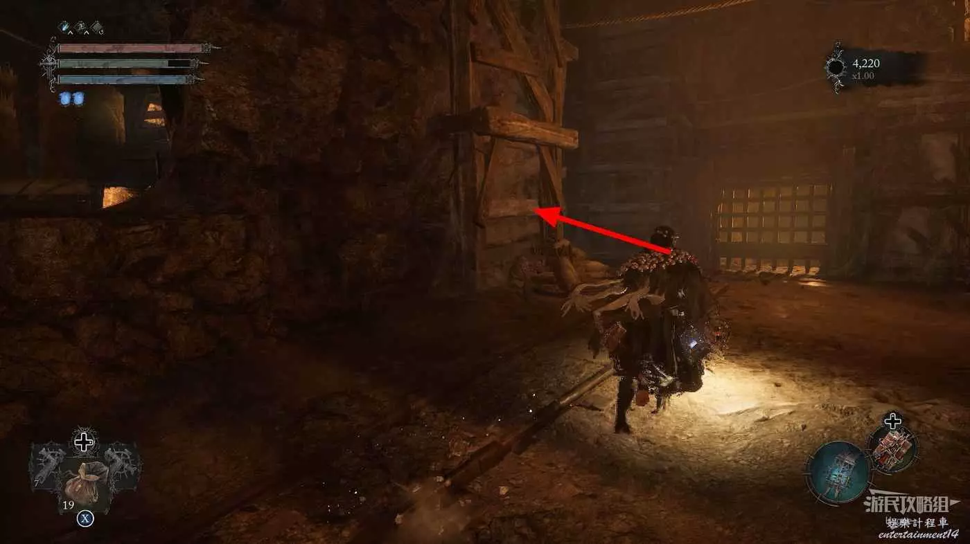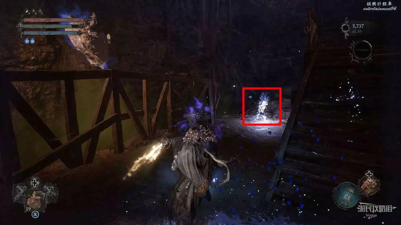 在平臺角落裡可以拿到一個精力,道具前的木板會塌陷導致我們掉落至下層,但是和從右側的山洞走沒有區別。
