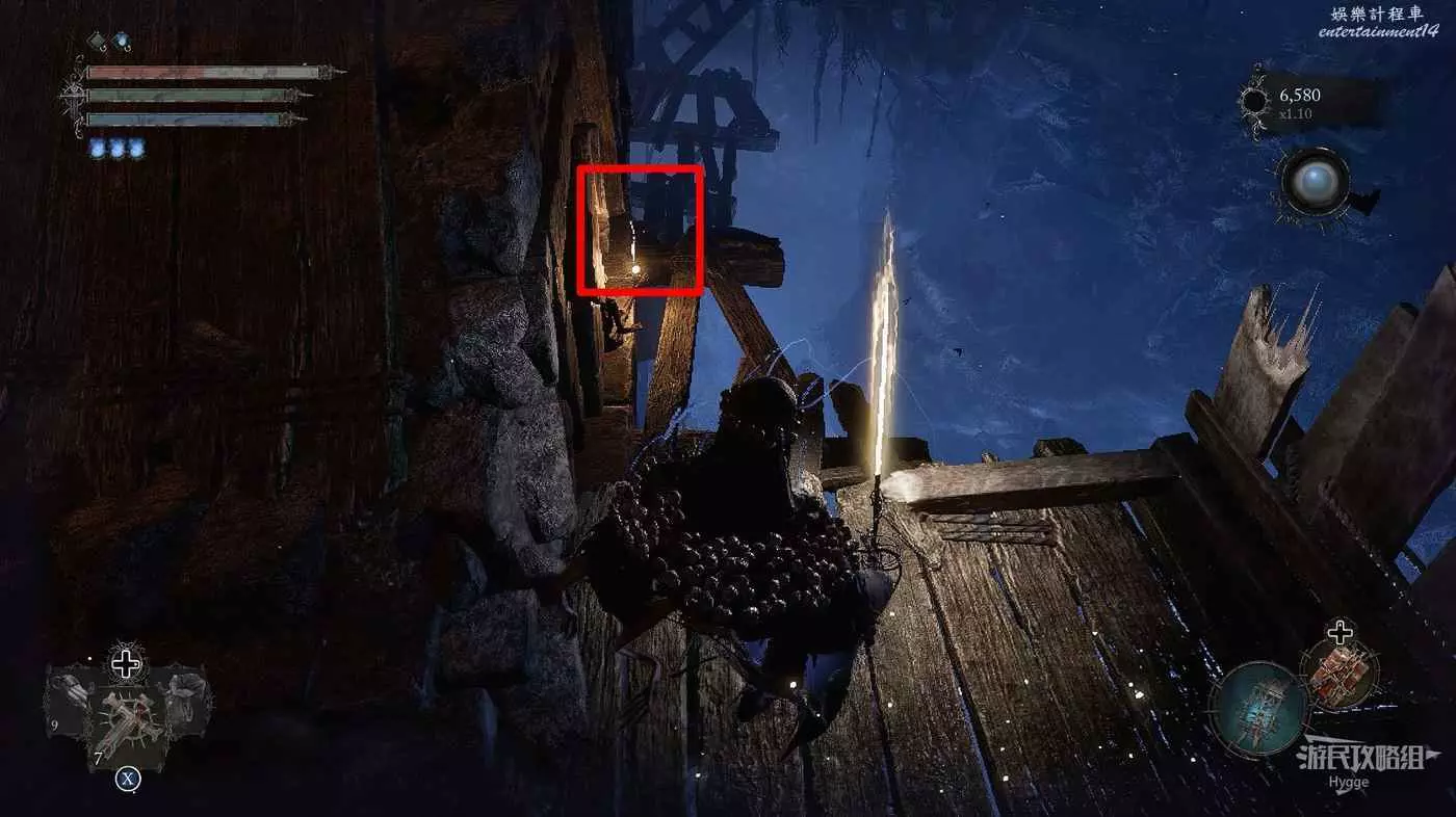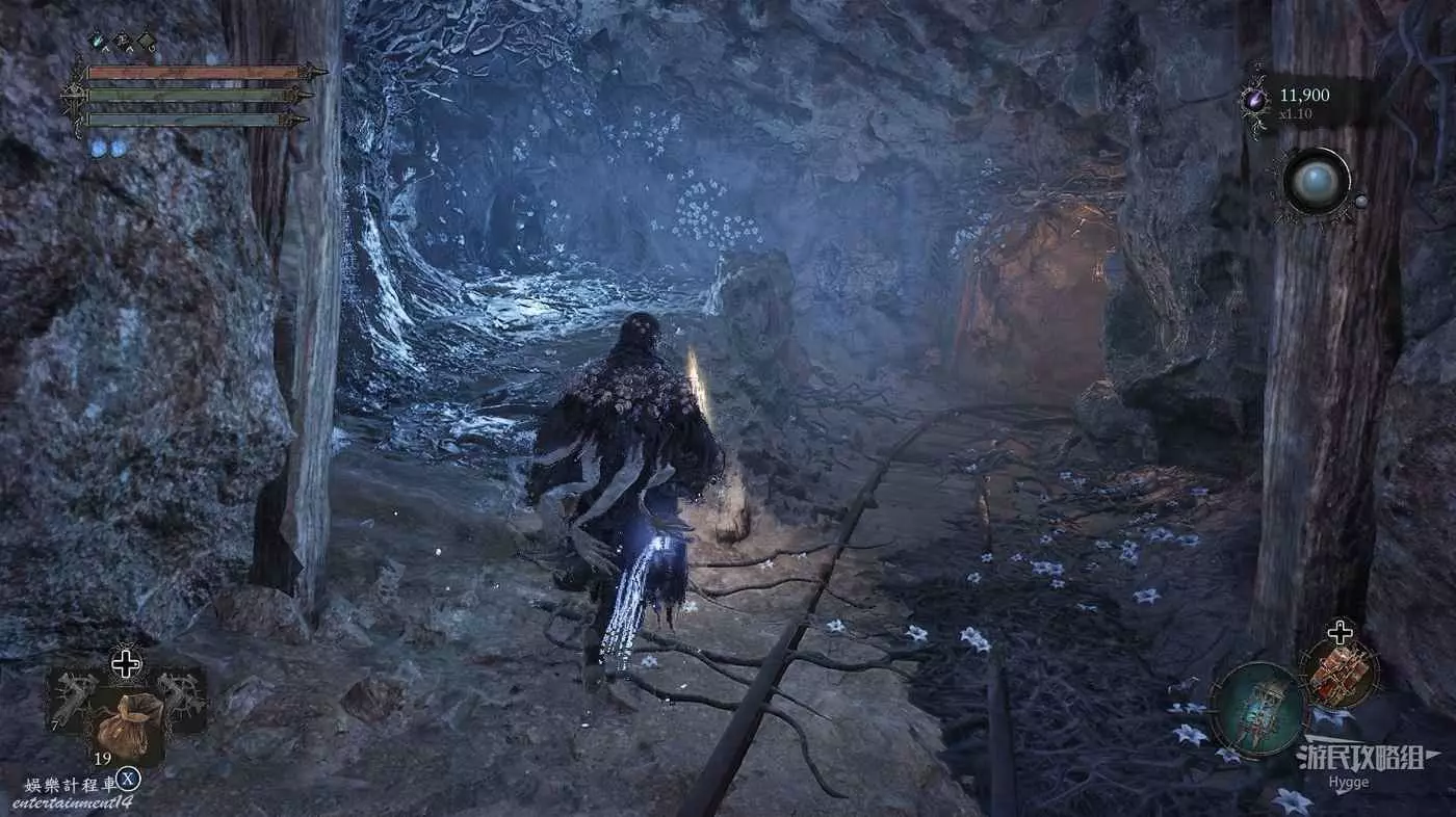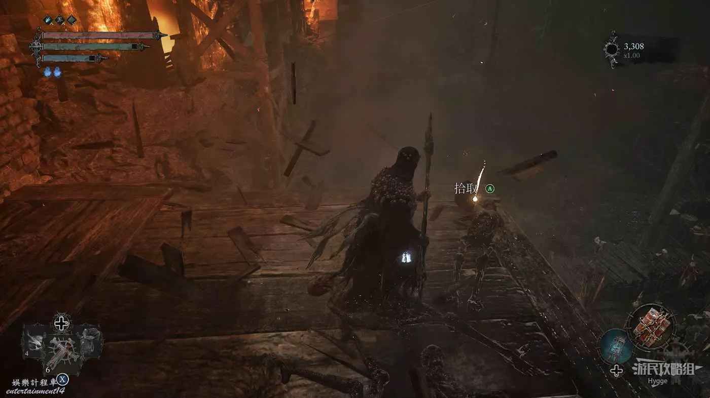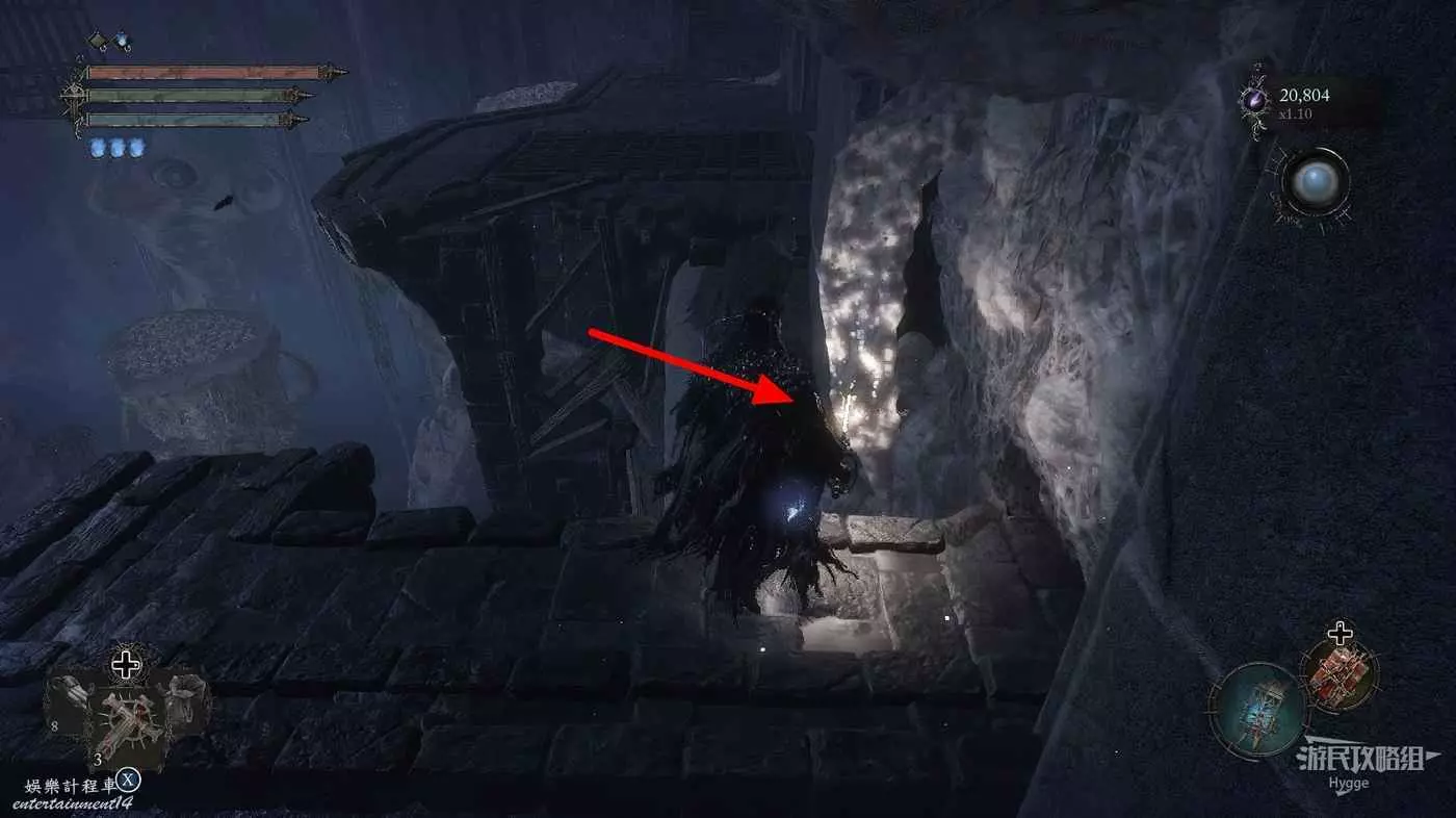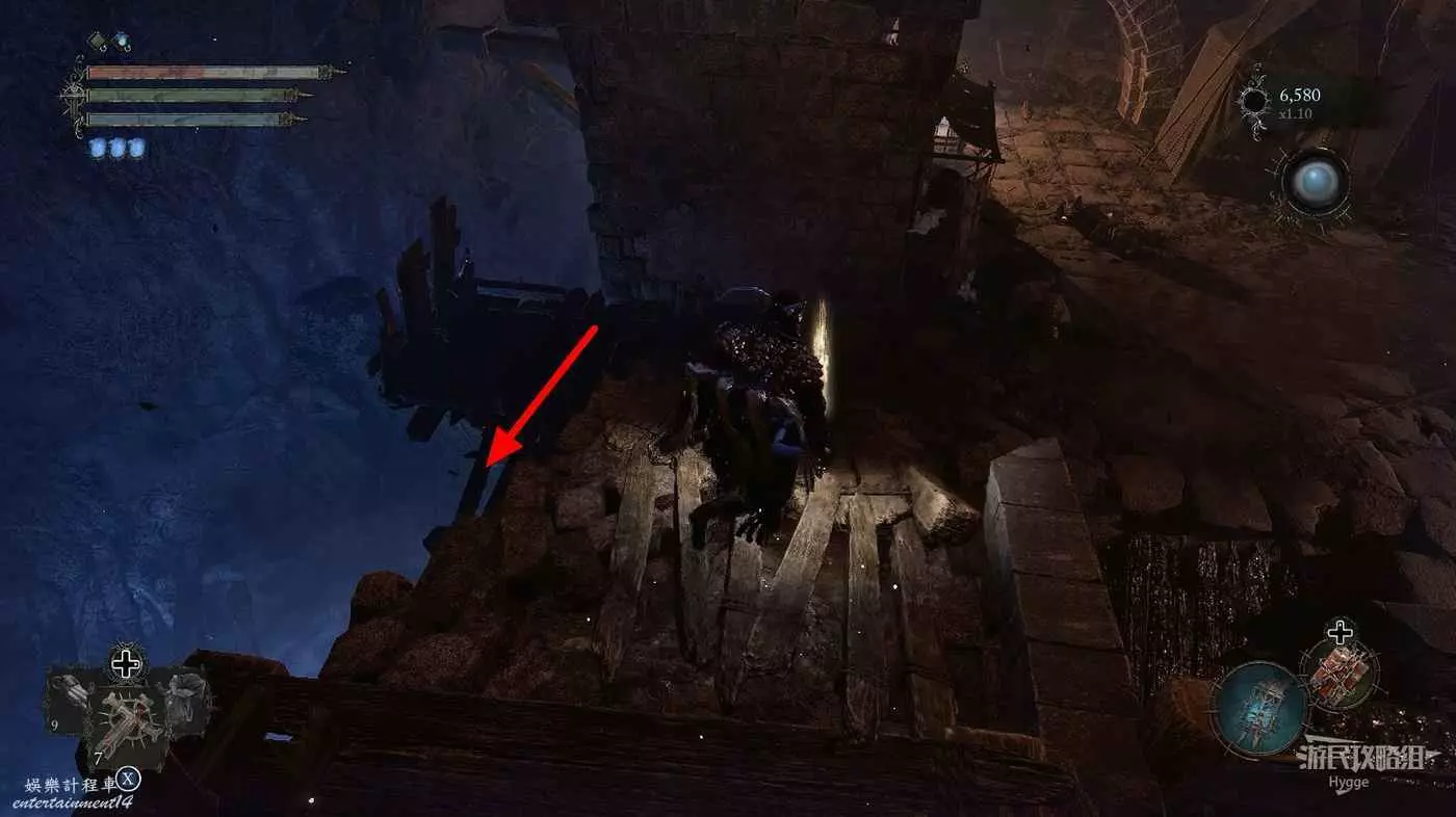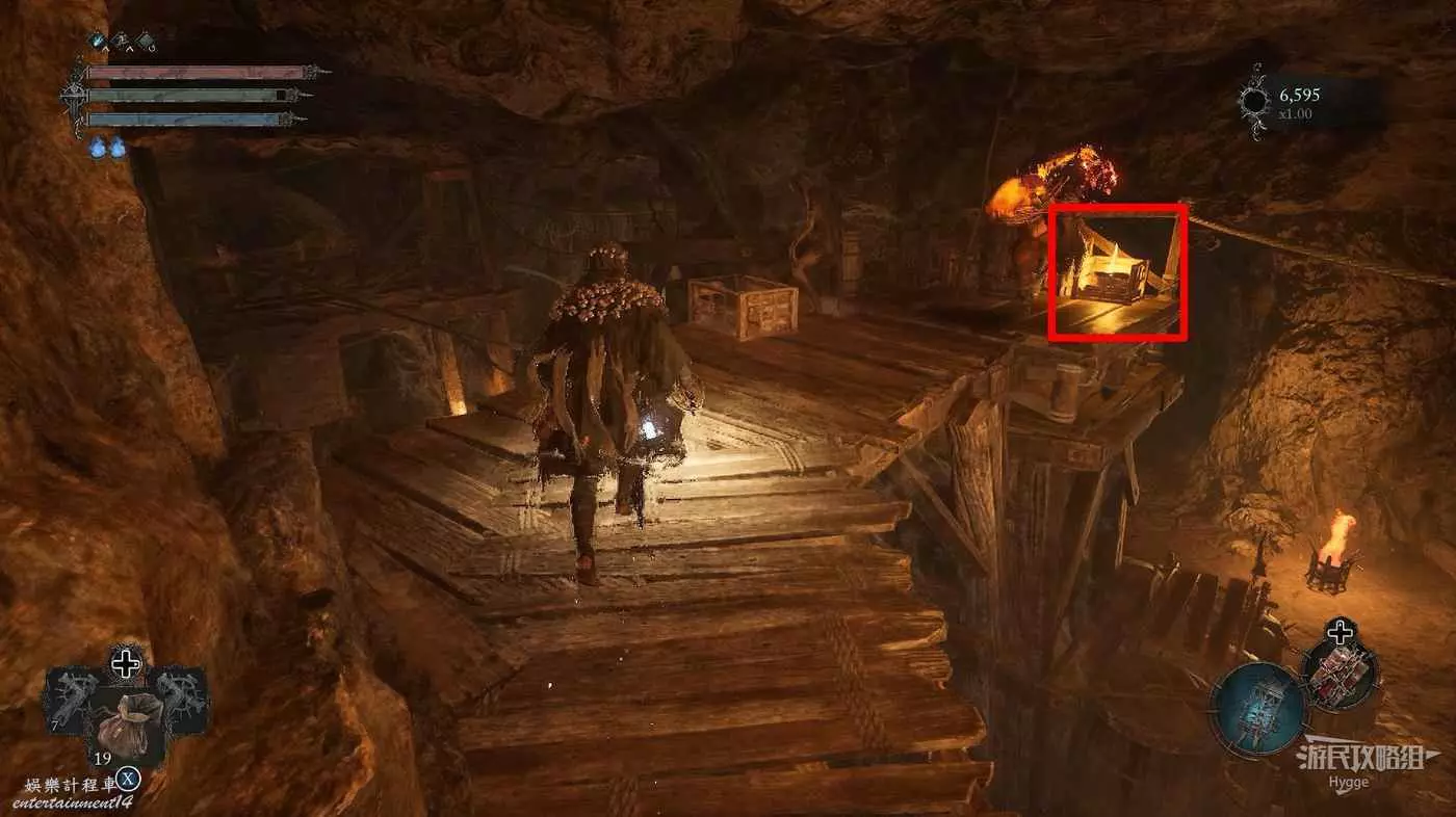 在平臺角落裡可以拿到一個精力,道具前的木板會塌陷導致我們掉落至下層,但是和從右側的山洞走沒有區別。
