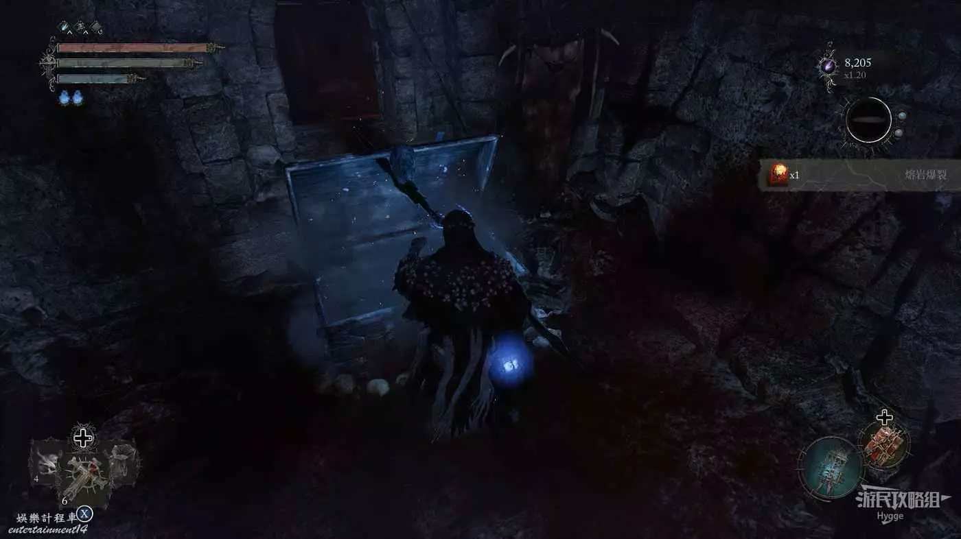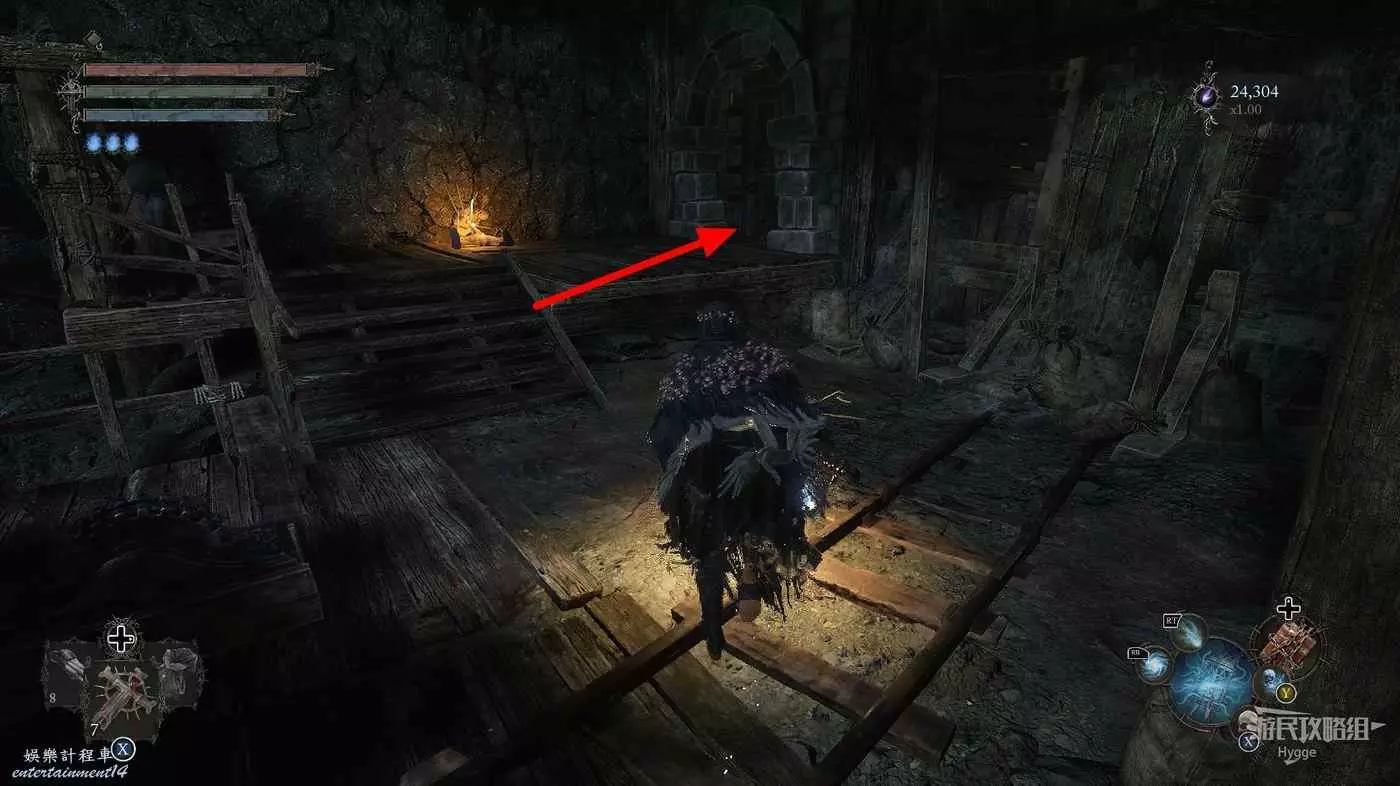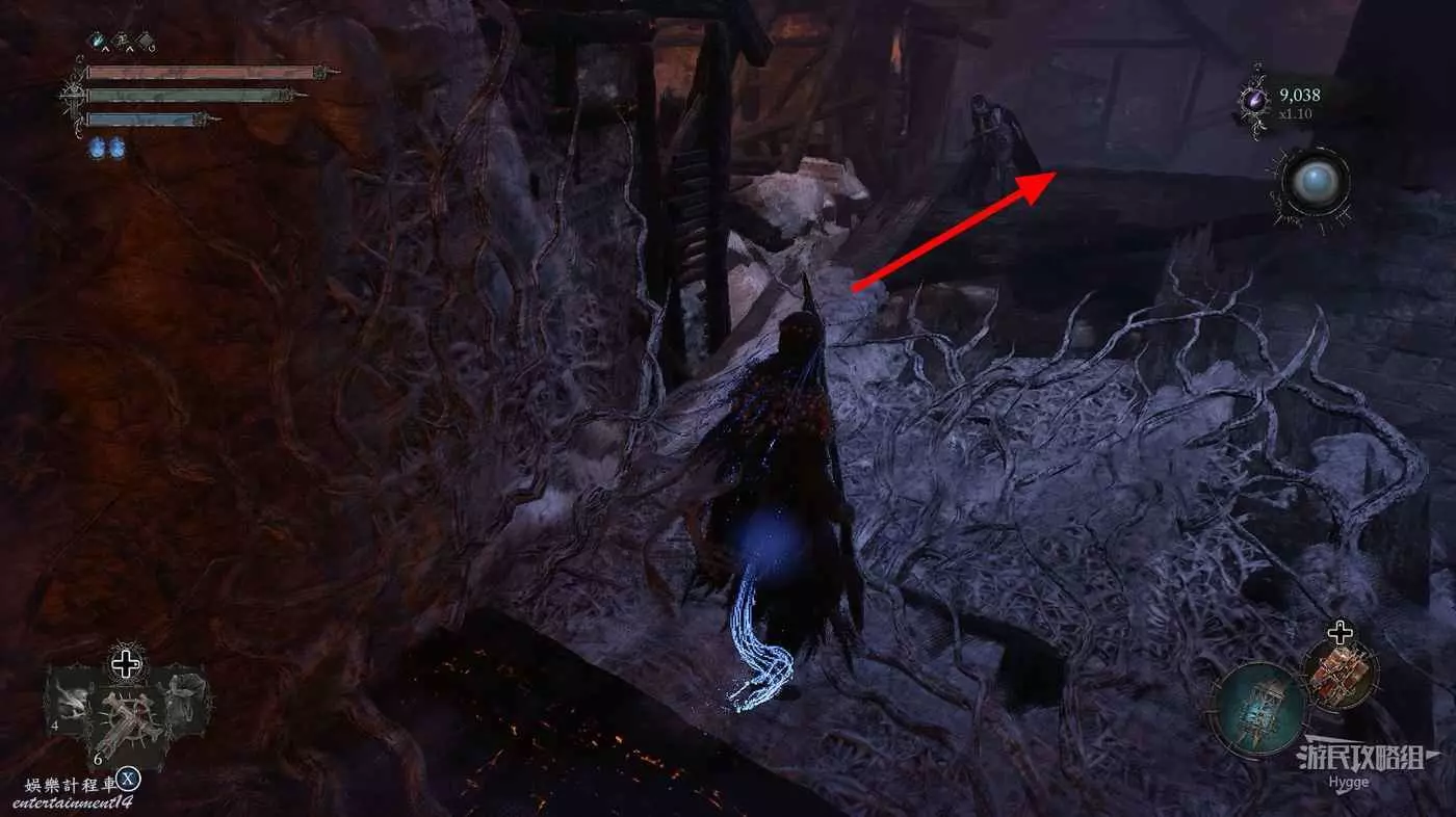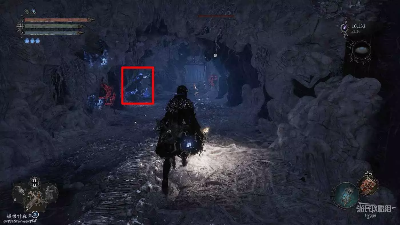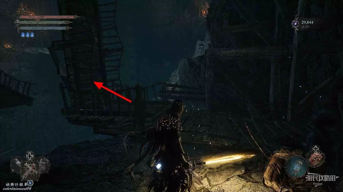 在平臺角落裡可以拿到一個精力,道具前的木板會塌陷導致我們掉落至下層,但是和從右側的山洞走沒有區別。