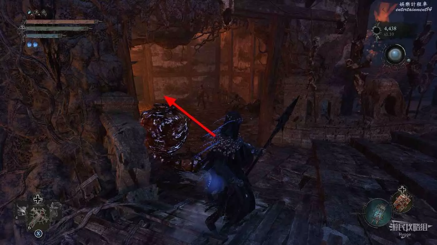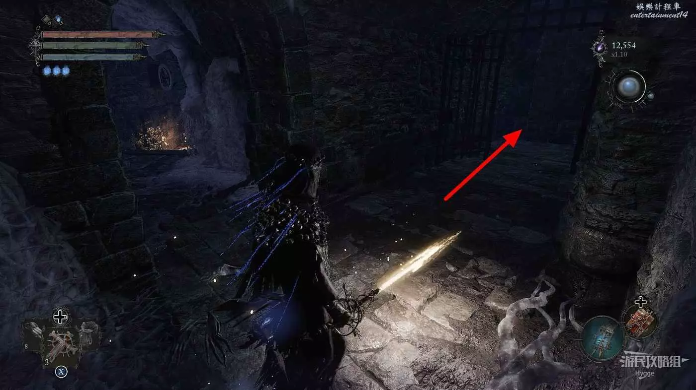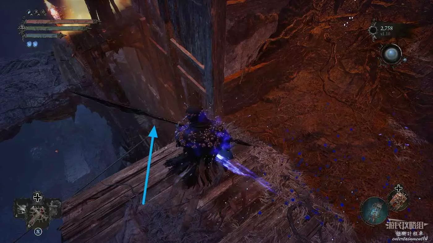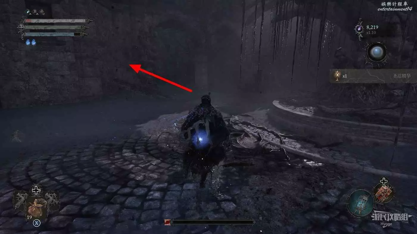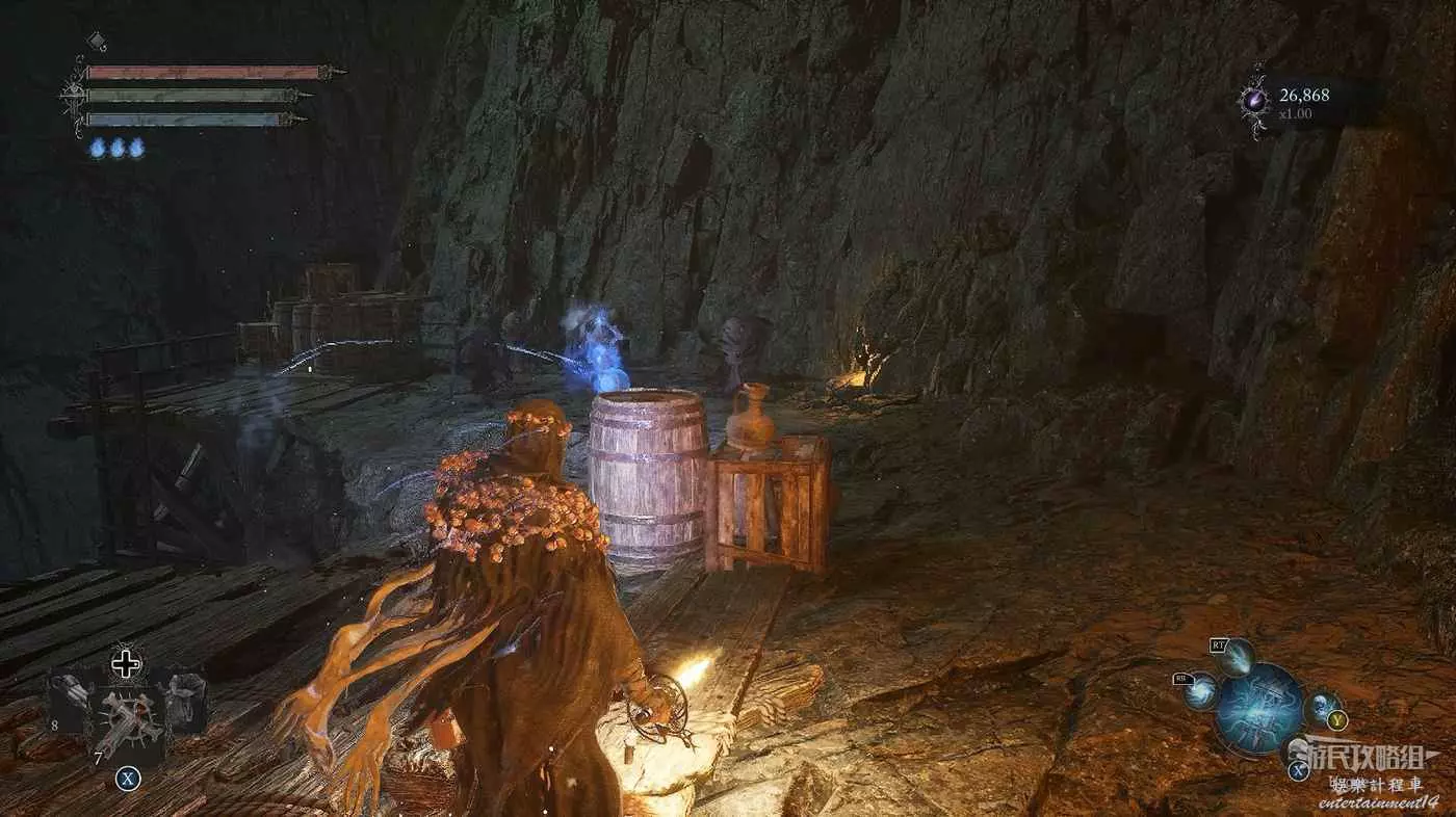 在平臺角落裡可以拿到一個精力,道具前的木板會塌陷導致我們掉落至下層,但是和從右側的山洞走沒有區別。