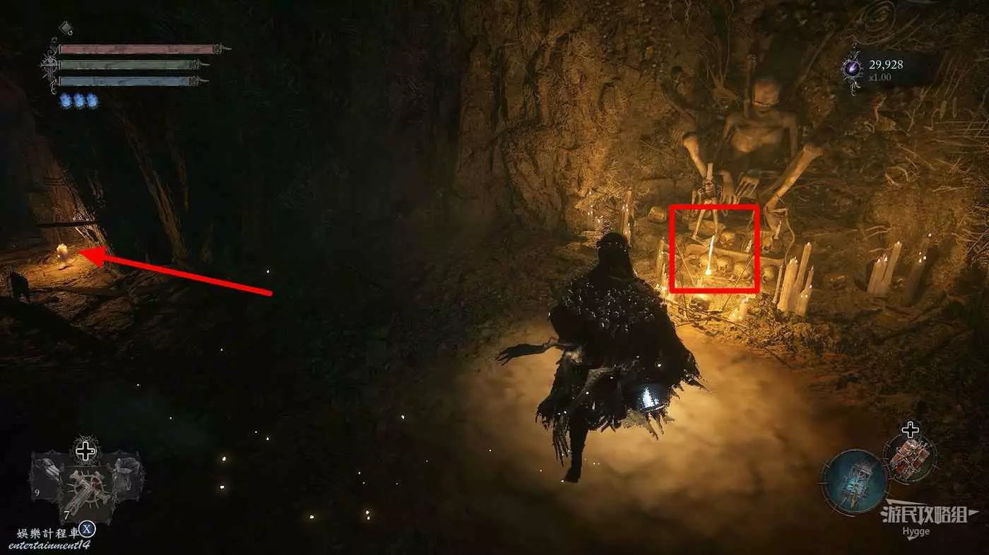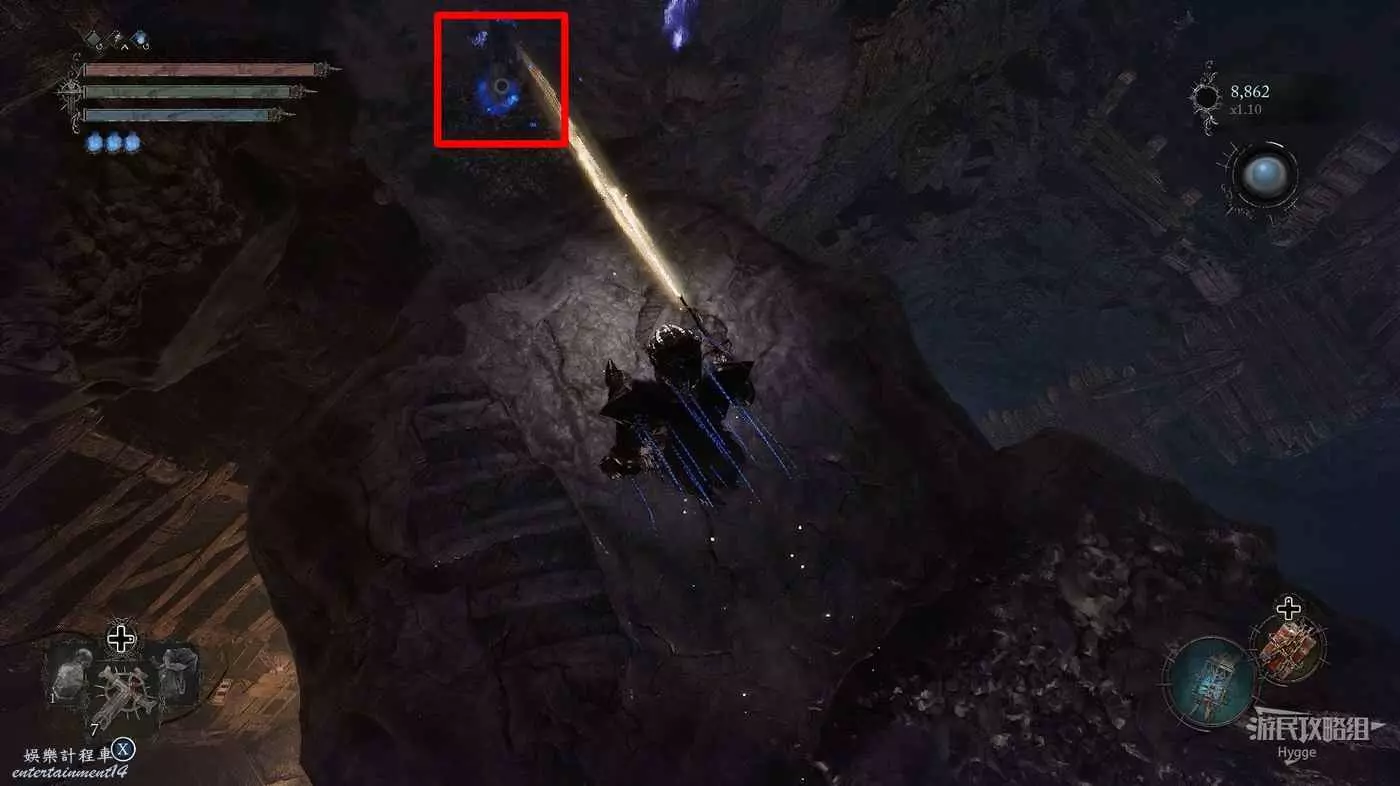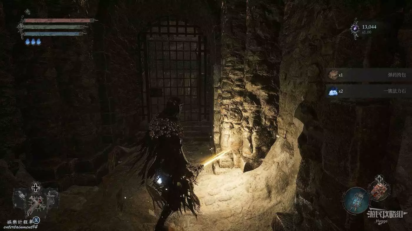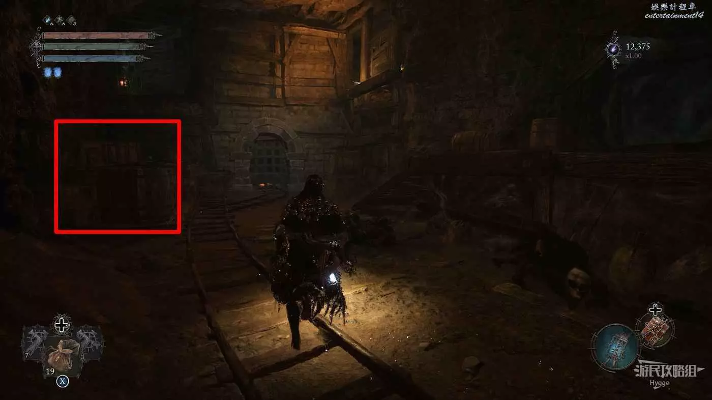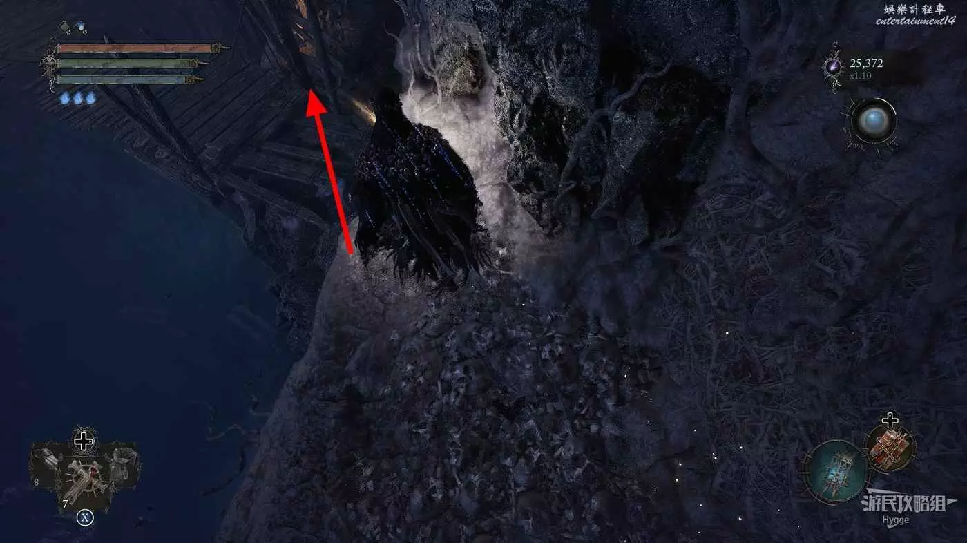 在平臺角落裡可以拿到一個精力,道具前的木板會塌陷導致我們掉落至下層,但是和從右側的山洞走沒有區別。