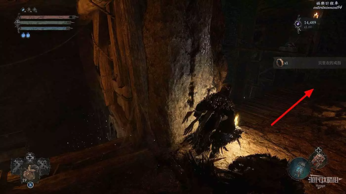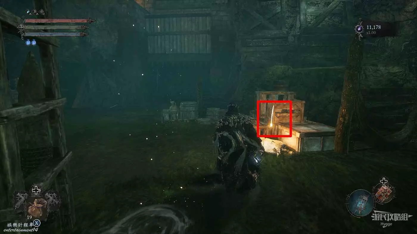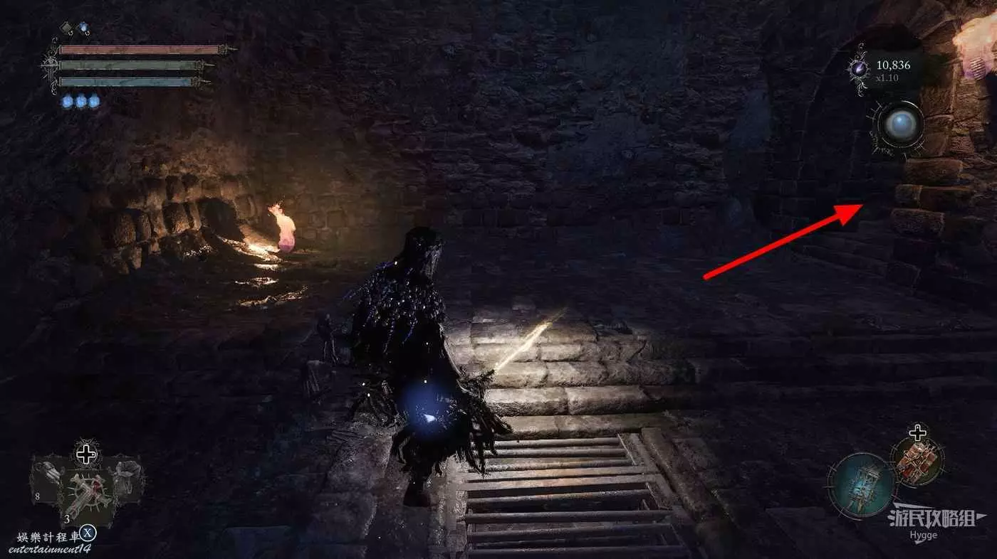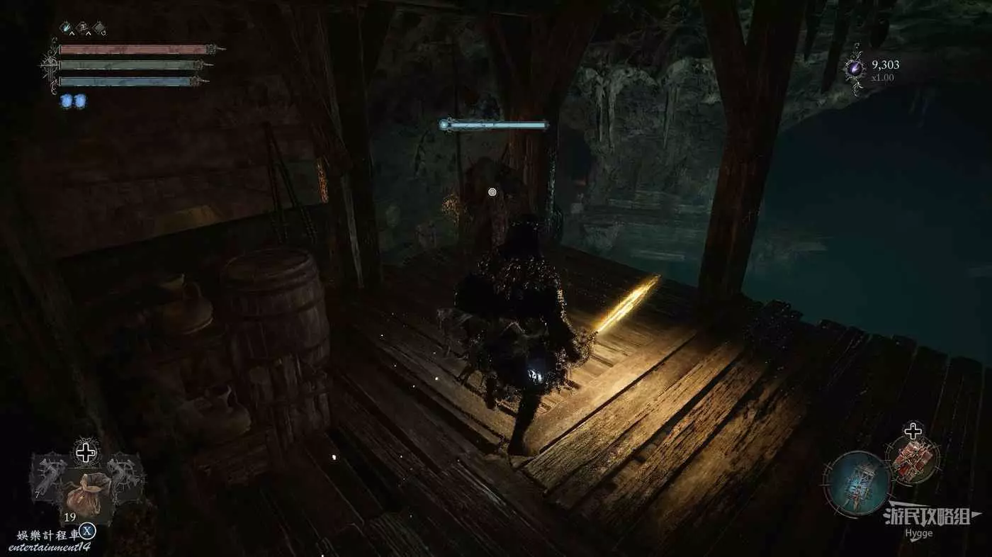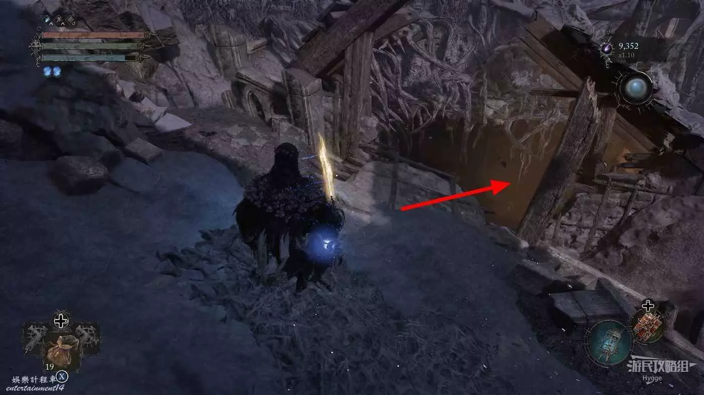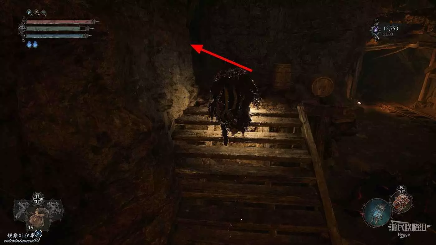 在平臺角落裡可以拿到一個精力,道具前的木板會塌陷導致我們掉落至下層,但是和從右側的山洞走沒有區別。