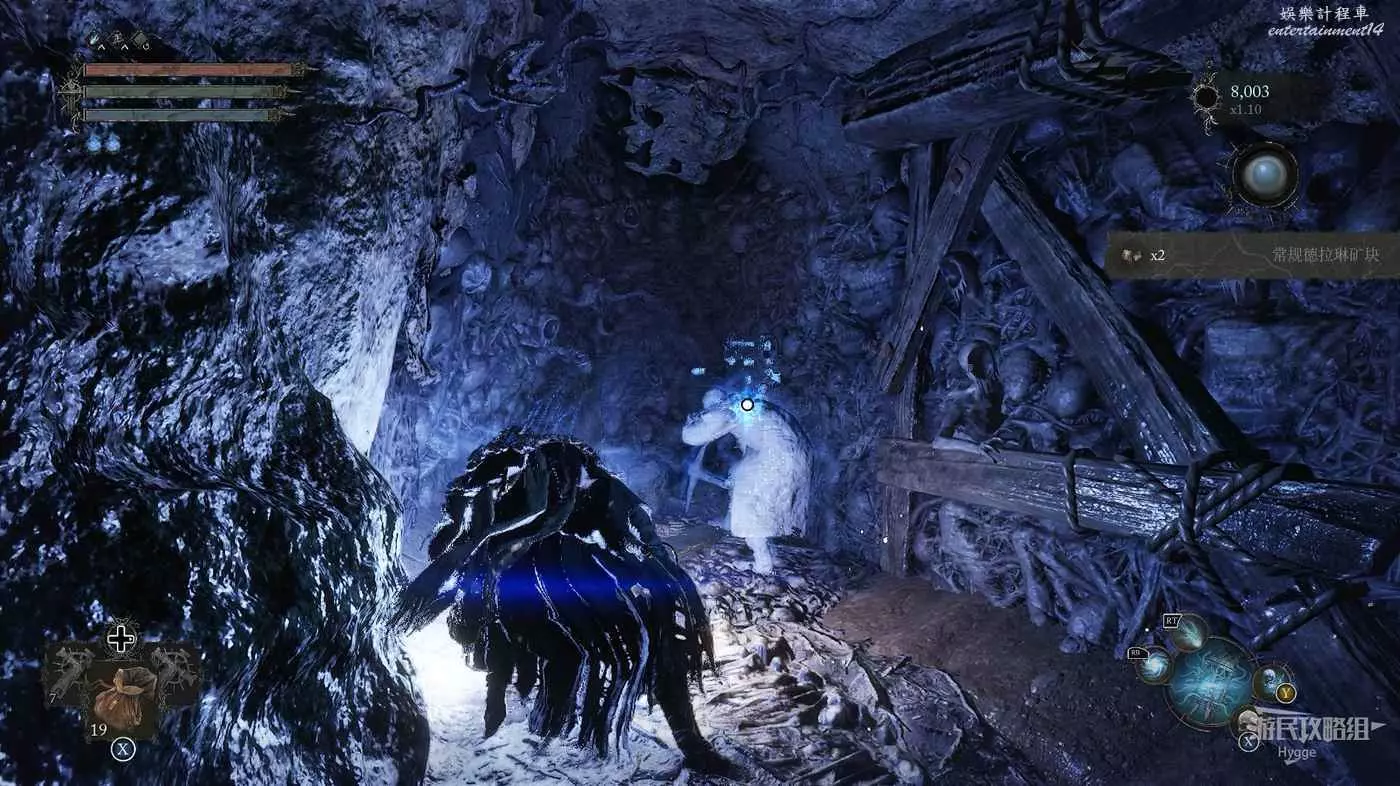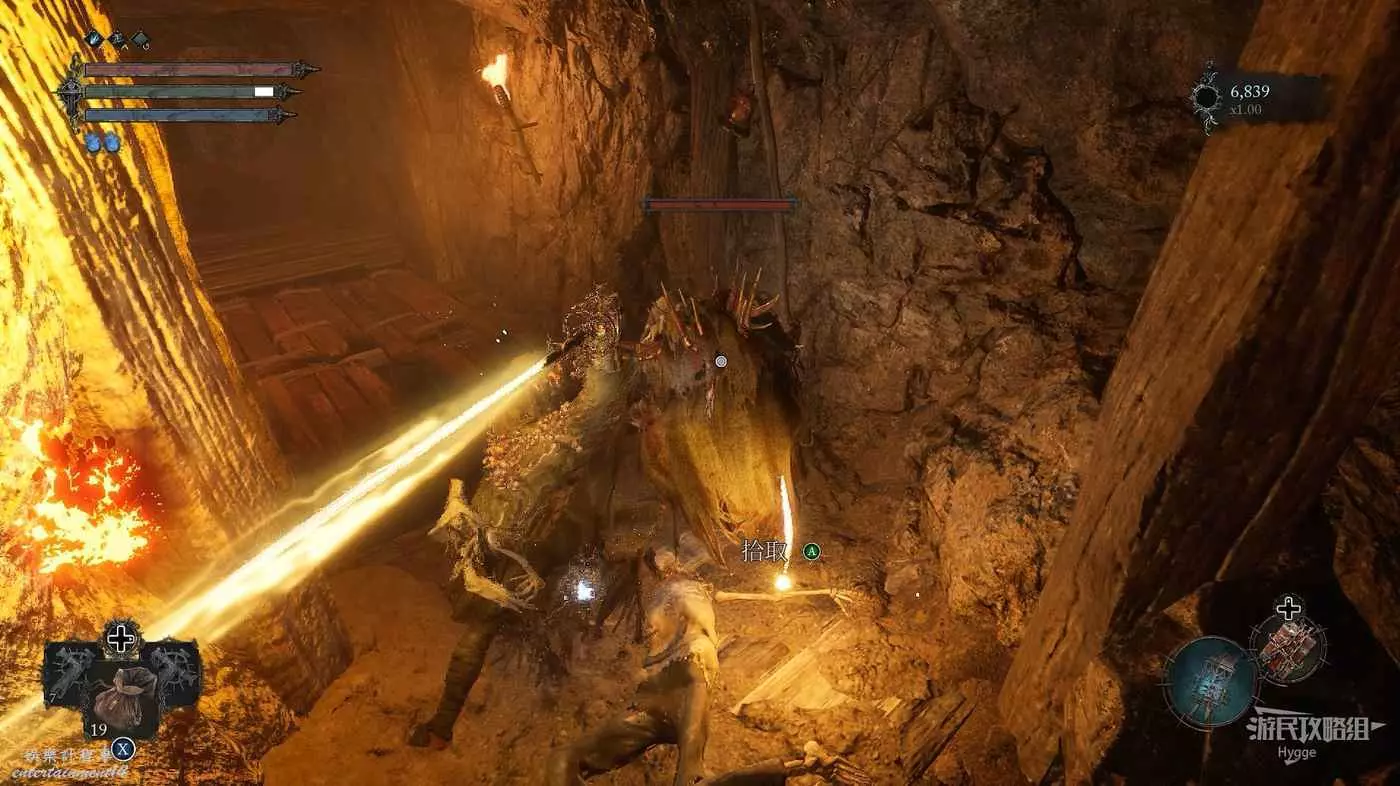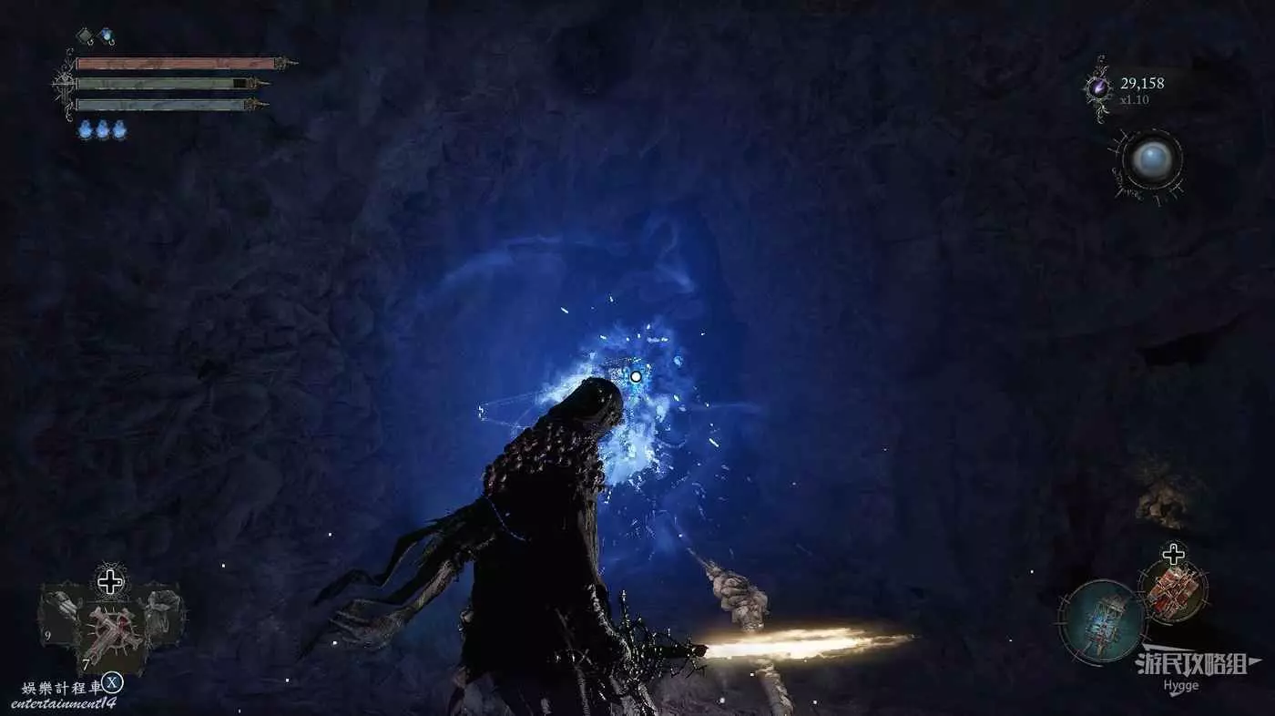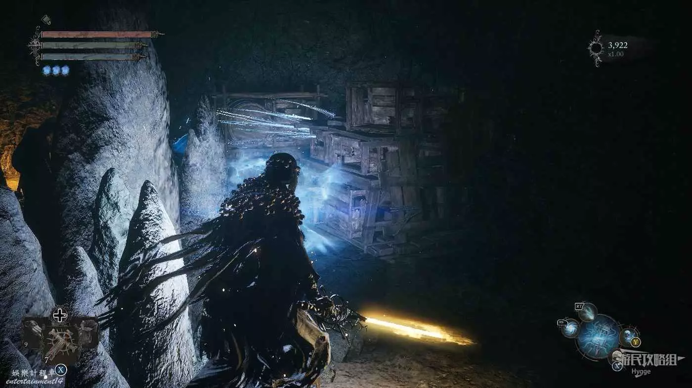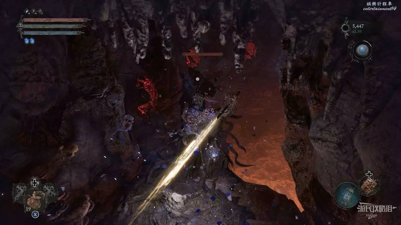 在平臺角落裡可以拿到一個精力,道具前的木板會塌陷導致我們掉落至下層,但是和從右側的山洞走沒有區別。