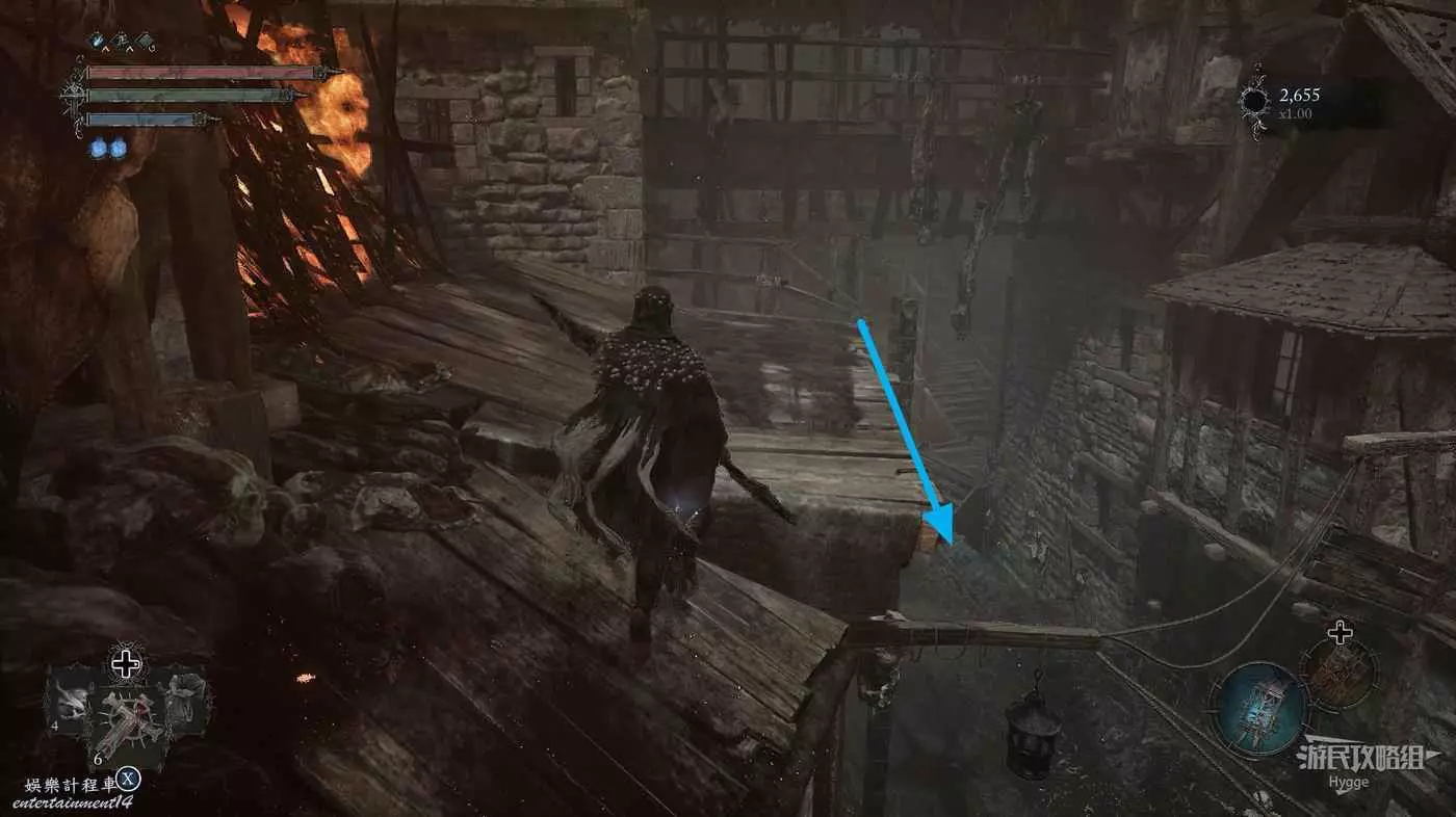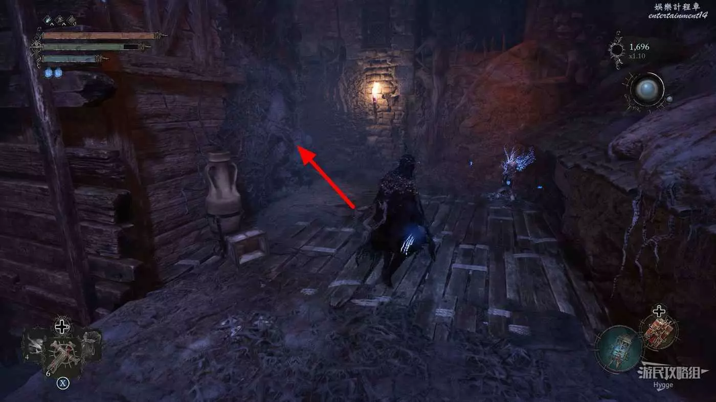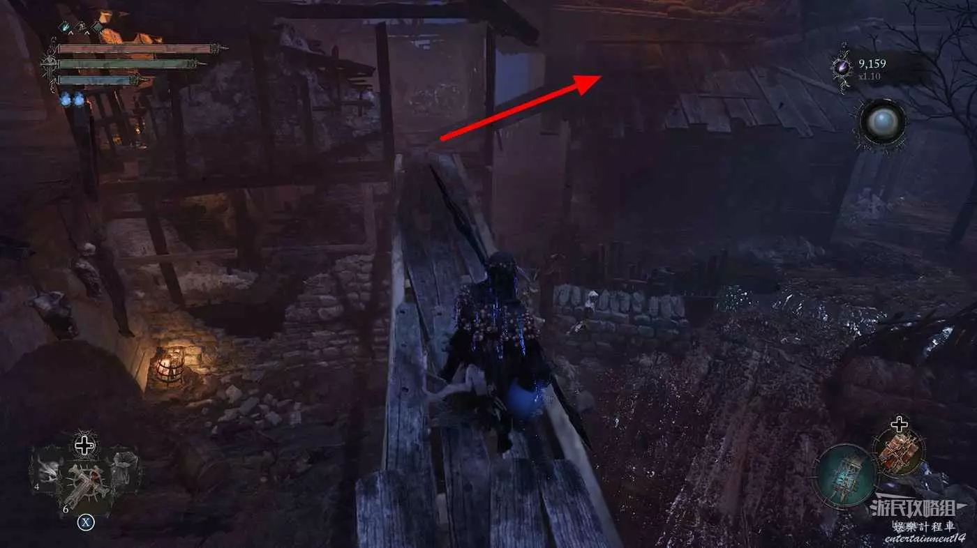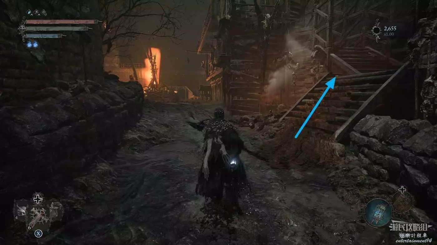 來到上層不用往右走,直接進入左側的塔樓。穿過小屋在道路前方的屍體上可以拿到一些道具。