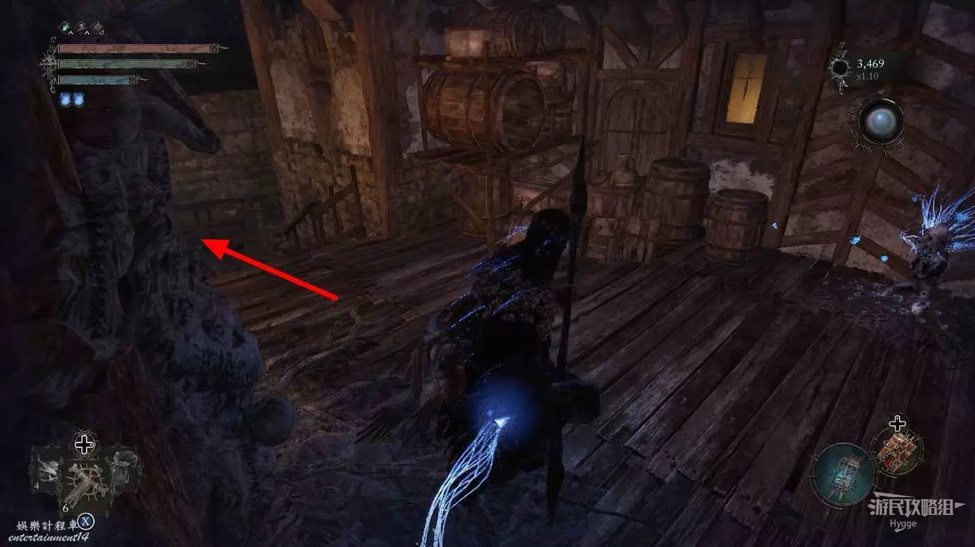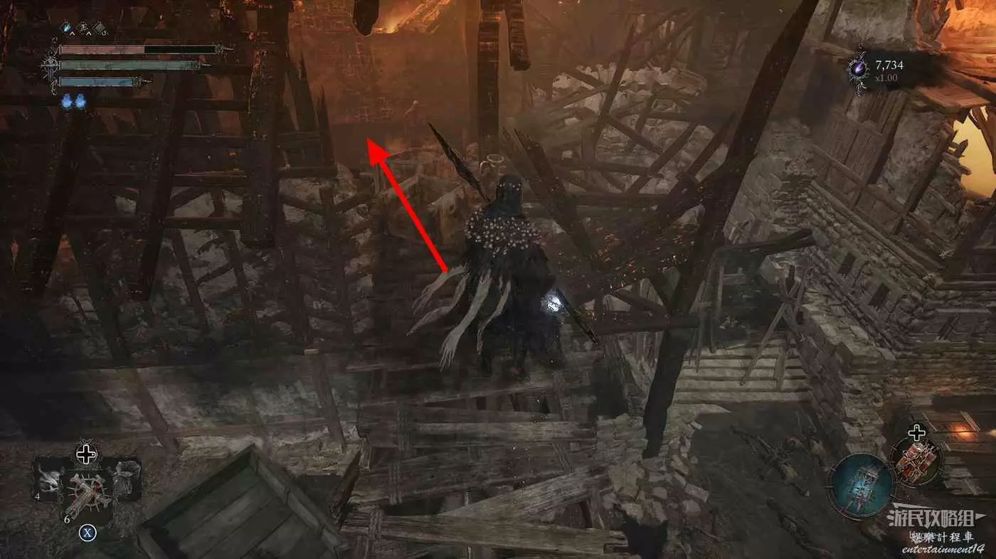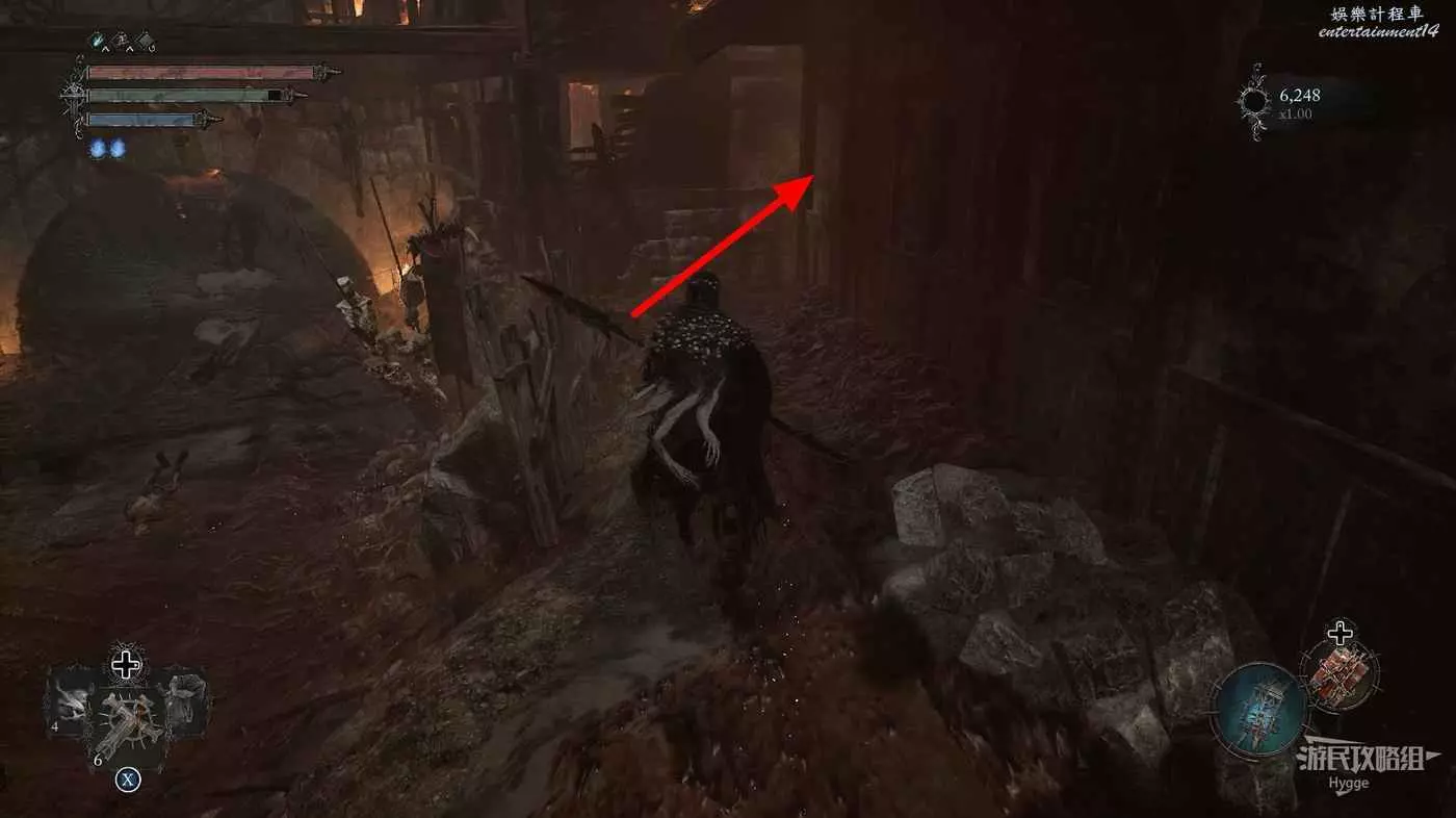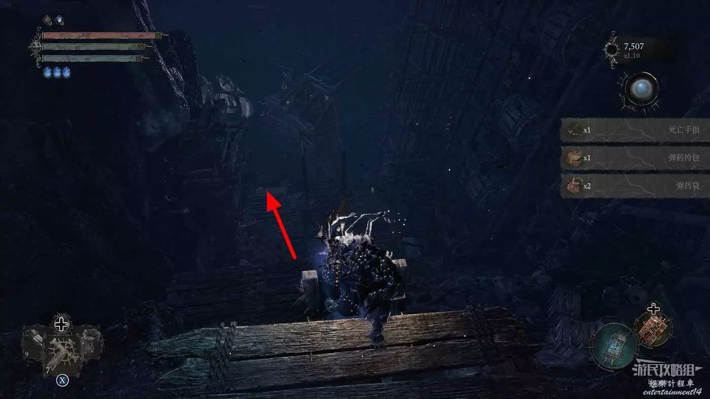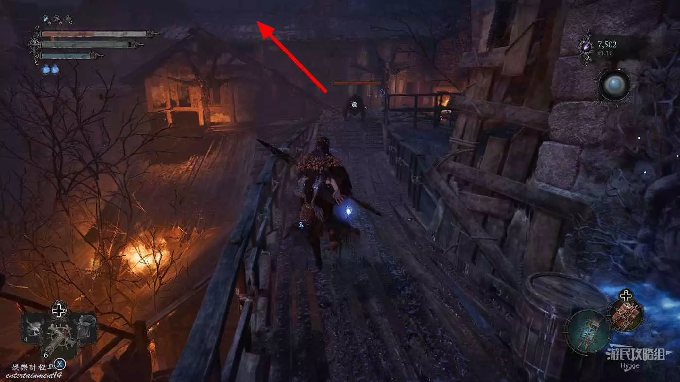 來到上層不用往右走,直接進入左側的塔樓。穿過小屋在道路前方的屍體上可以拿到一些道具。