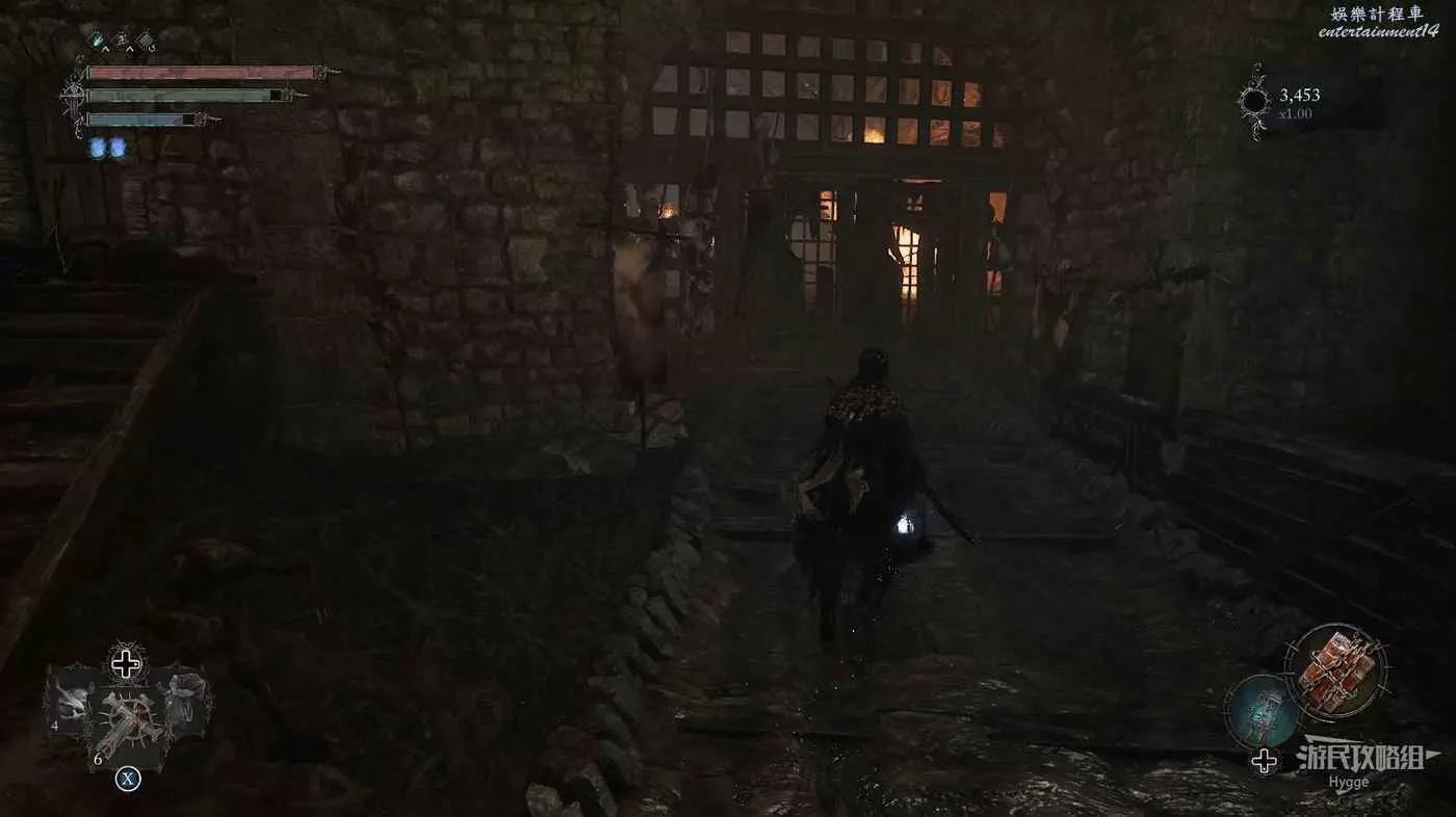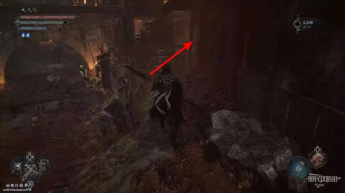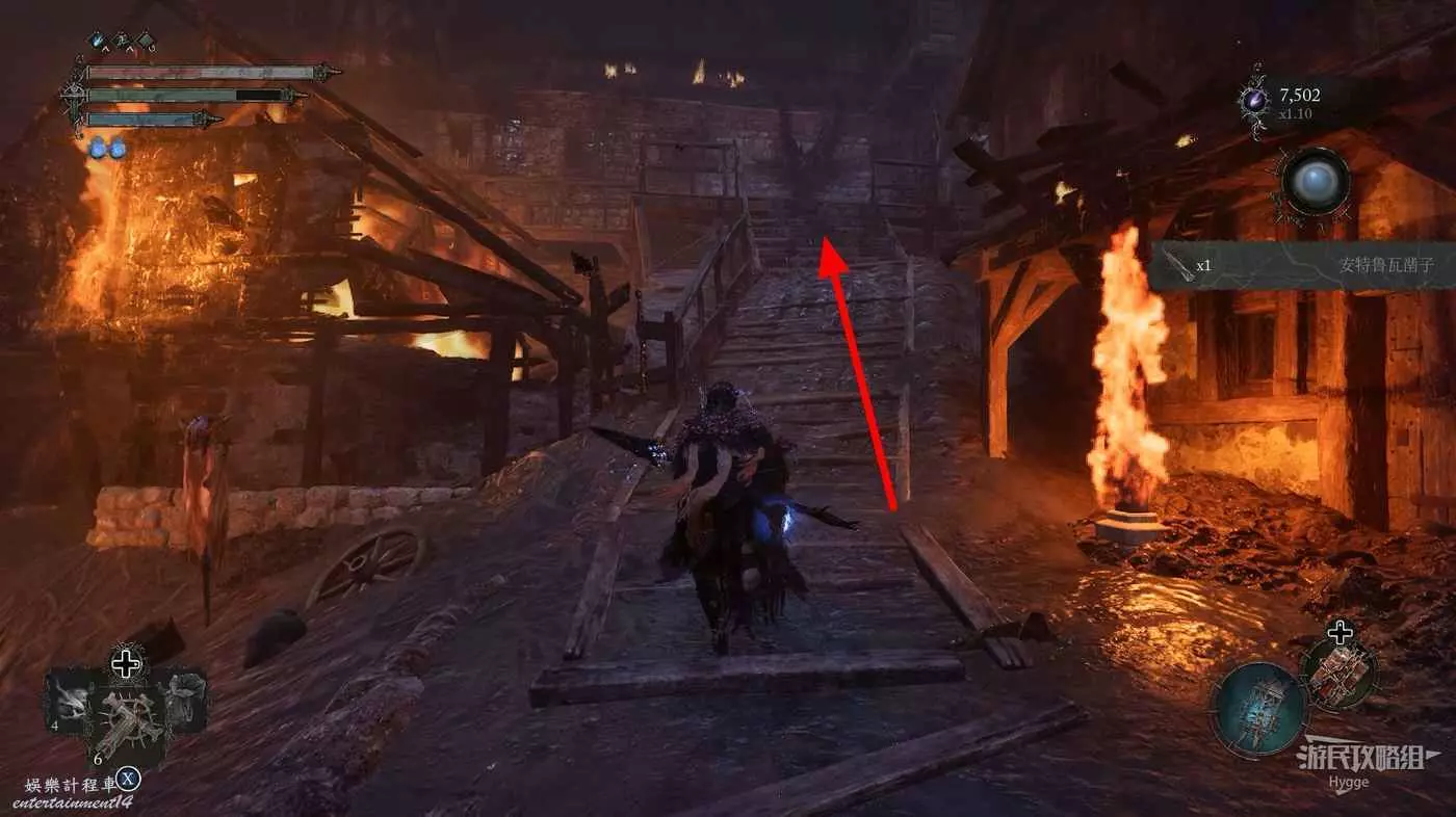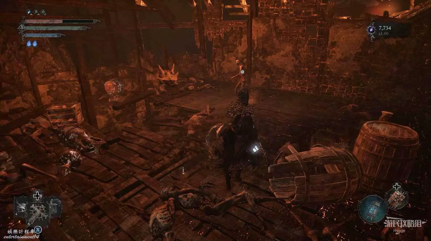 來到上層不用往右走,直接進入左側的塔樓。穿過小屋在道路前方的屍體上可以拿到一些道具。