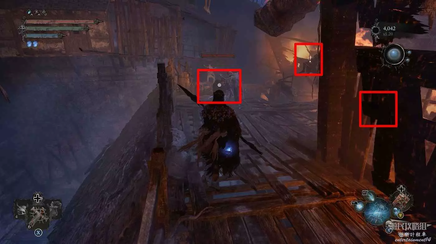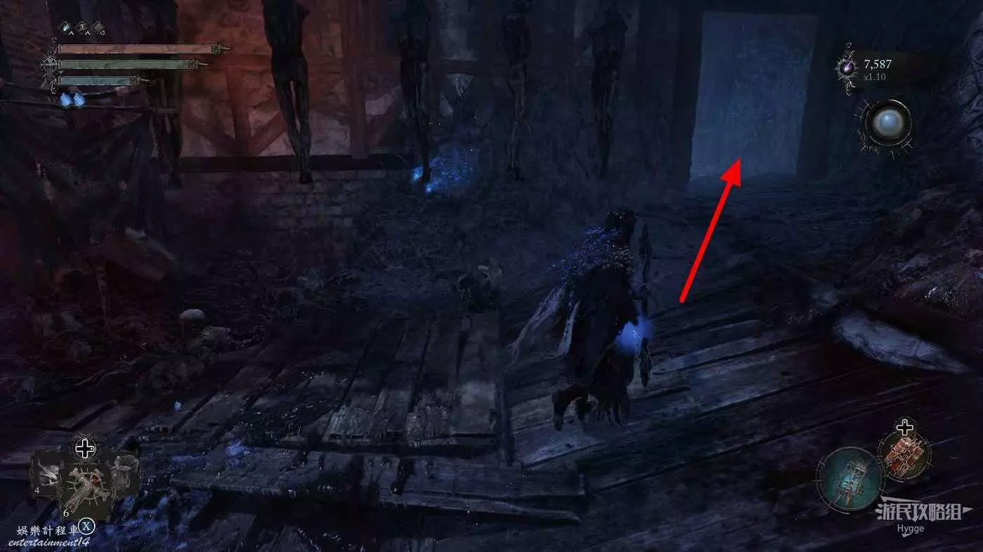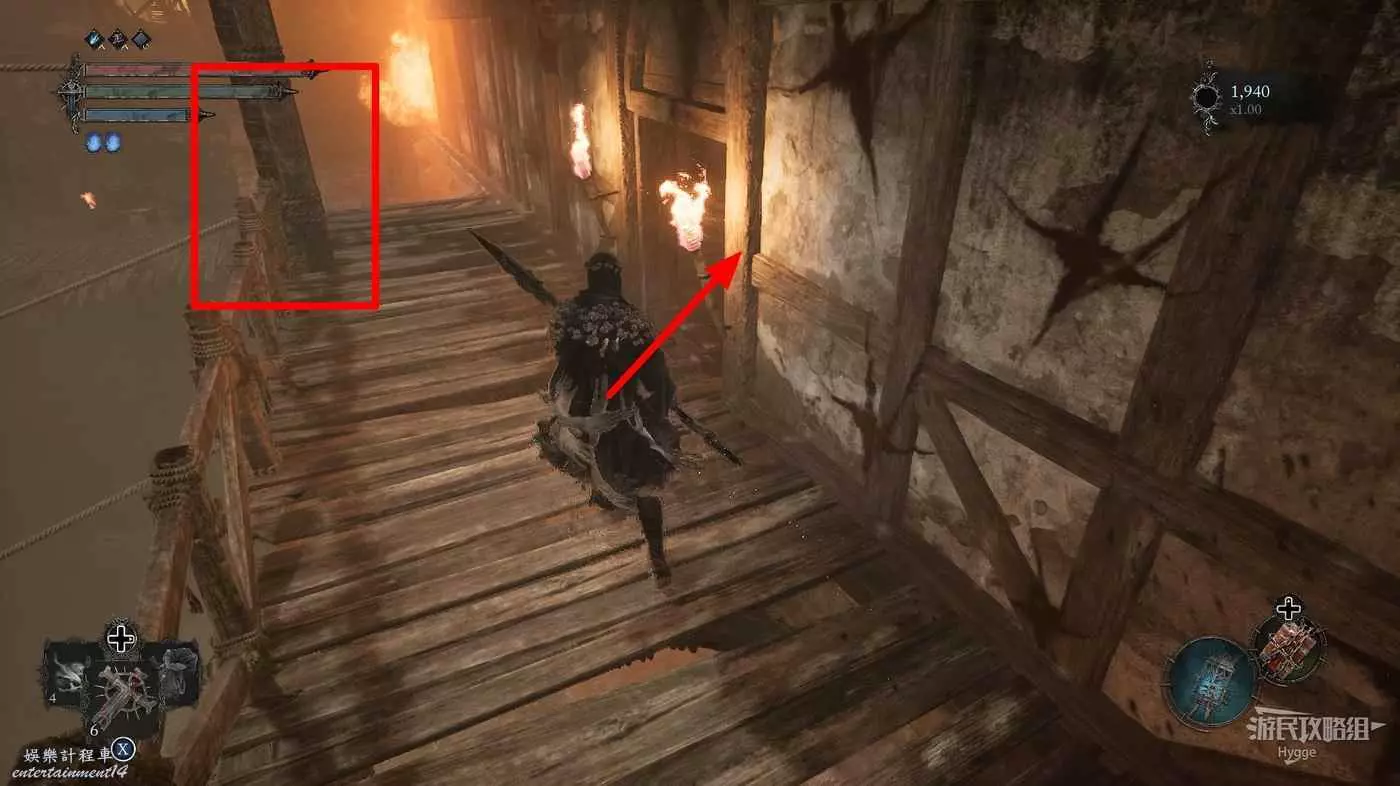 下方房間中的的大門在影界中是不存在的,穿過大門沿著木板平臺前進。