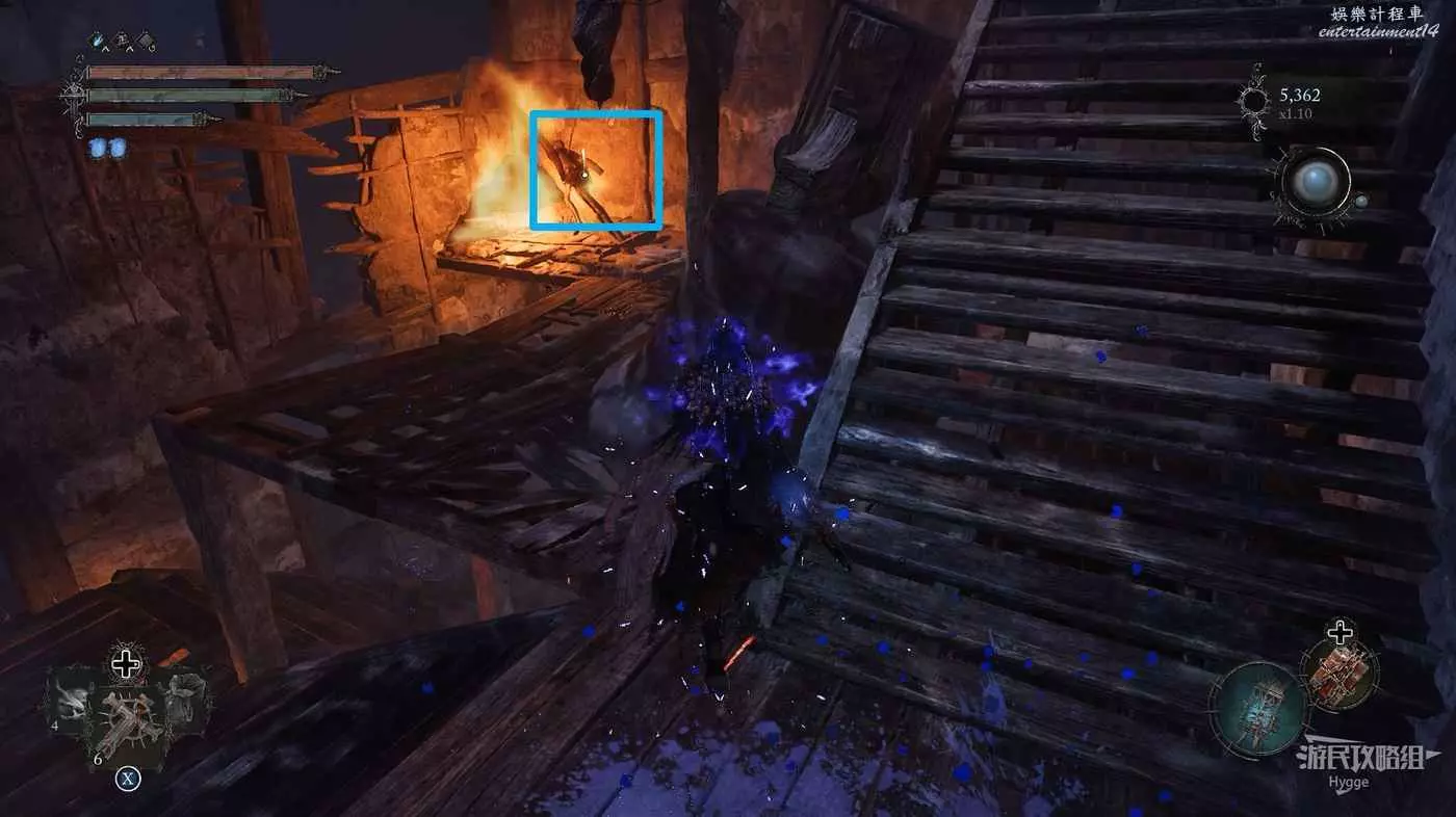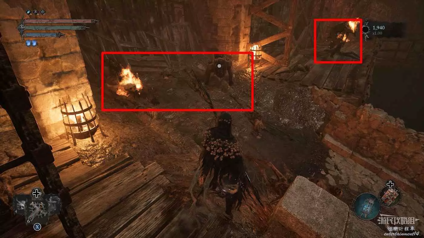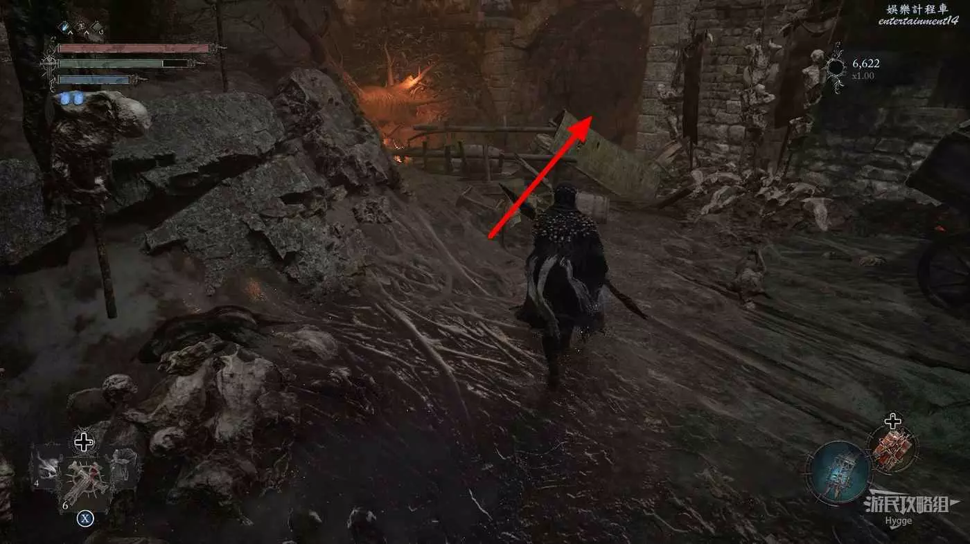 之後通過坡道向上。在篝火旁有一名巫師和很多其他敵人,不用管他們直接走就行。