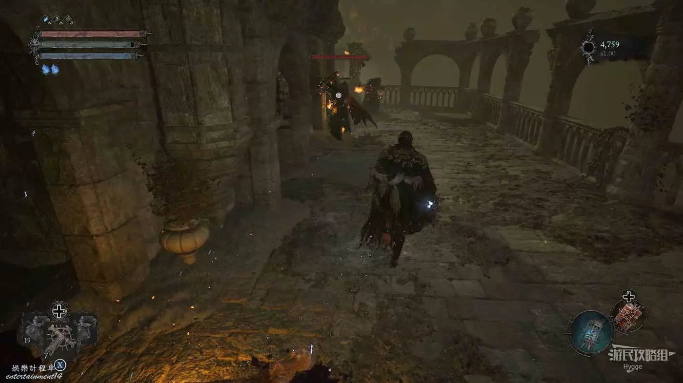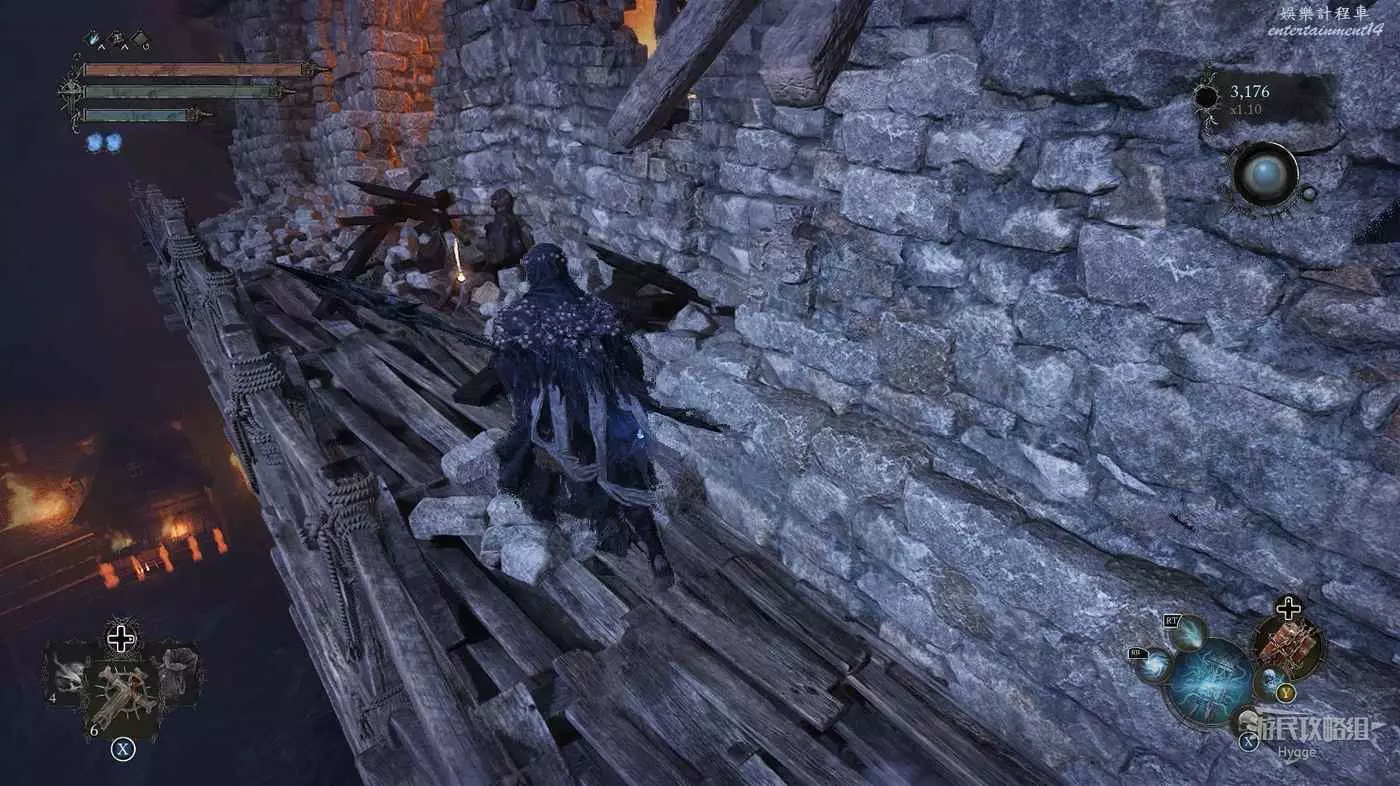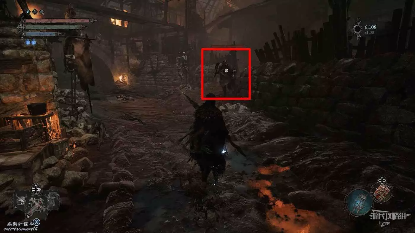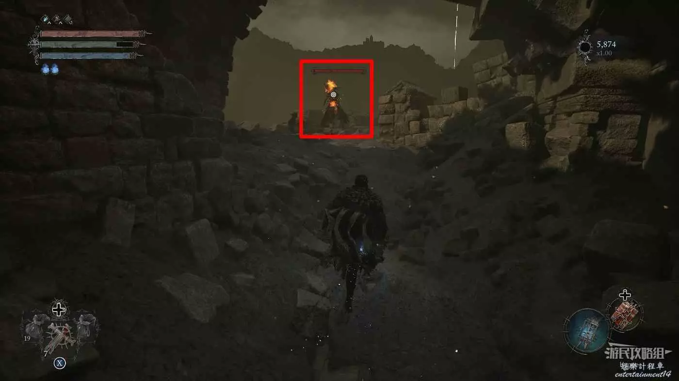 之後通過坡道向上。在篝火旁有一名巫師和很多其他敵人,不用管他們直接走就行。