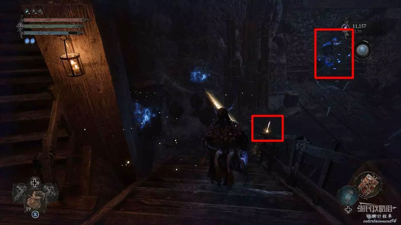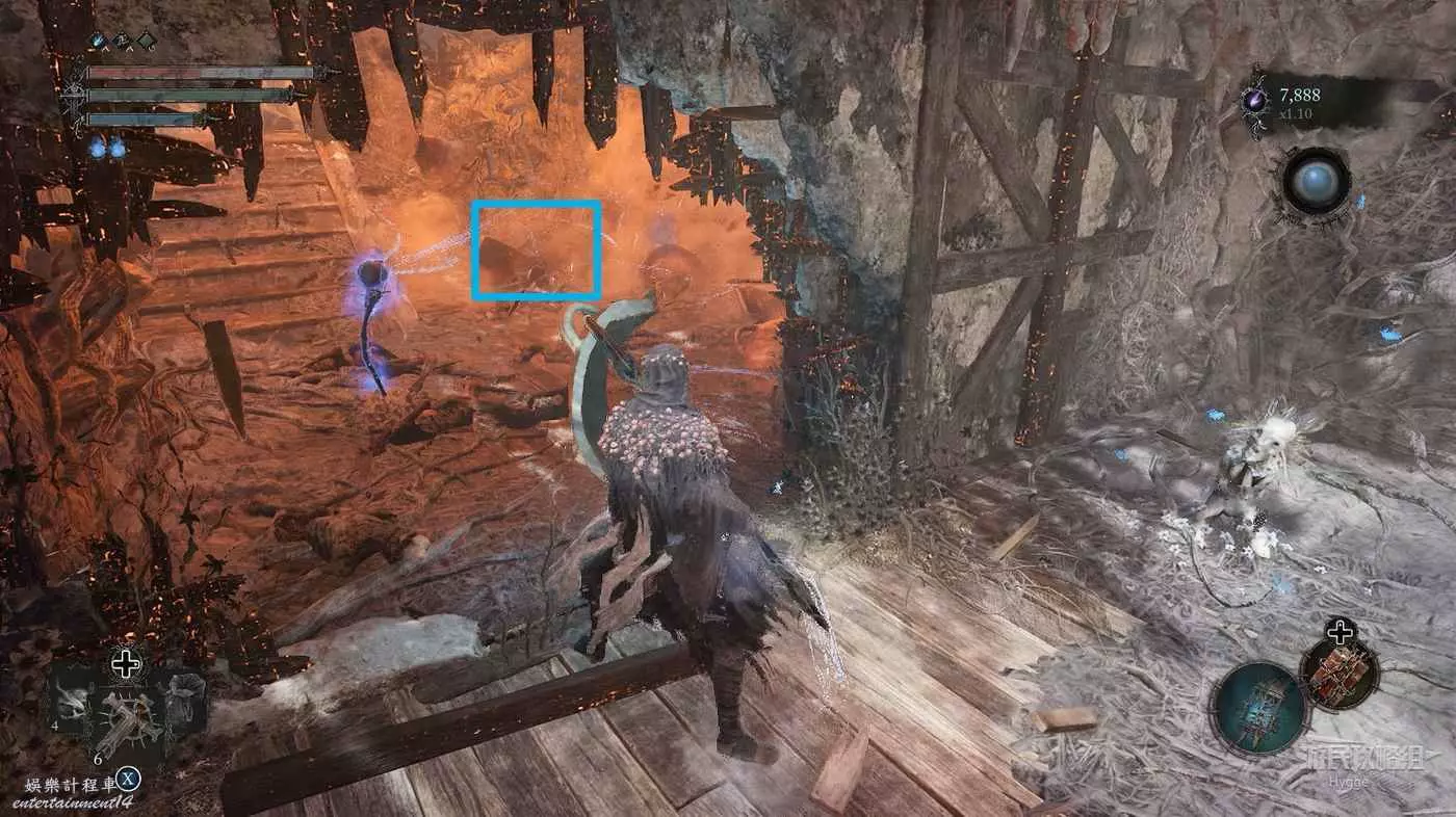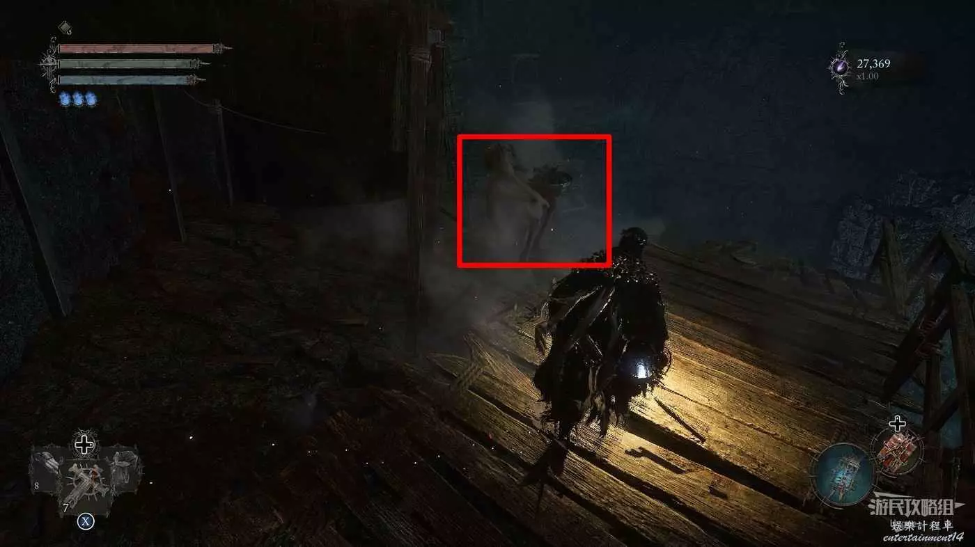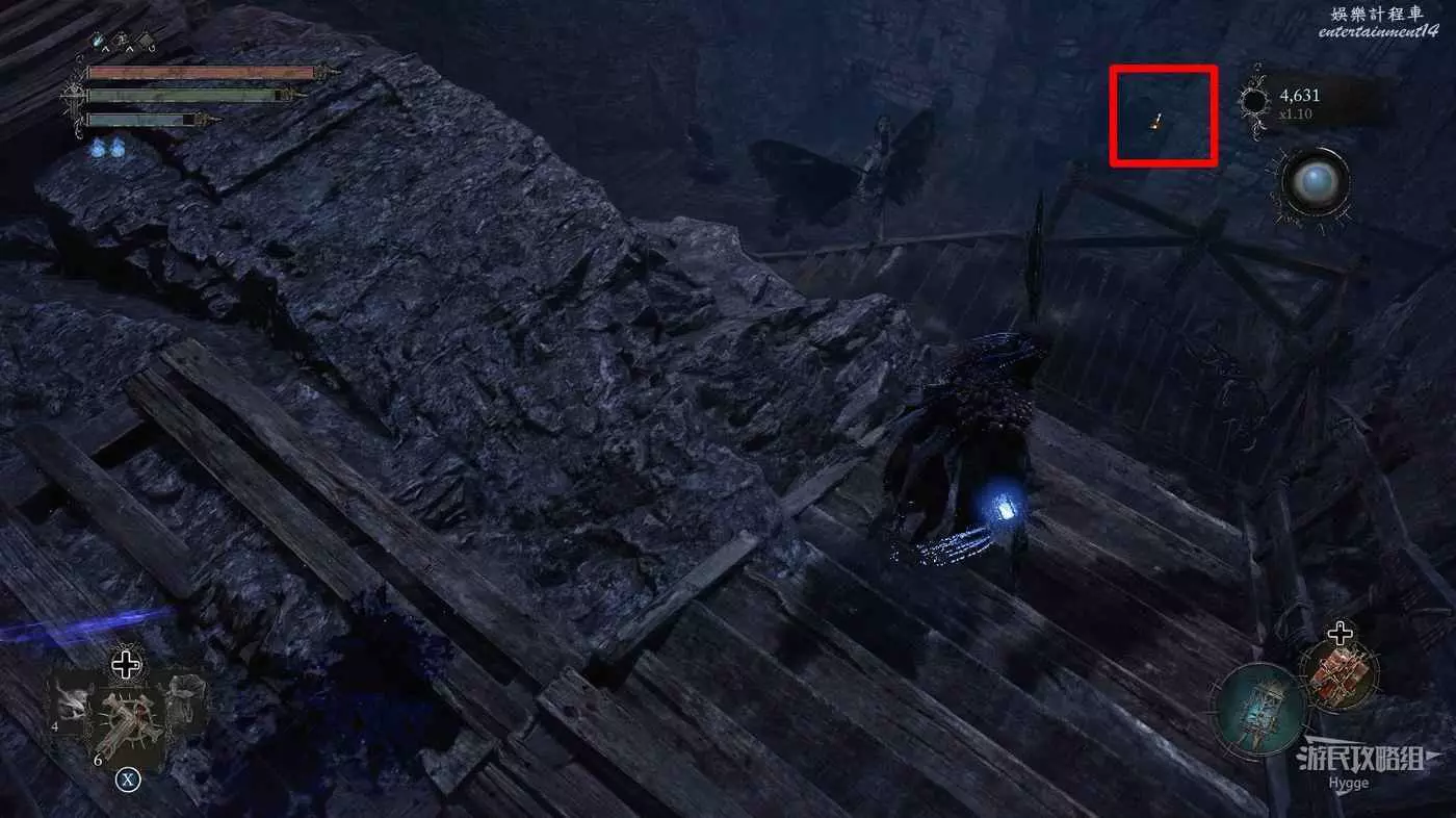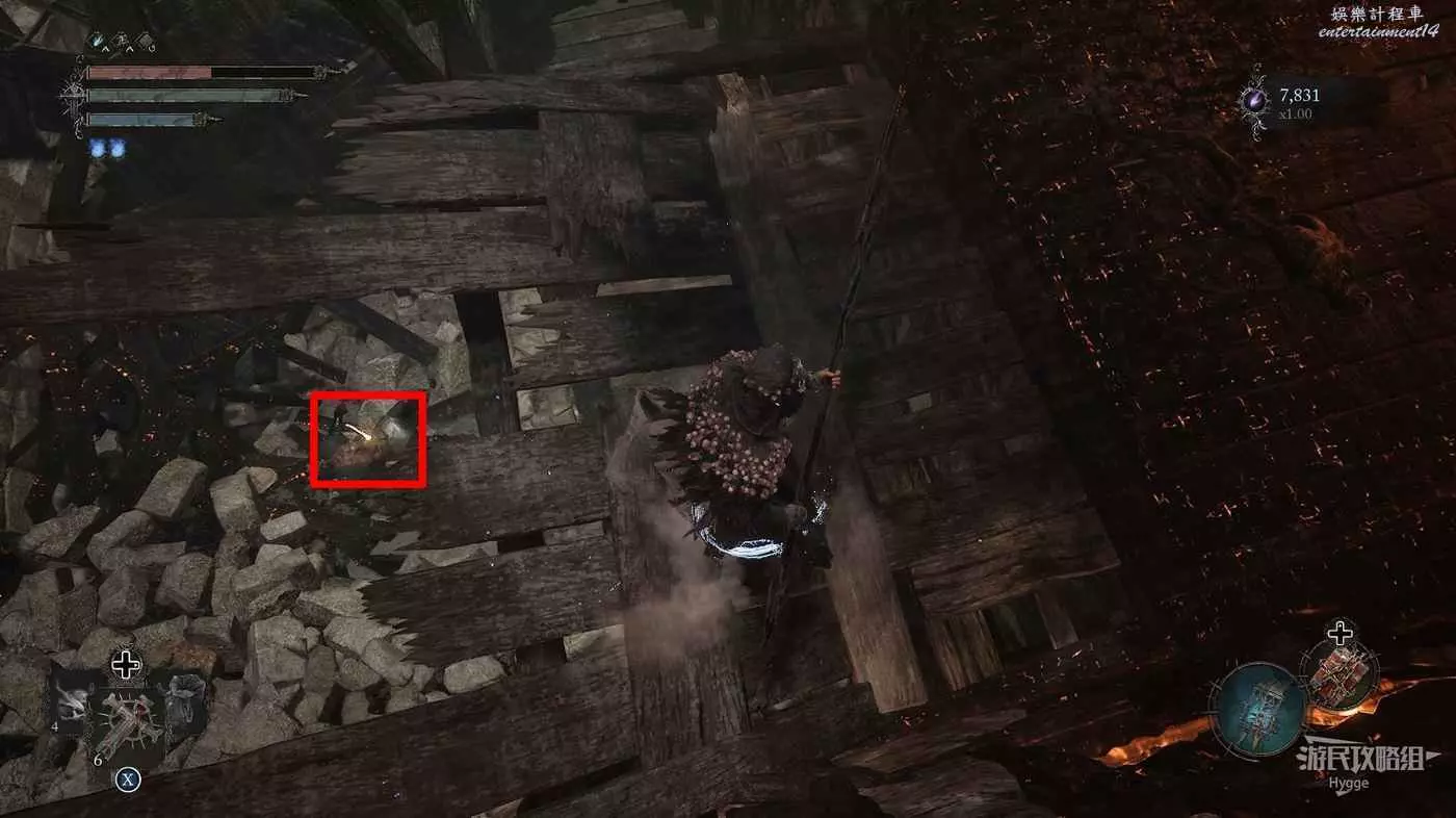 在上層平臺擊殺一名火焰劍士後可以在此處撿到一些強化素材和裝備【寂靜面罩】。