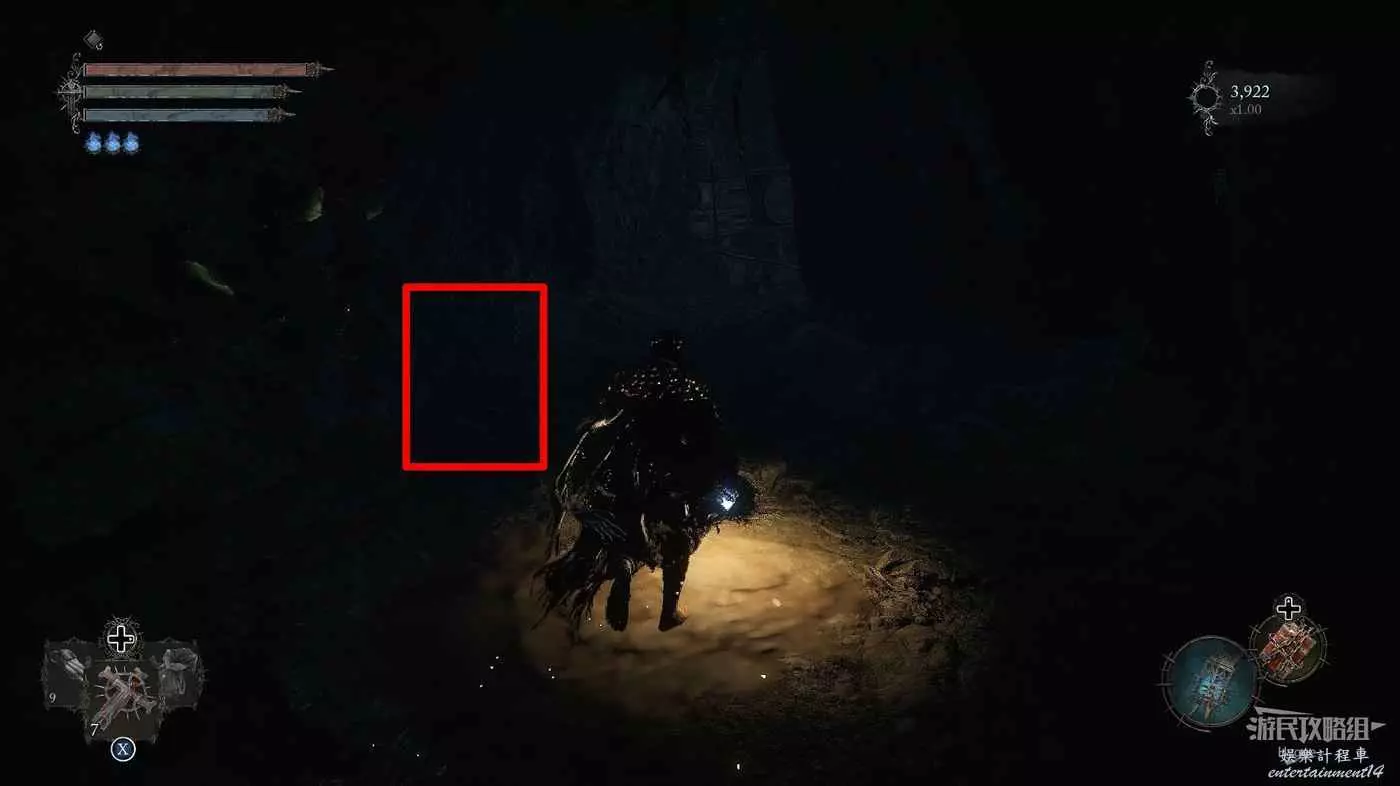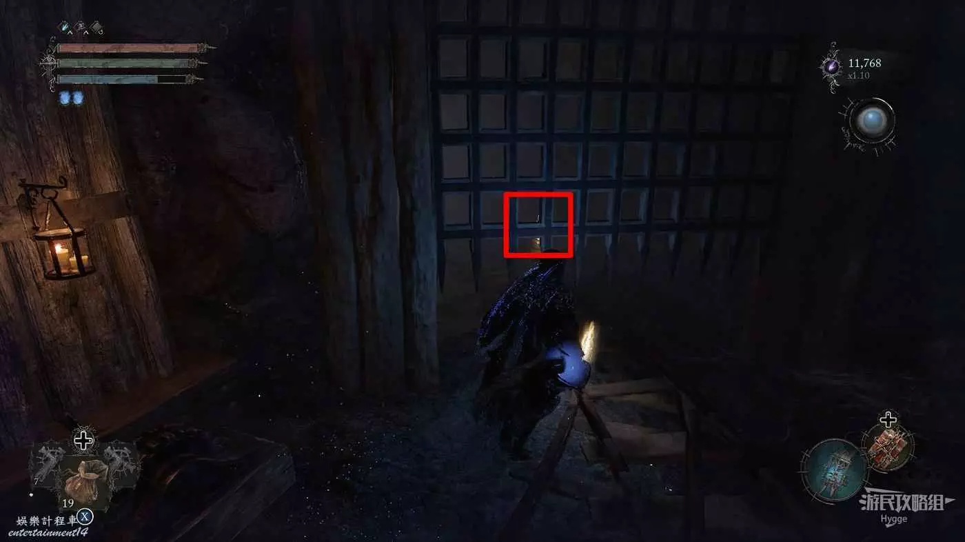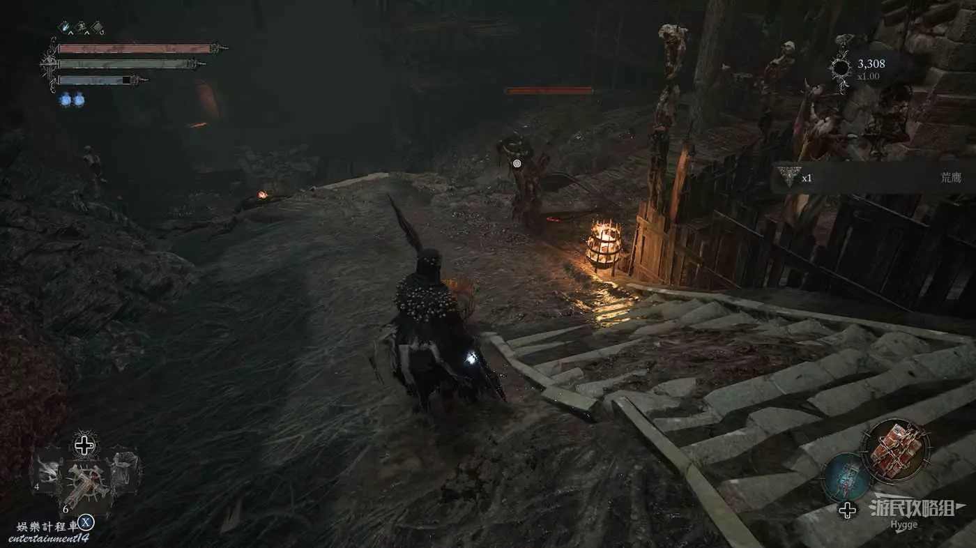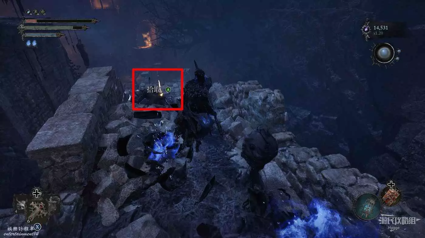 在上層平臺擊殺一名火焰劍士後可以在此處撿到一些強化素材和裝備【寂靜面罩】。