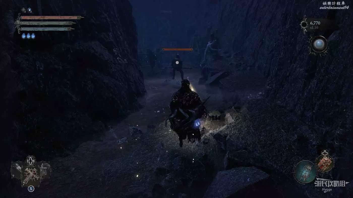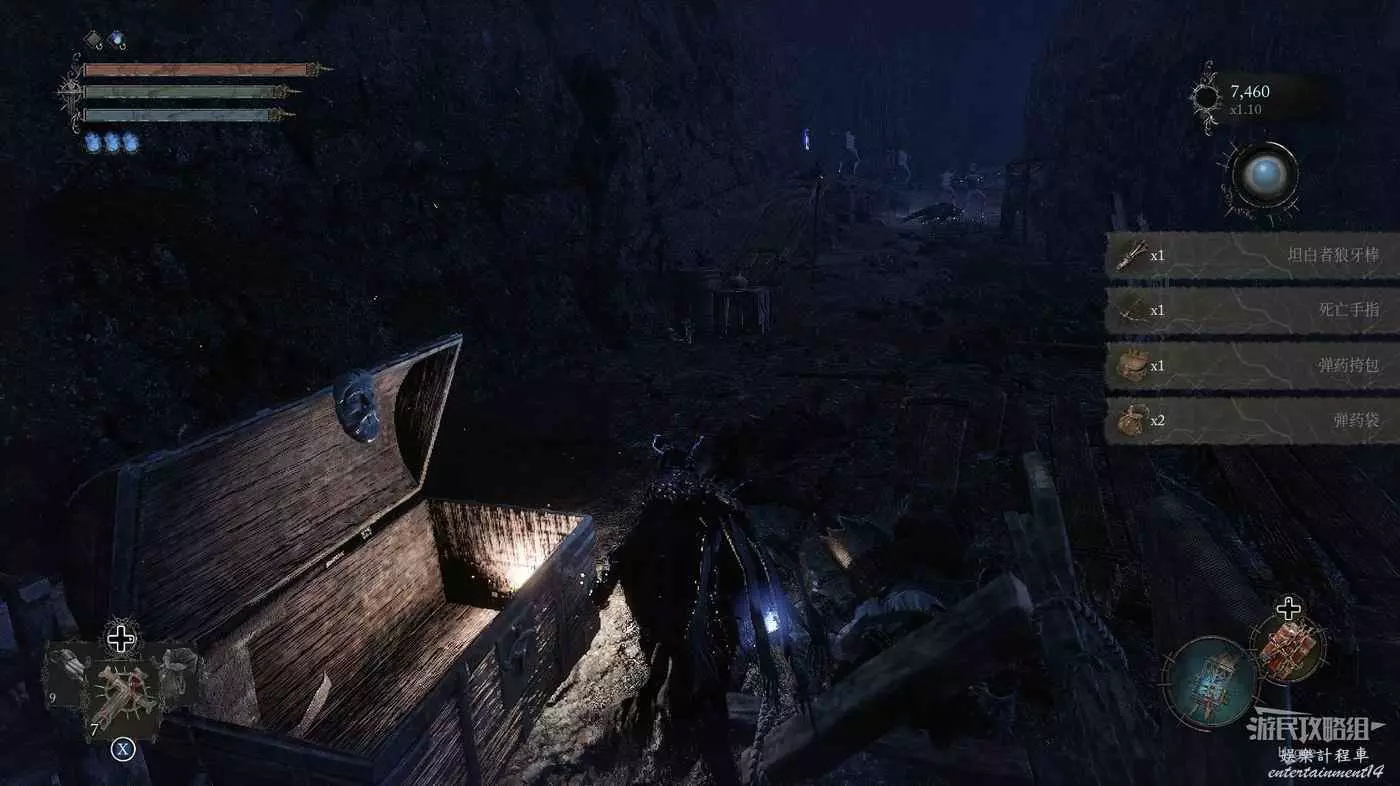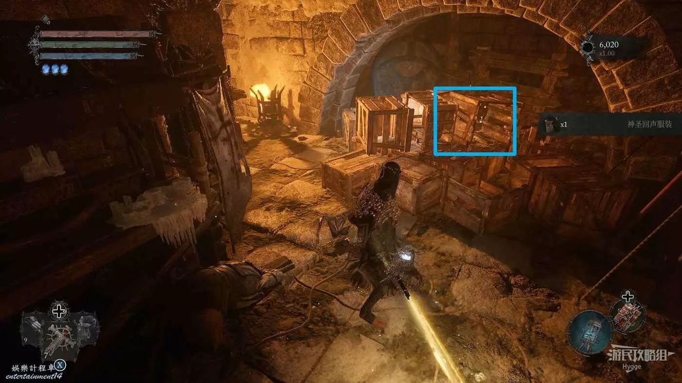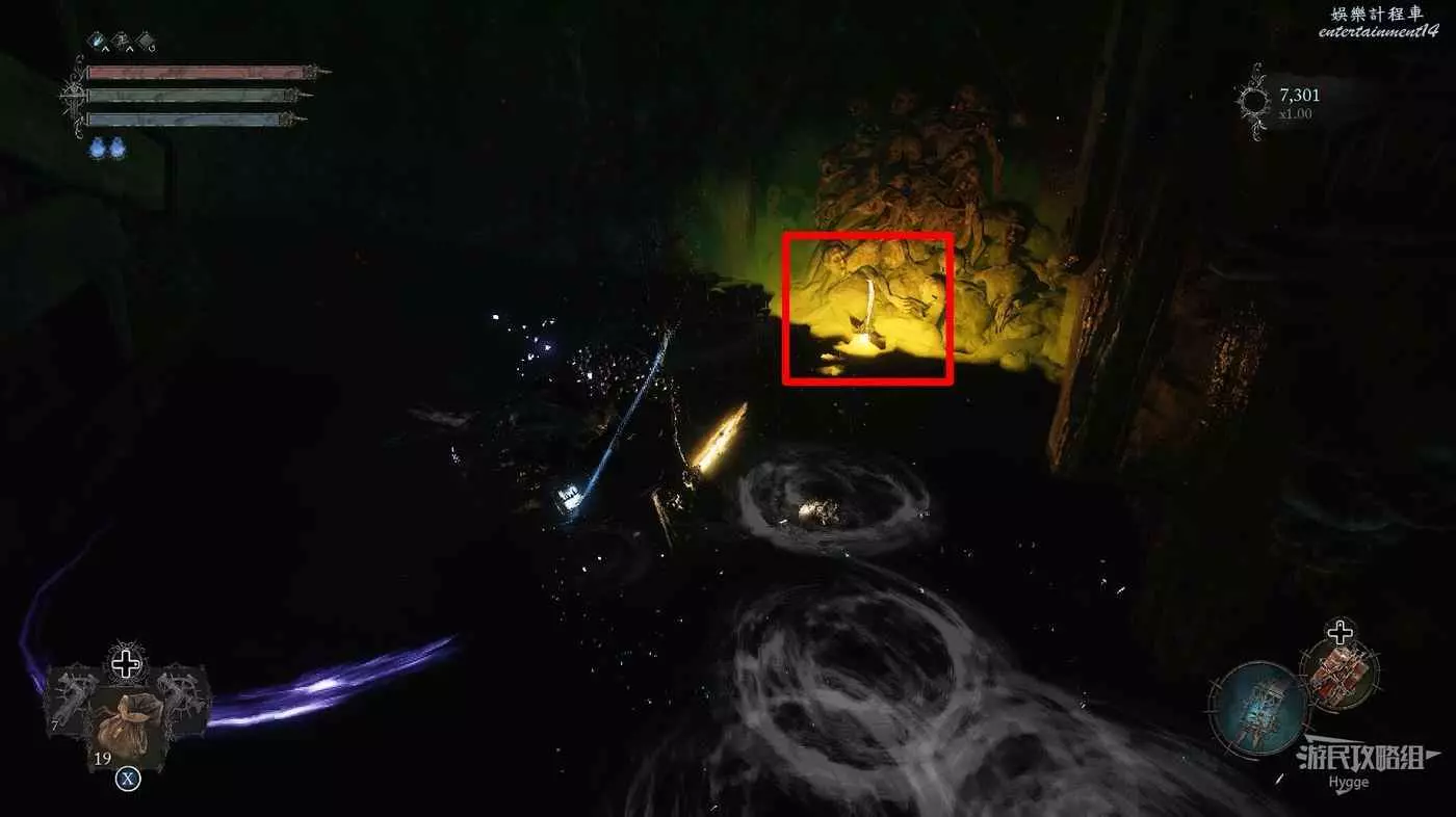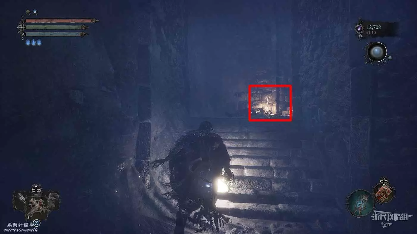 在上層平臺擊殺一名火焰劍士後可以在此處撿到一些強化素材和裝備【寂靜面罩】。