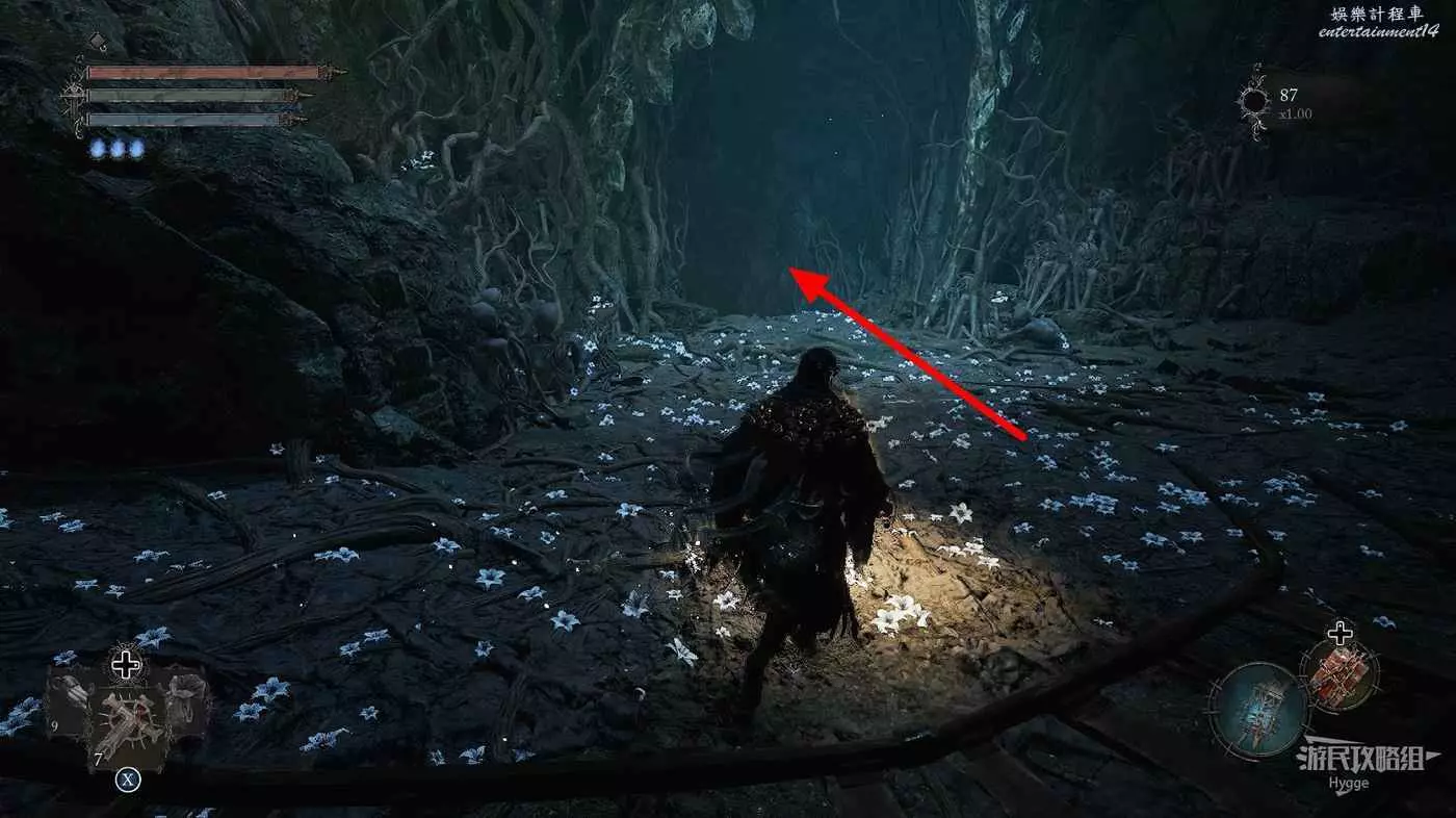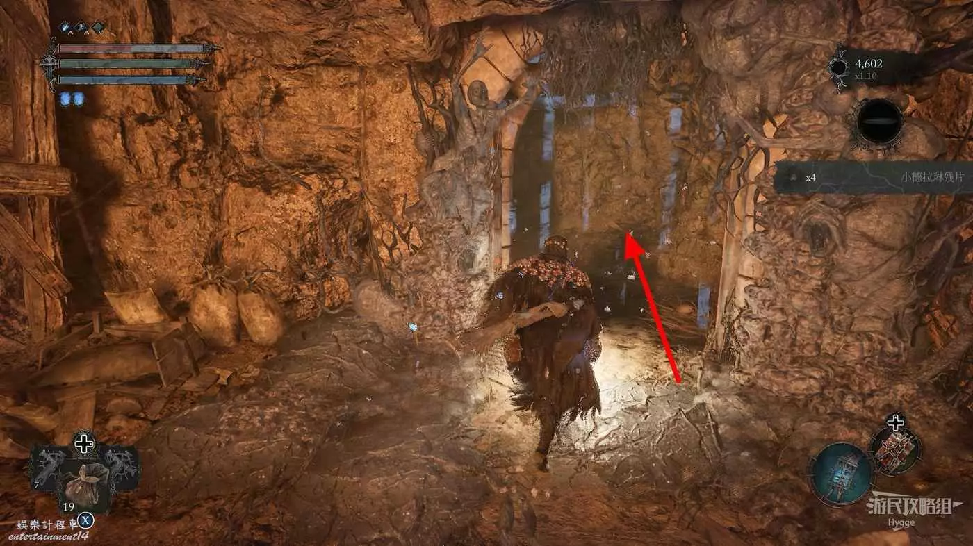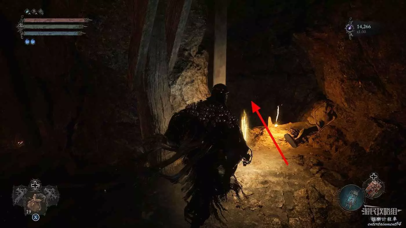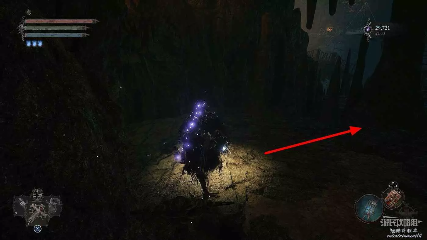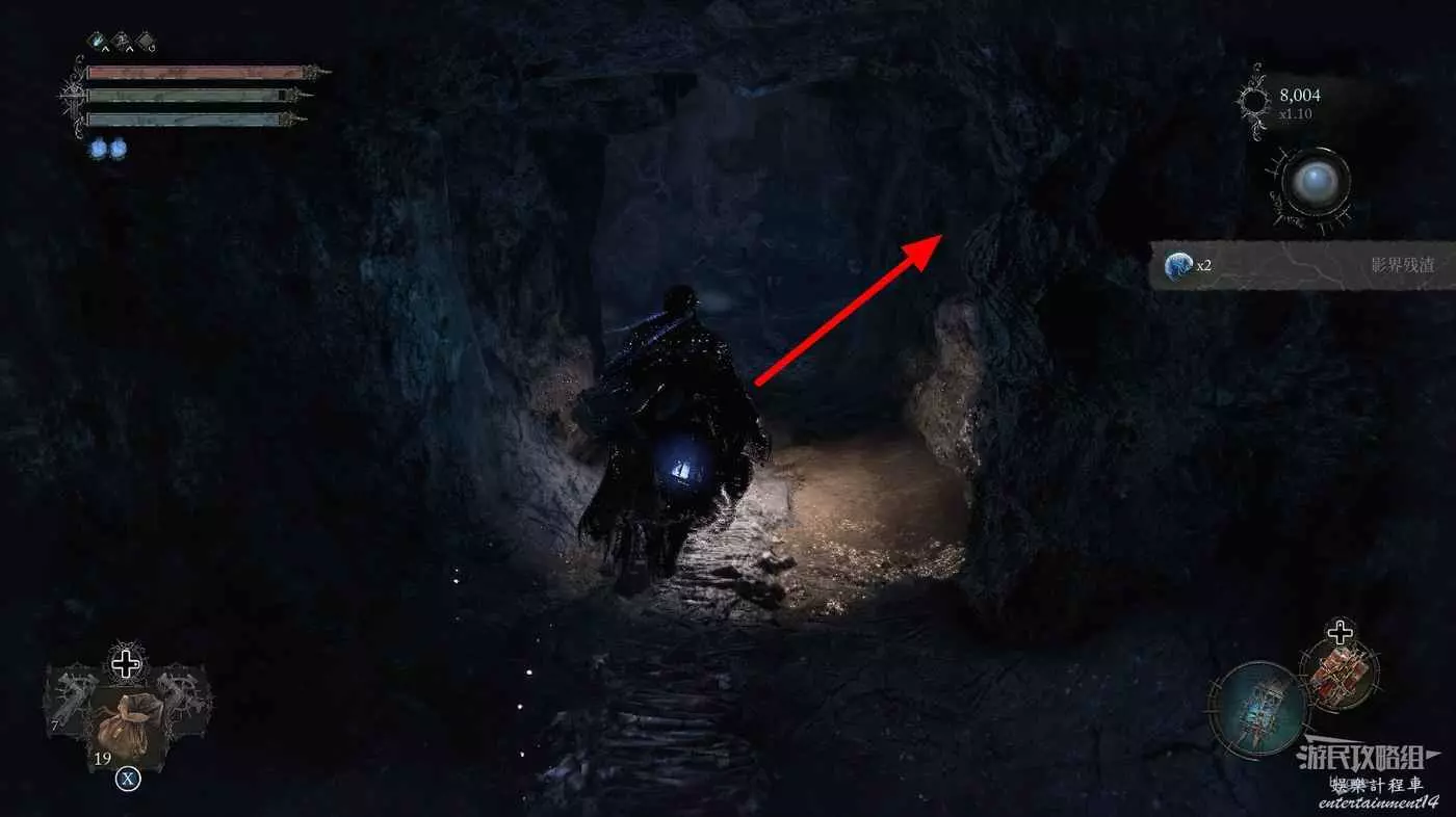 在門後的靈魂上拿到項鍊枯萎吊墜,然後通過雕像離開影界,再跳到下層的山洞中繼續前進。