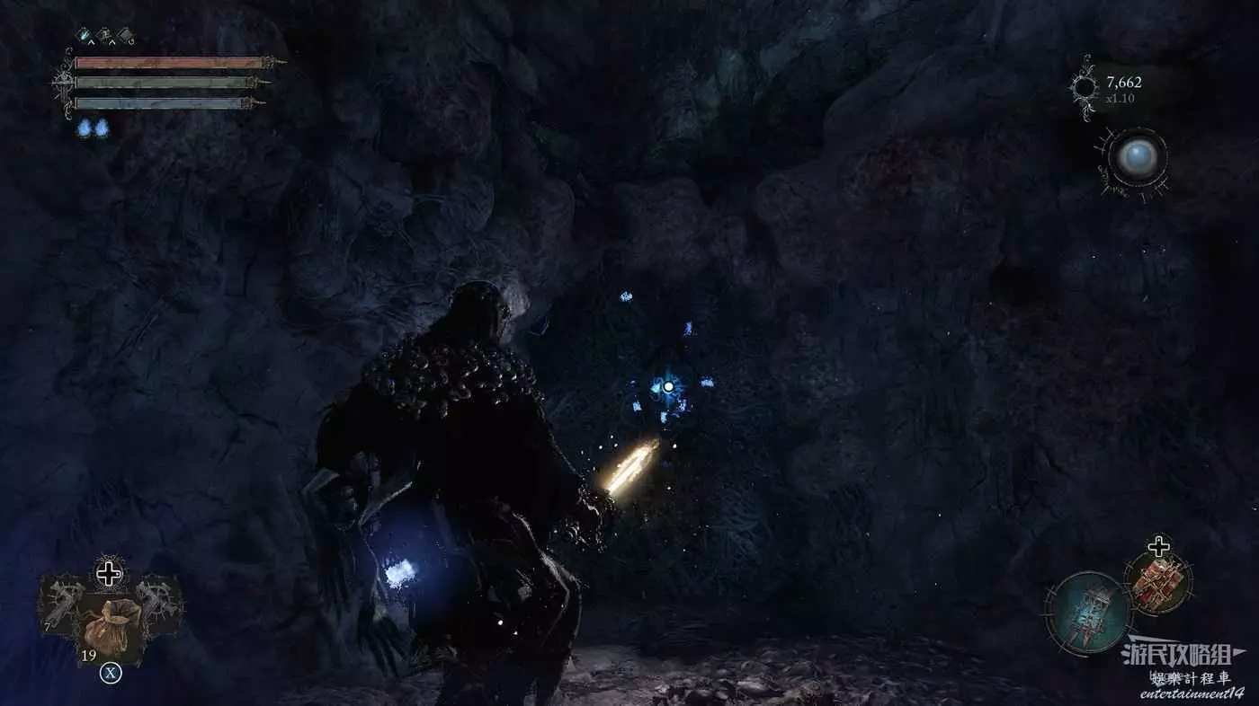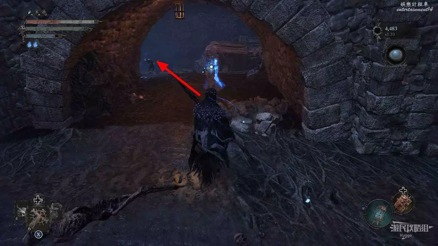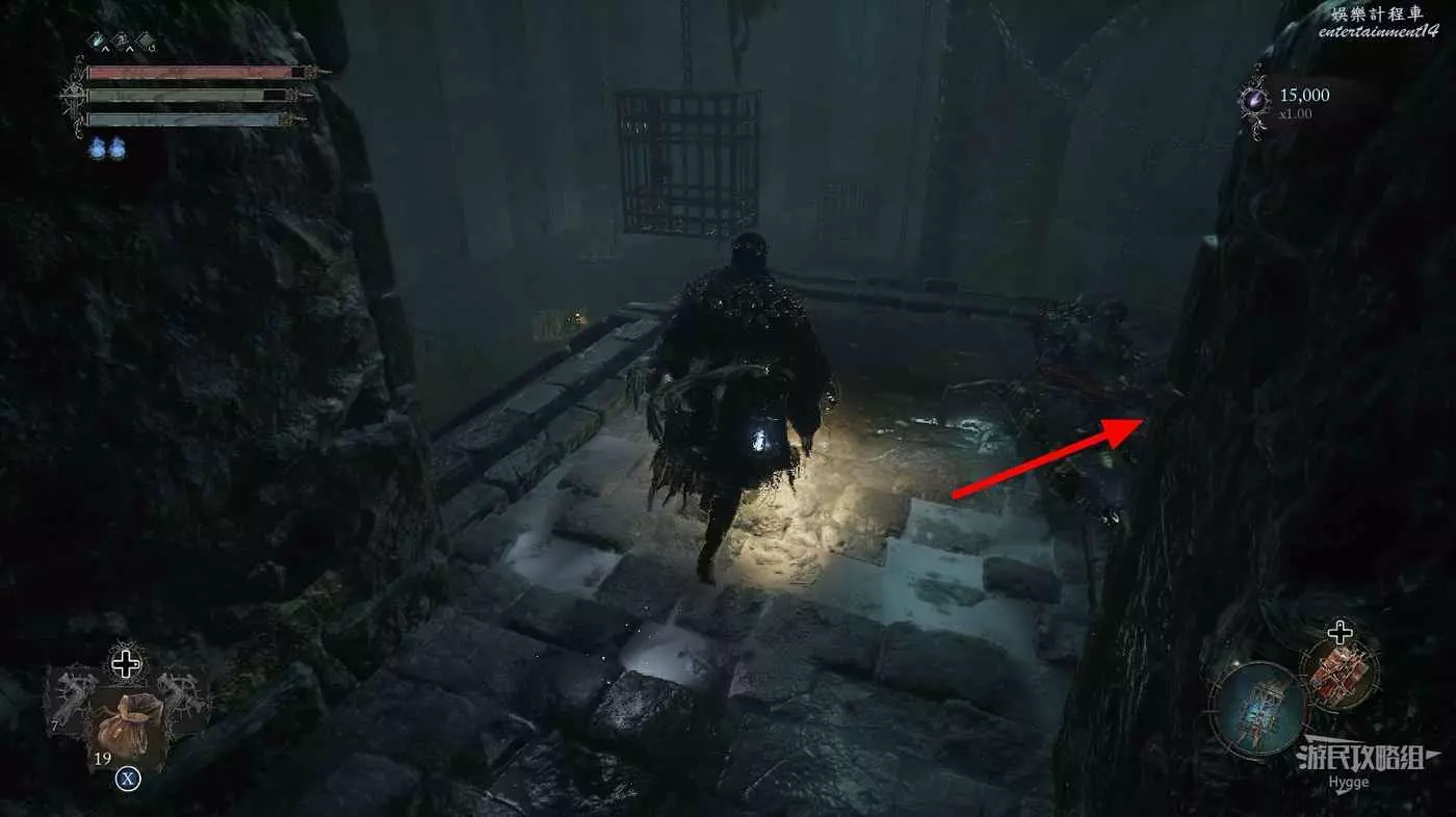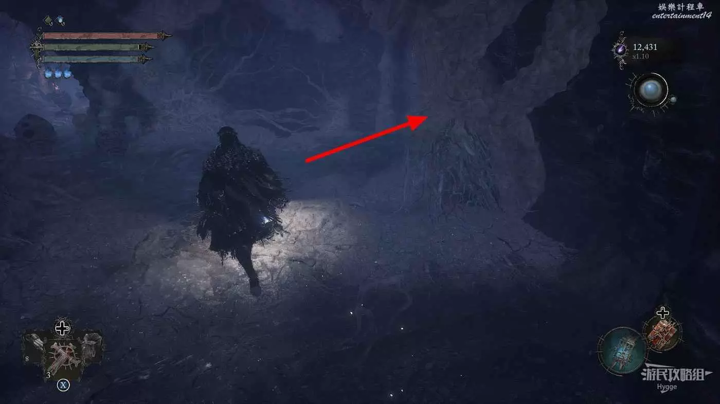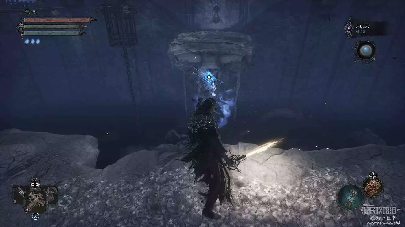 在門後的靈魂上拿到項鍊枯萎吊墜,然後通過雕像離開影界,再跳到下層的山洞中繼續前進。