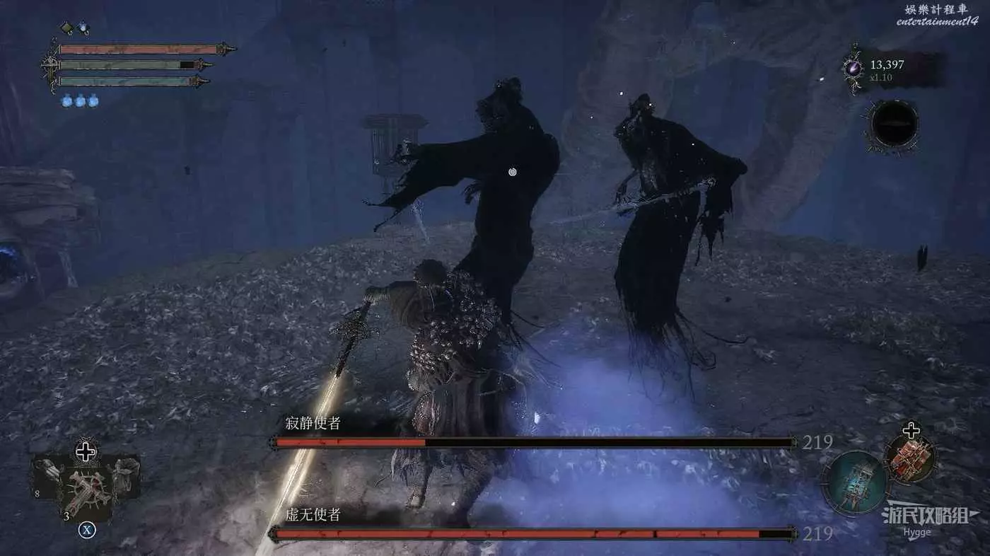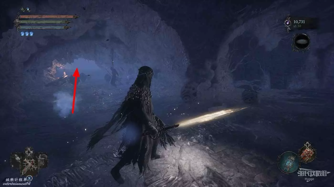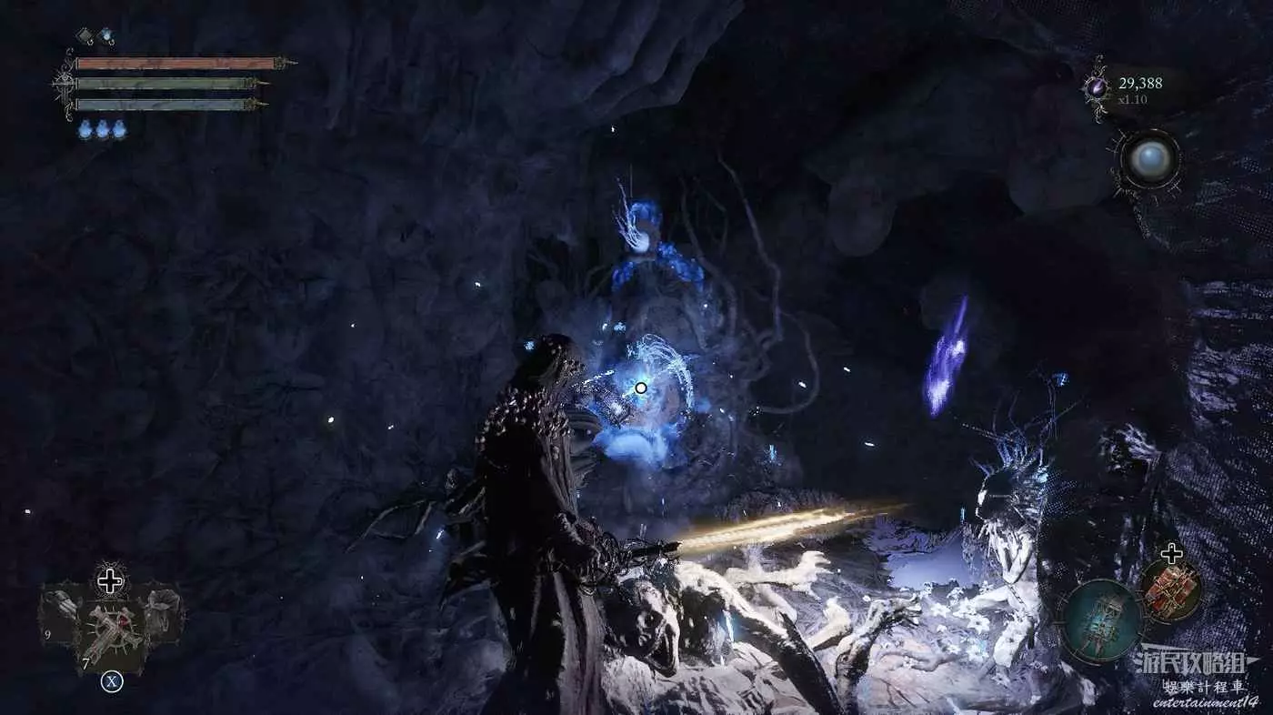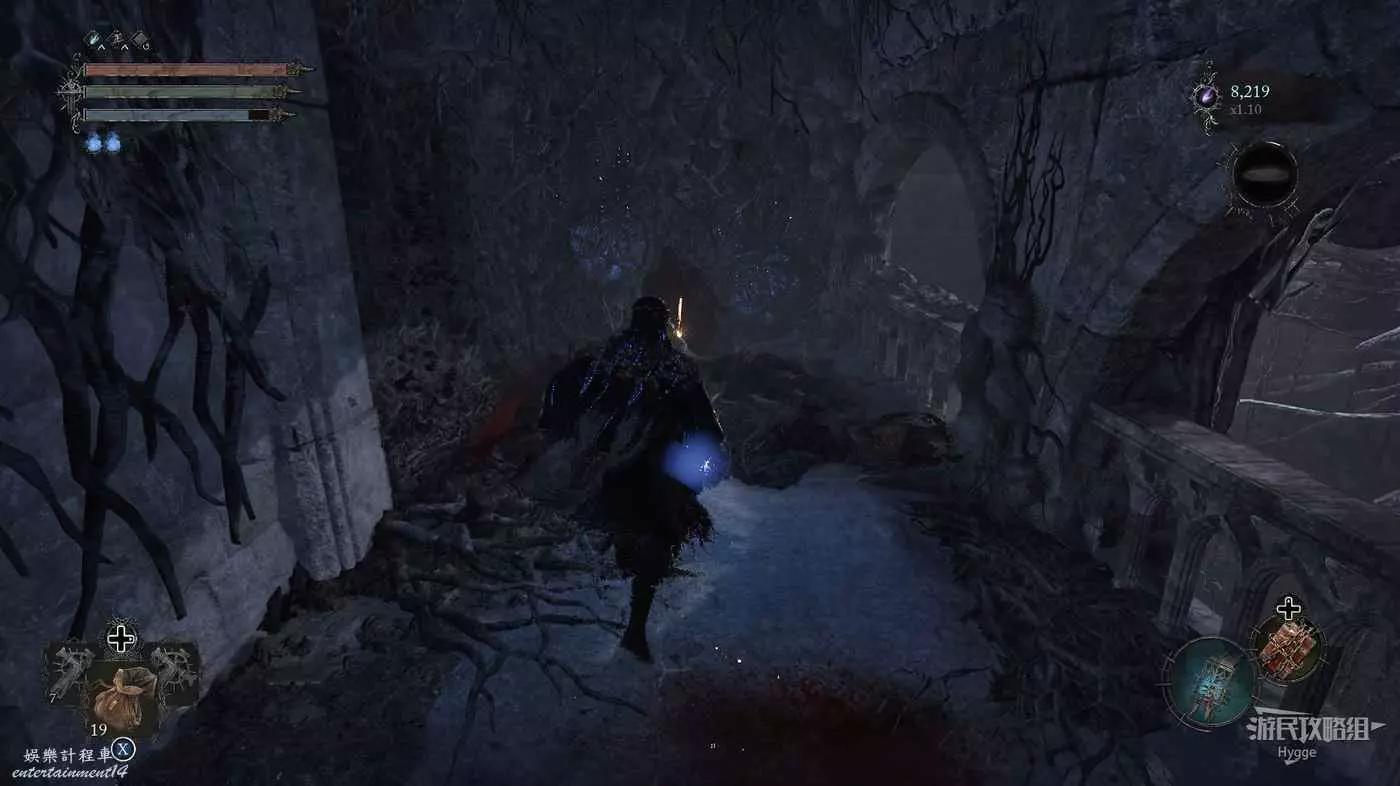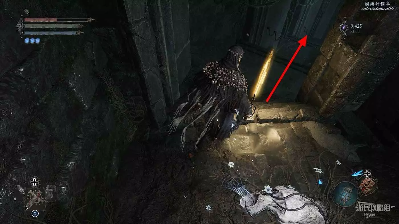 在門後的靈魂上拿到項鍊枯萎吊墜,然後通過雕像離開影界,再跳到下層的山洞中繼續前進。