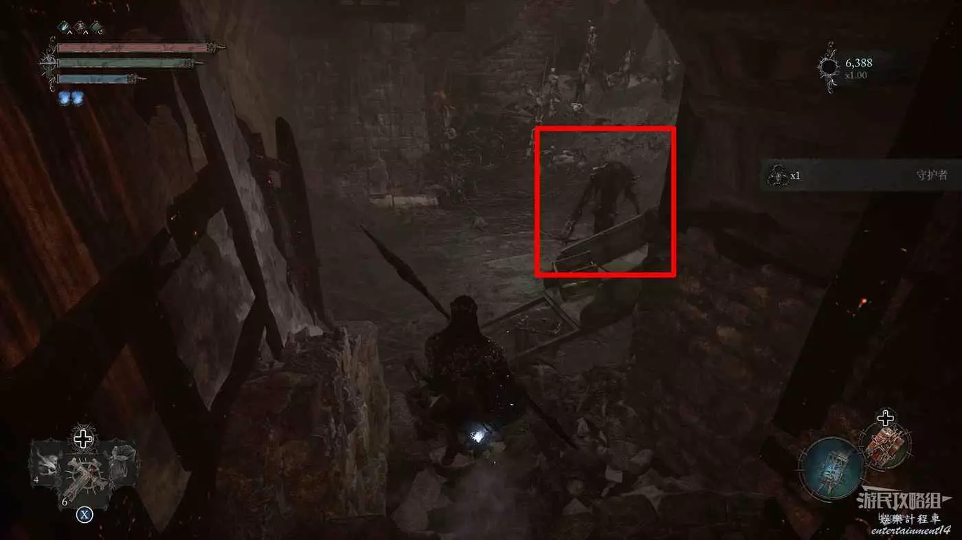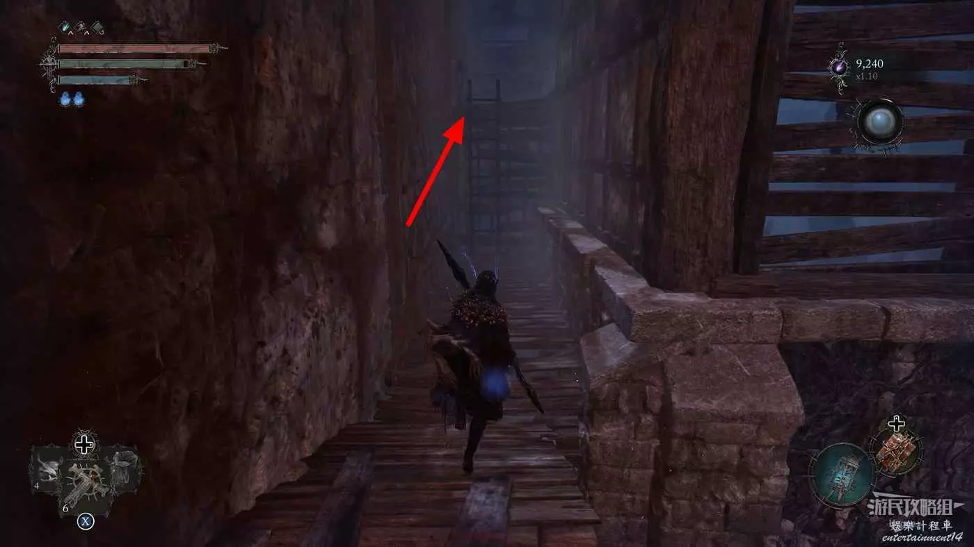在房梁上拿到武器【裂開的十字弩】後原路返回塔樓。