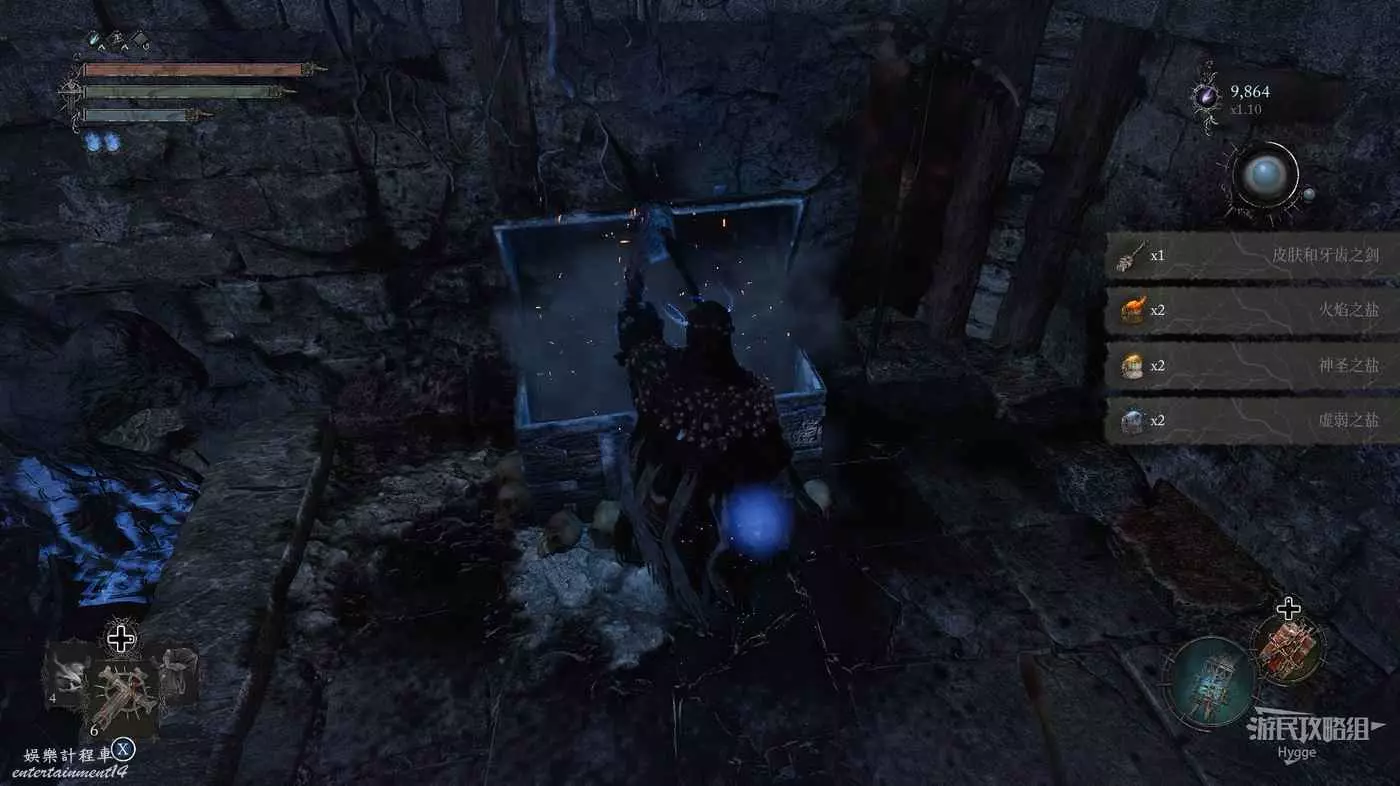 在牆壁後的隱藏房間中有一片花床和一個寶箱,打開寶箱拿到武器【皮膚和牙齒之劍】和一些道具。