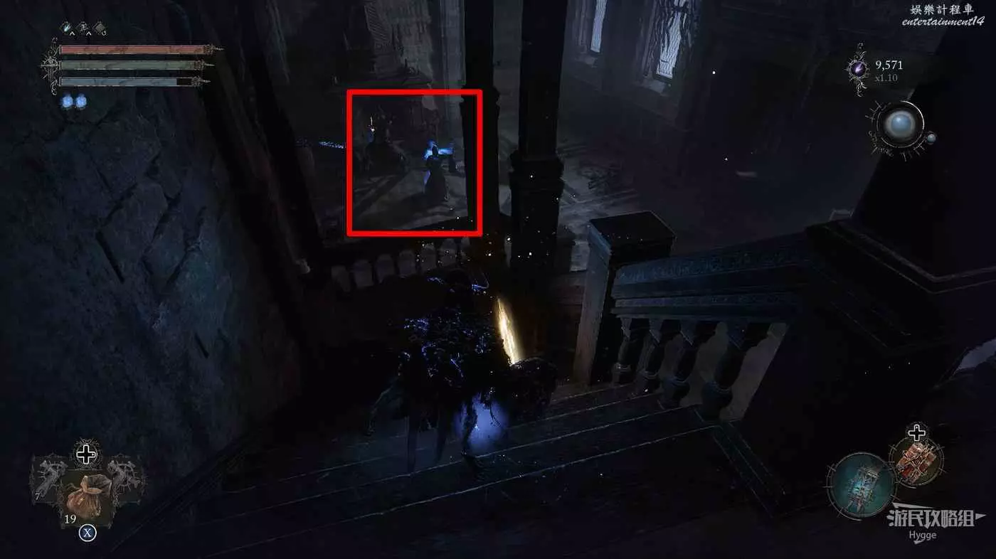 來到上層的升降梯平臺,在連接平臺上下層的樓梯旁進入影界,使用攝魂打開道路。