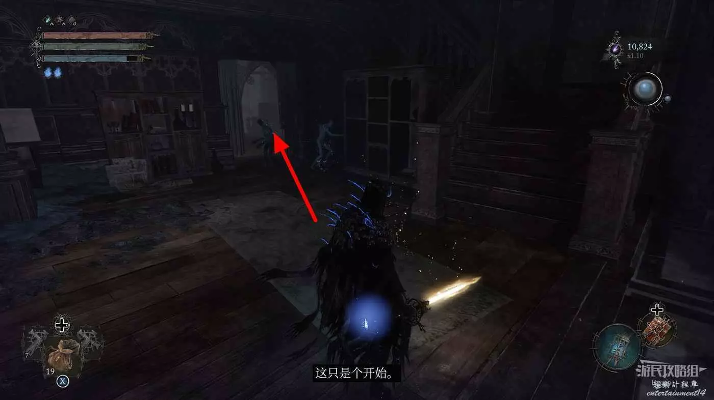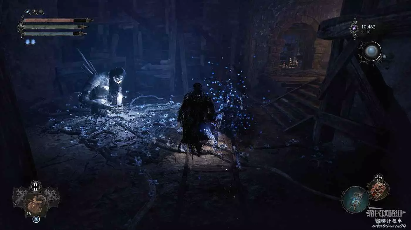然後舉起提燈穿過牆壁回到小屋一層擊殺寄生蟲和其他敵人,在樓梯旁的角落裡可以拿到武器【碎鱗錘】。