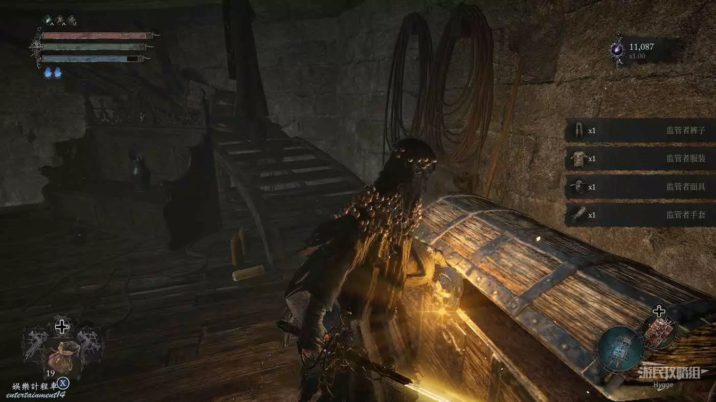 來到遺骸右側的房間沿著臺階向下,在中間層的臺階旁可以撿到一套裝備。