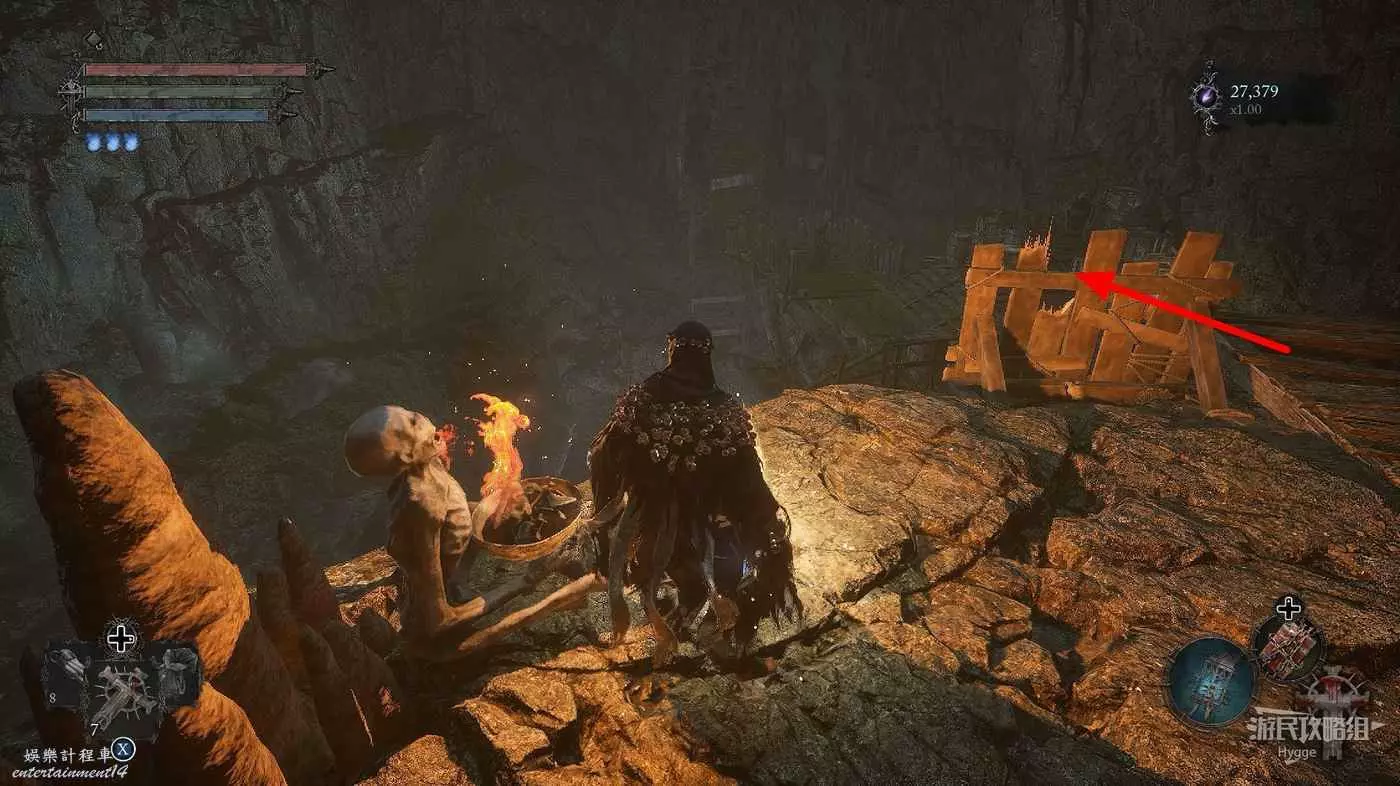 點燃山洞旁的火盆後踢倒木板打通連接之前區域的捷徑。