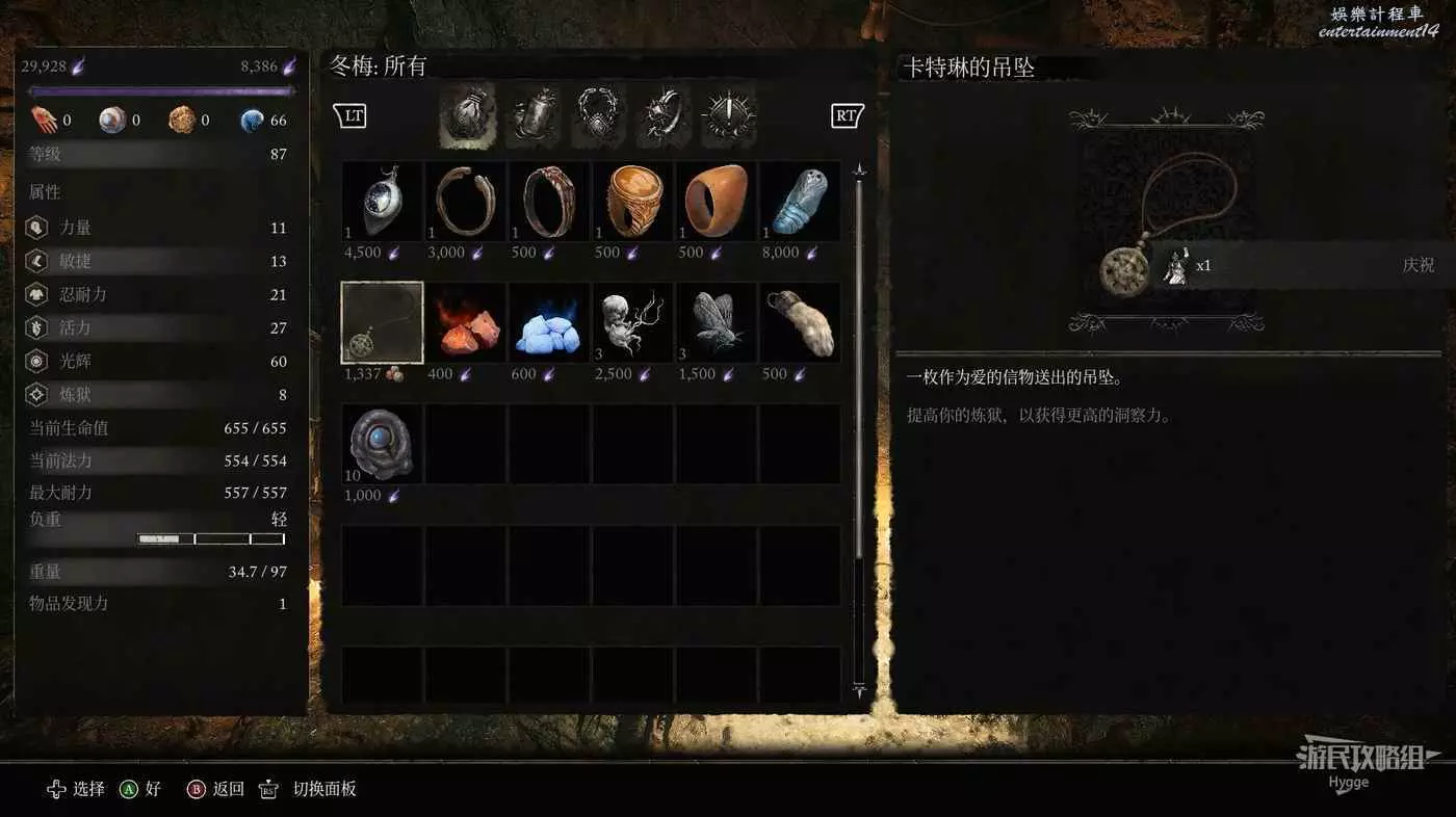 在前方房間可以放下一個梯子打通連接下層的捷徑,左側的柵欄邊可以拿到飾品【不眨眼的樹根】,右側的走廊裡藏著一個雙斧戰士。