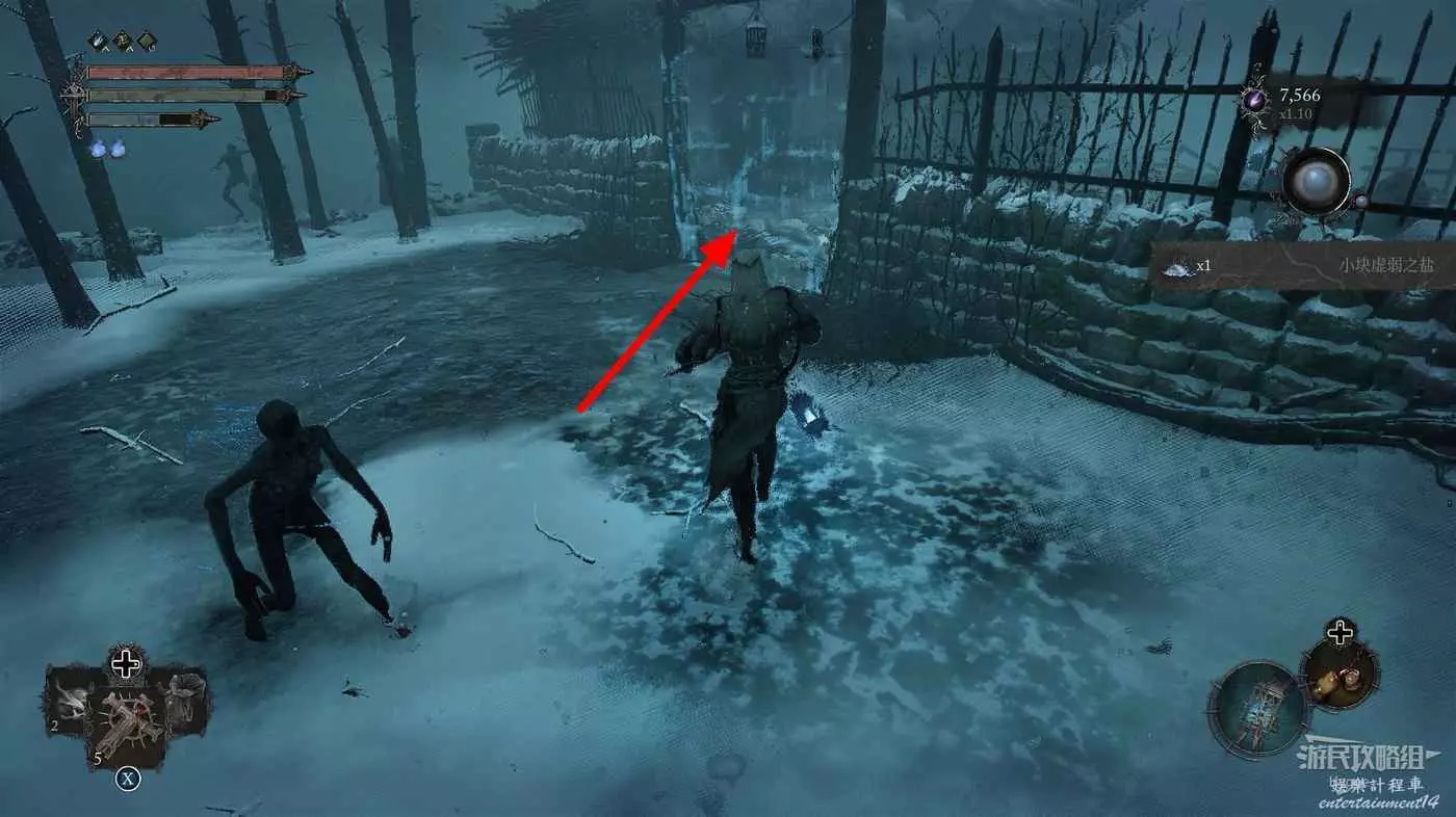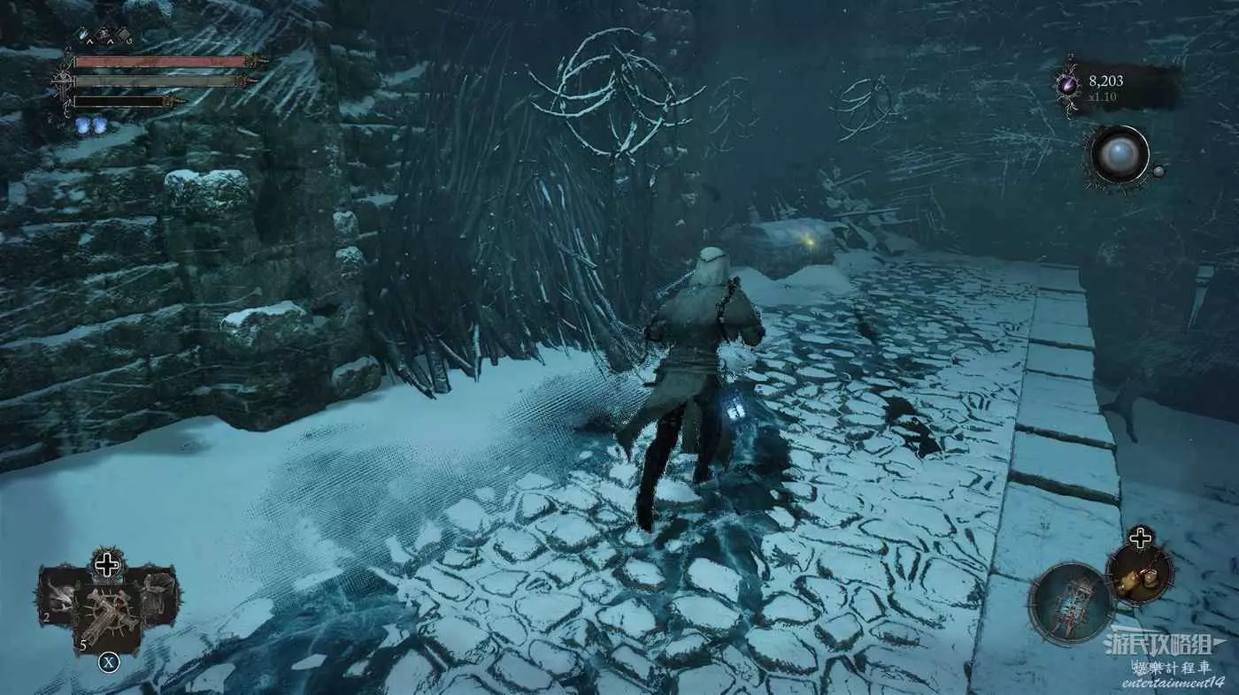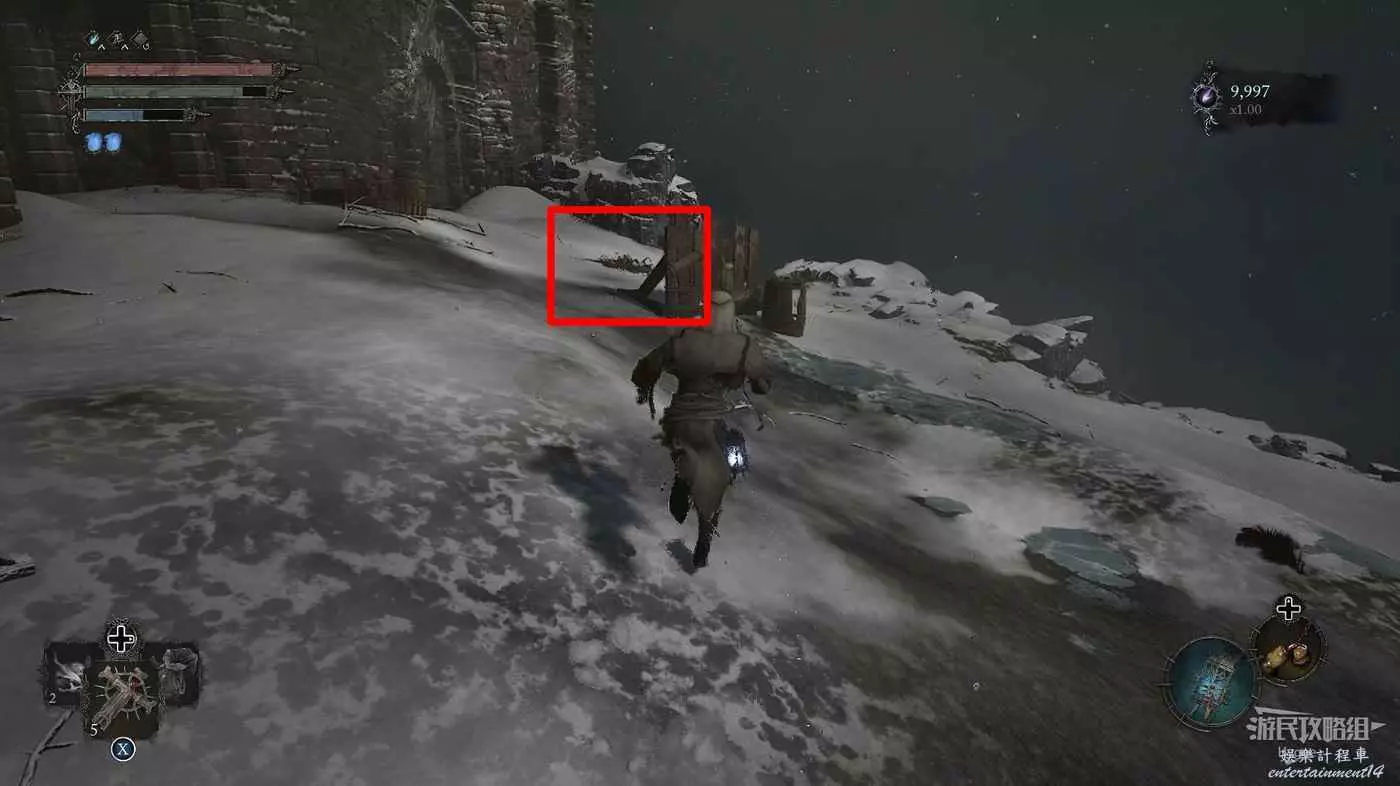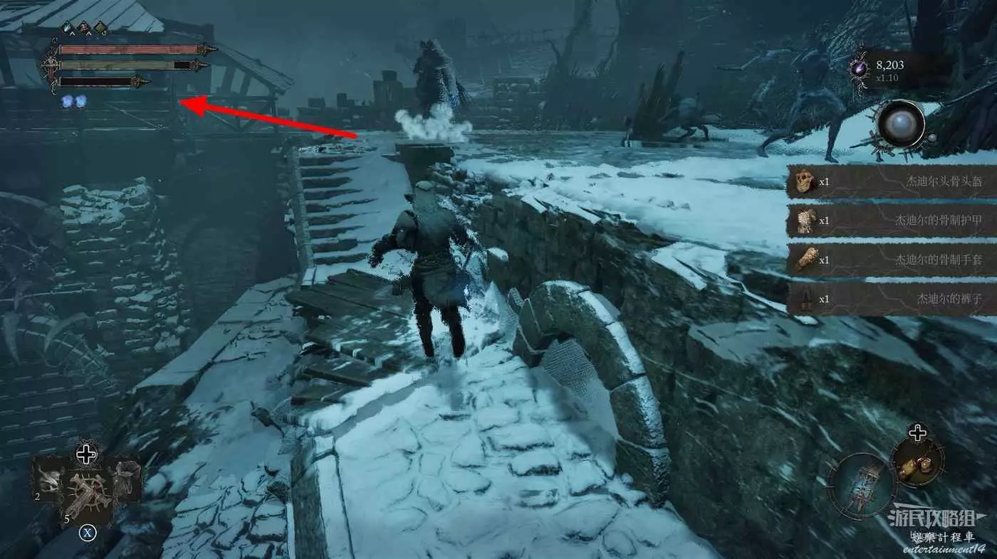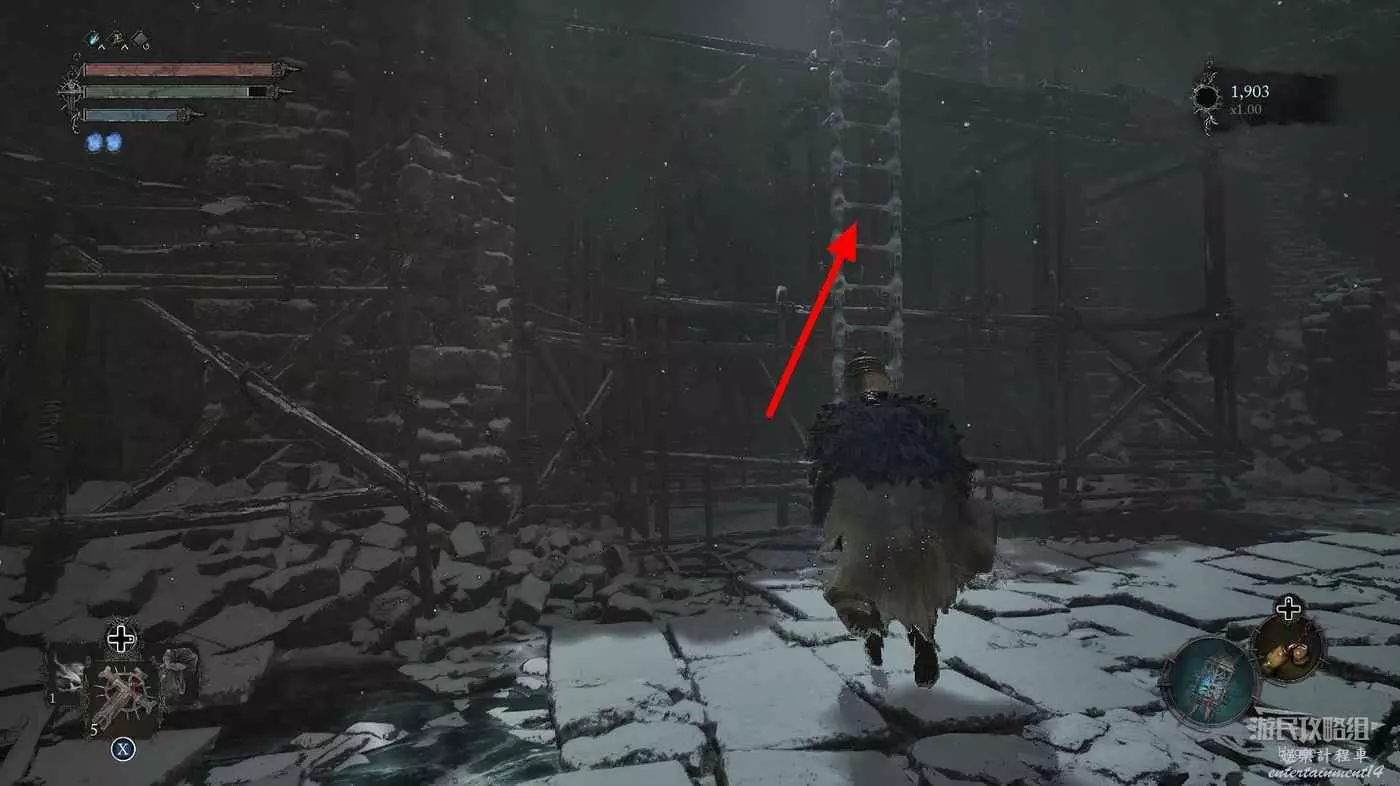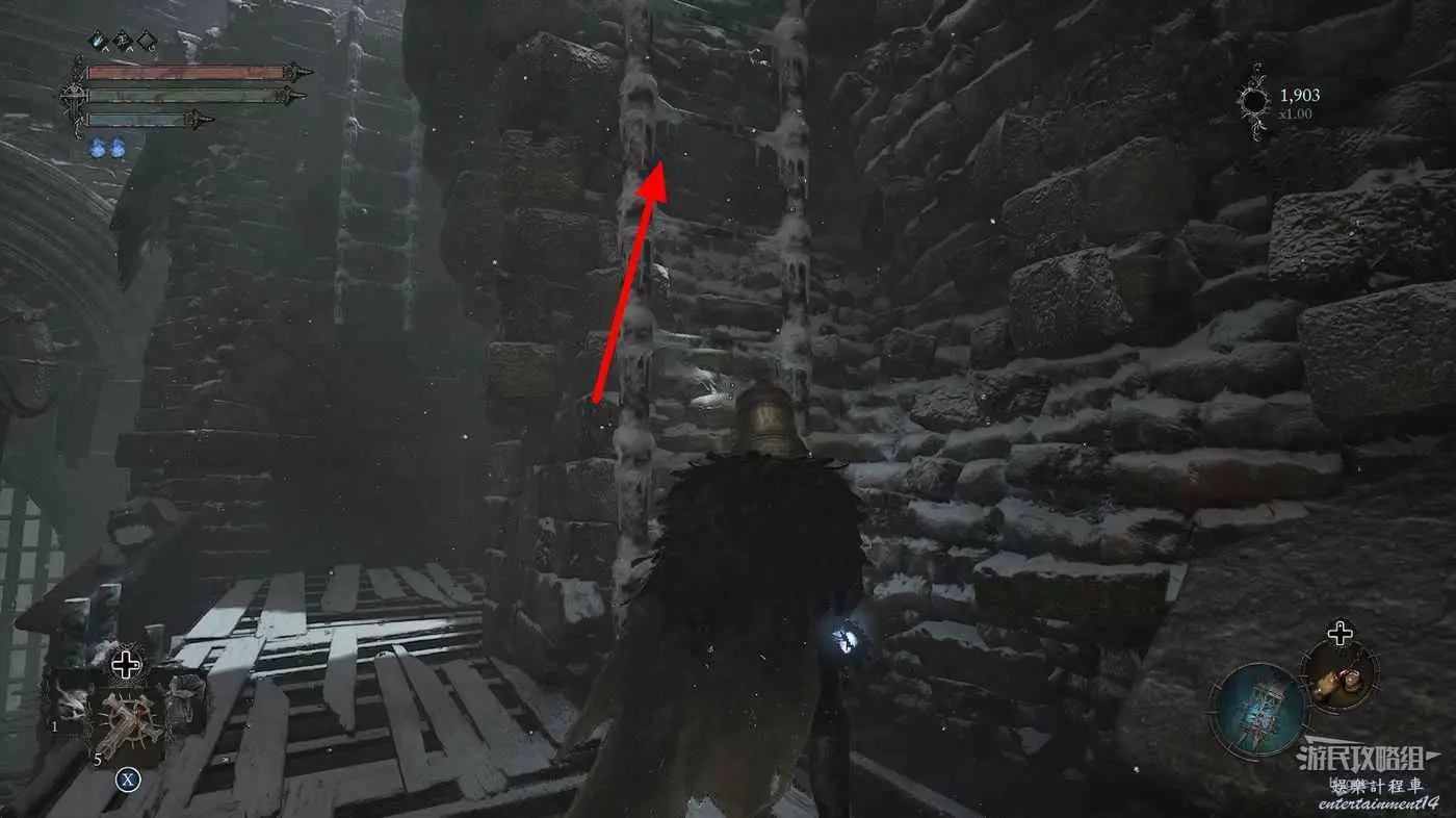 在前方被封堵住的城門旁拿到投擲武器【強化切割飛刀】後從旁邊的梯子向上正式進入寒冰詛咒之地。
