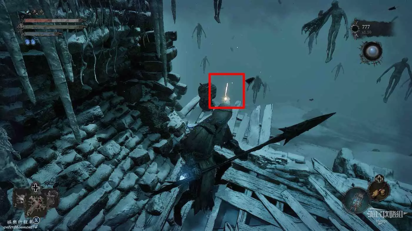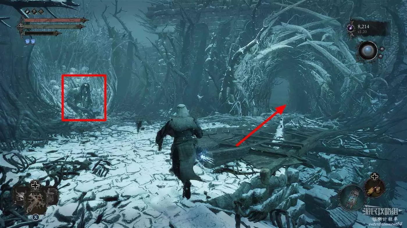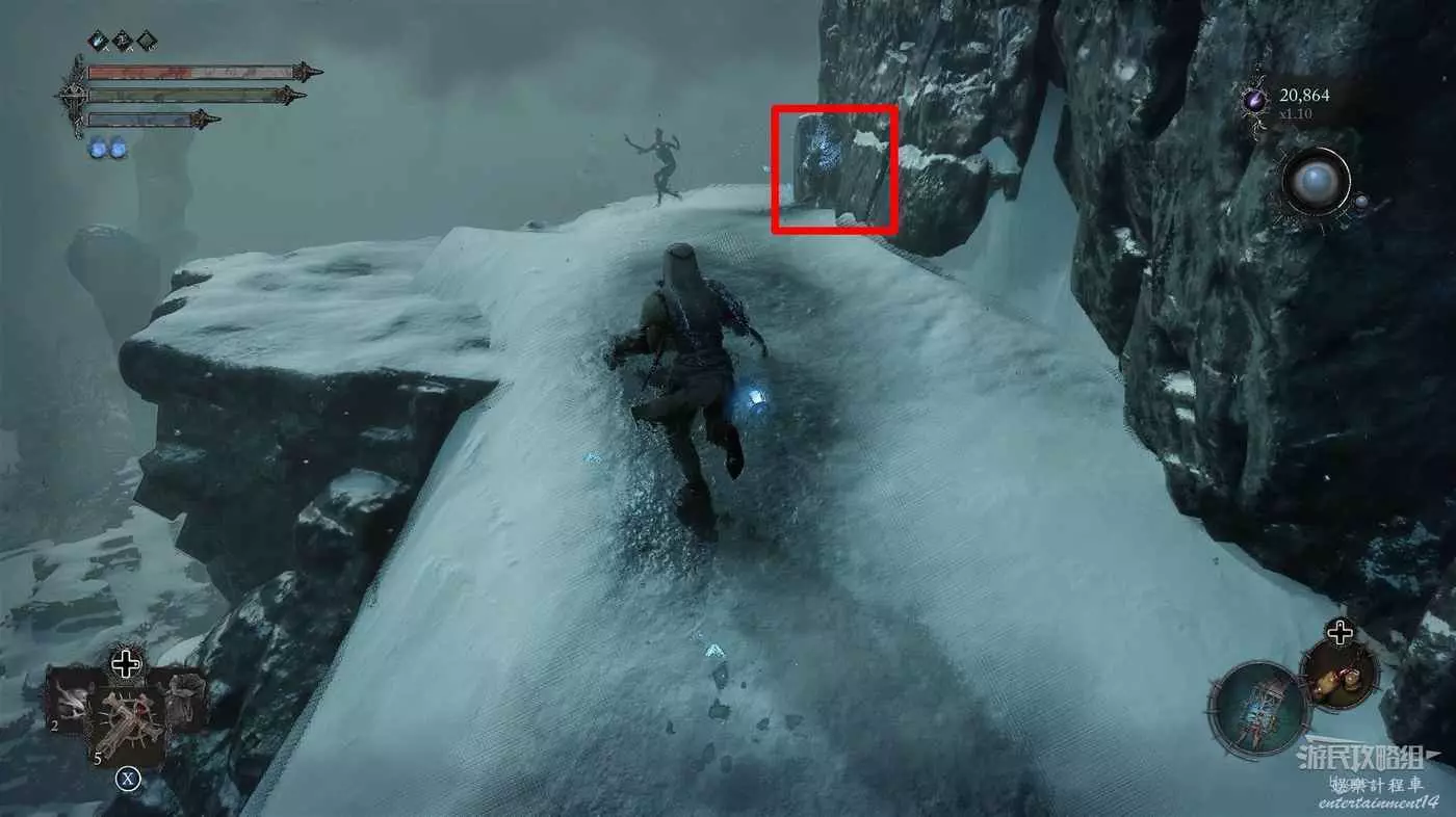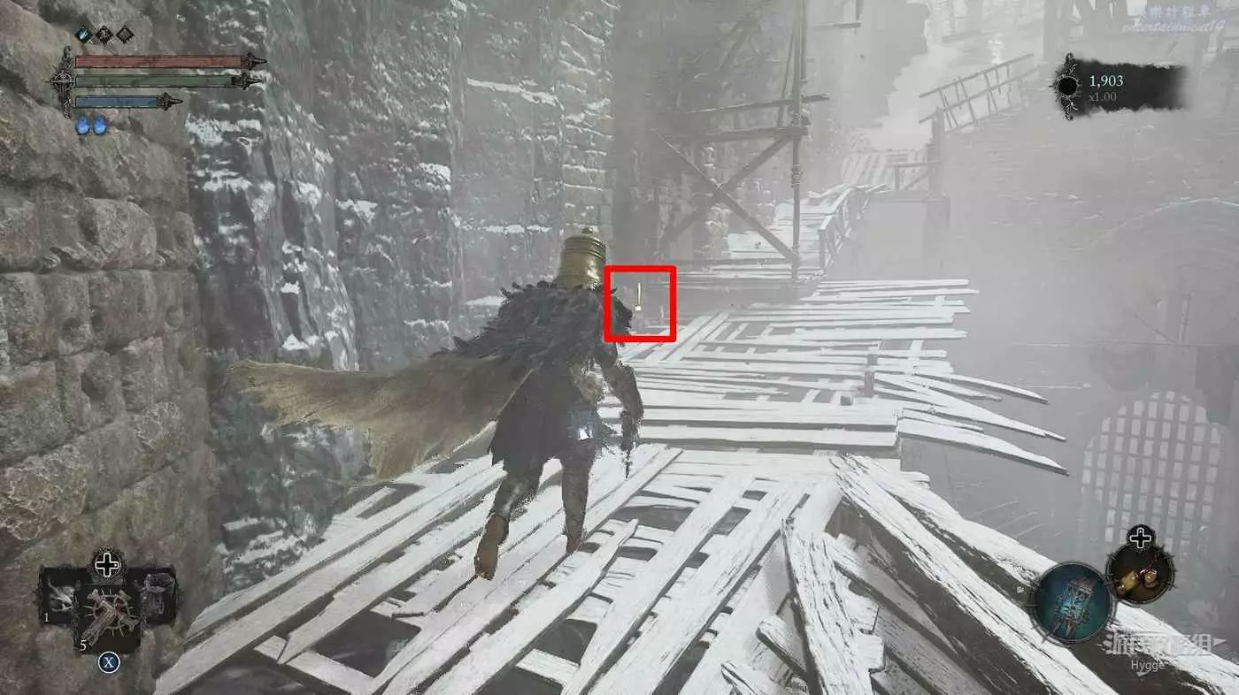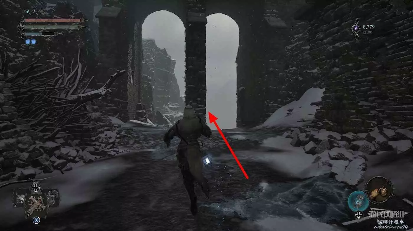 在前方被封堵住的城門旁拿到投擲武器【強化切割飛刀】後從旁邊的梯子向上正式進入寒冰詛咒之地。