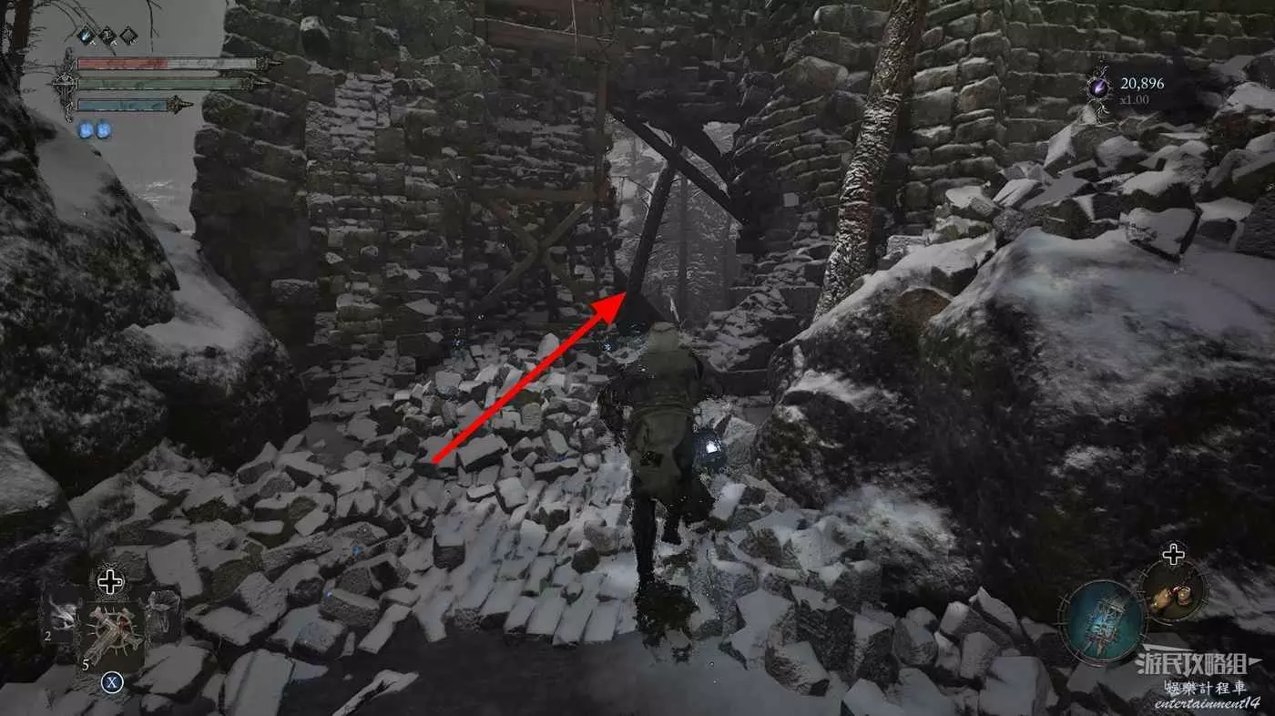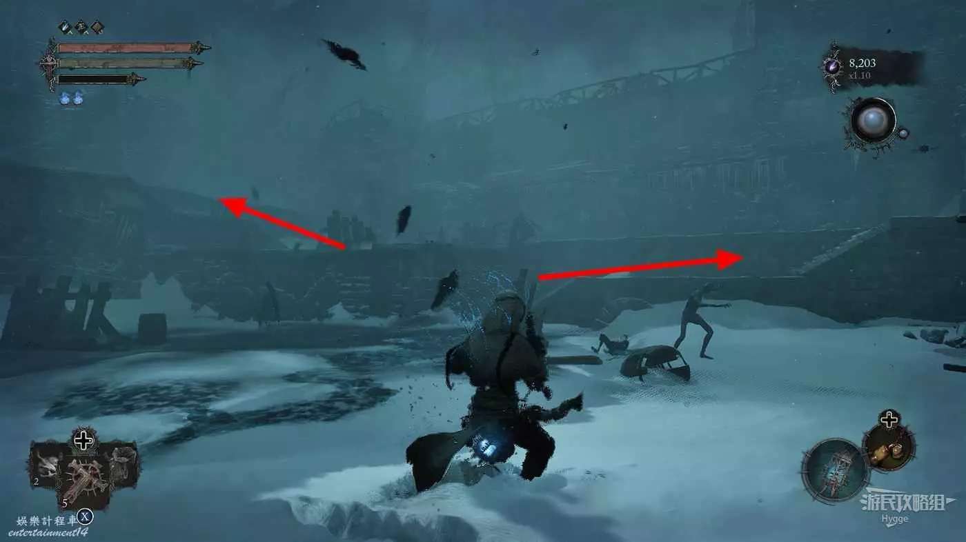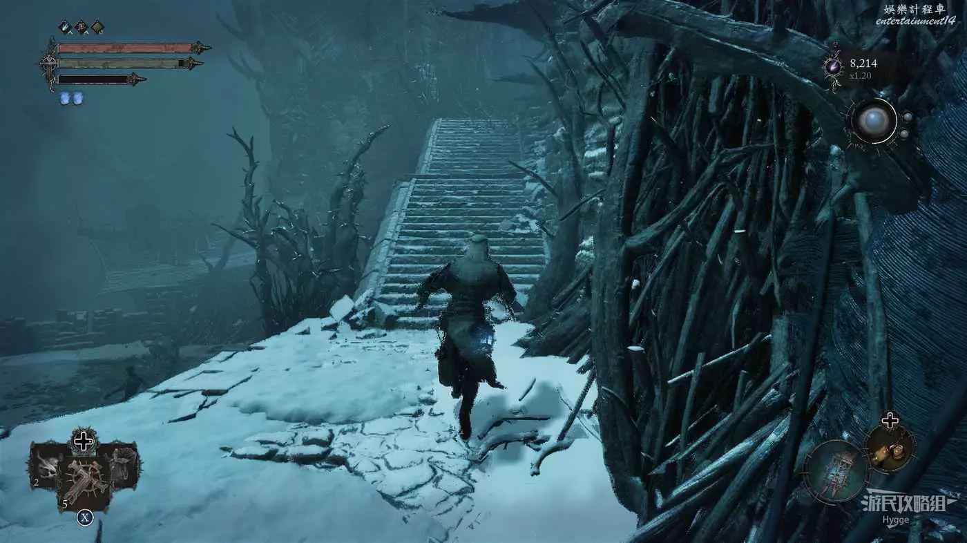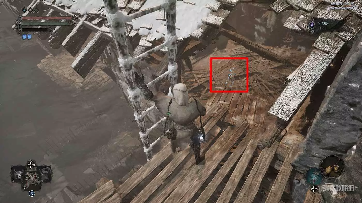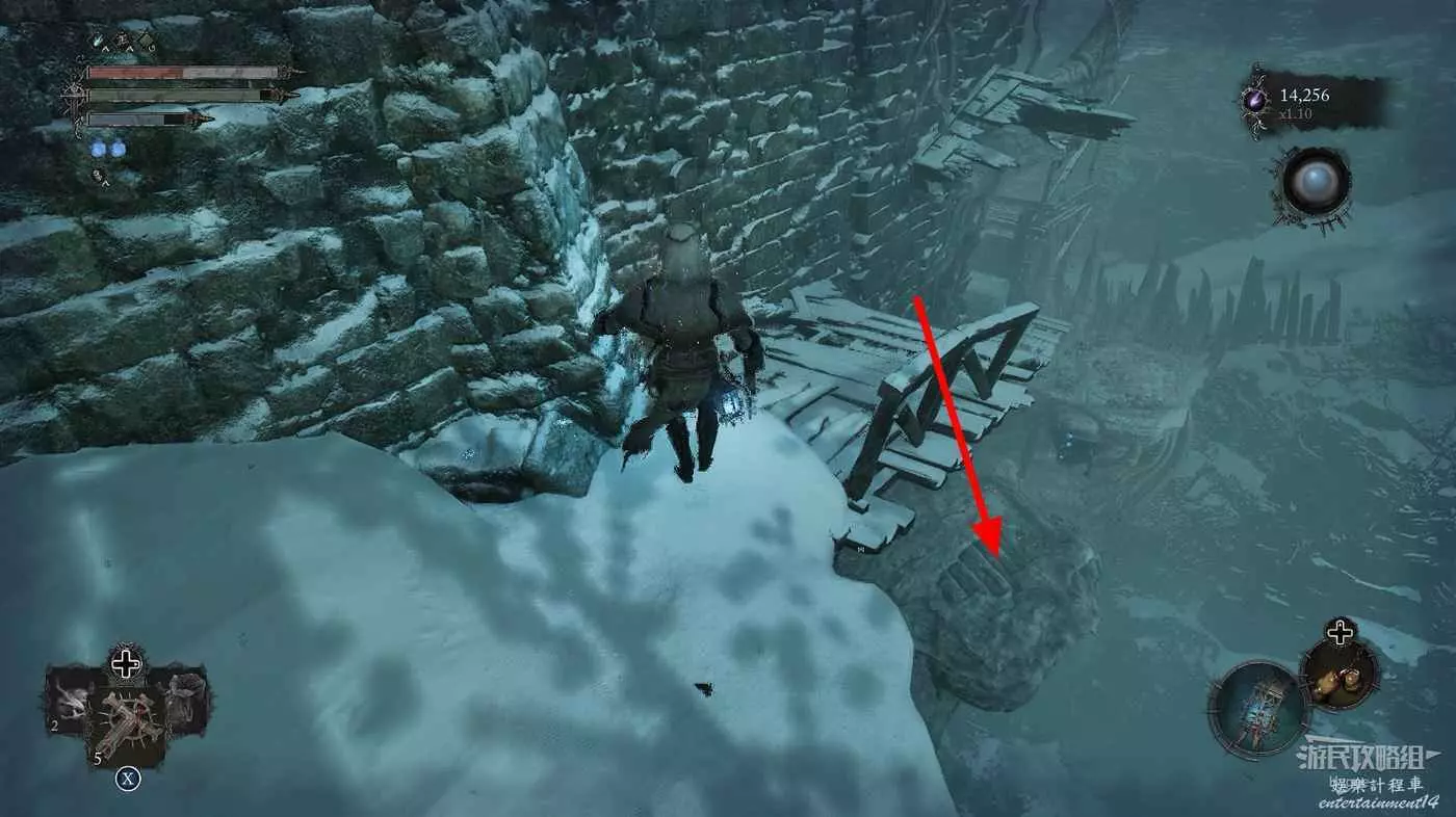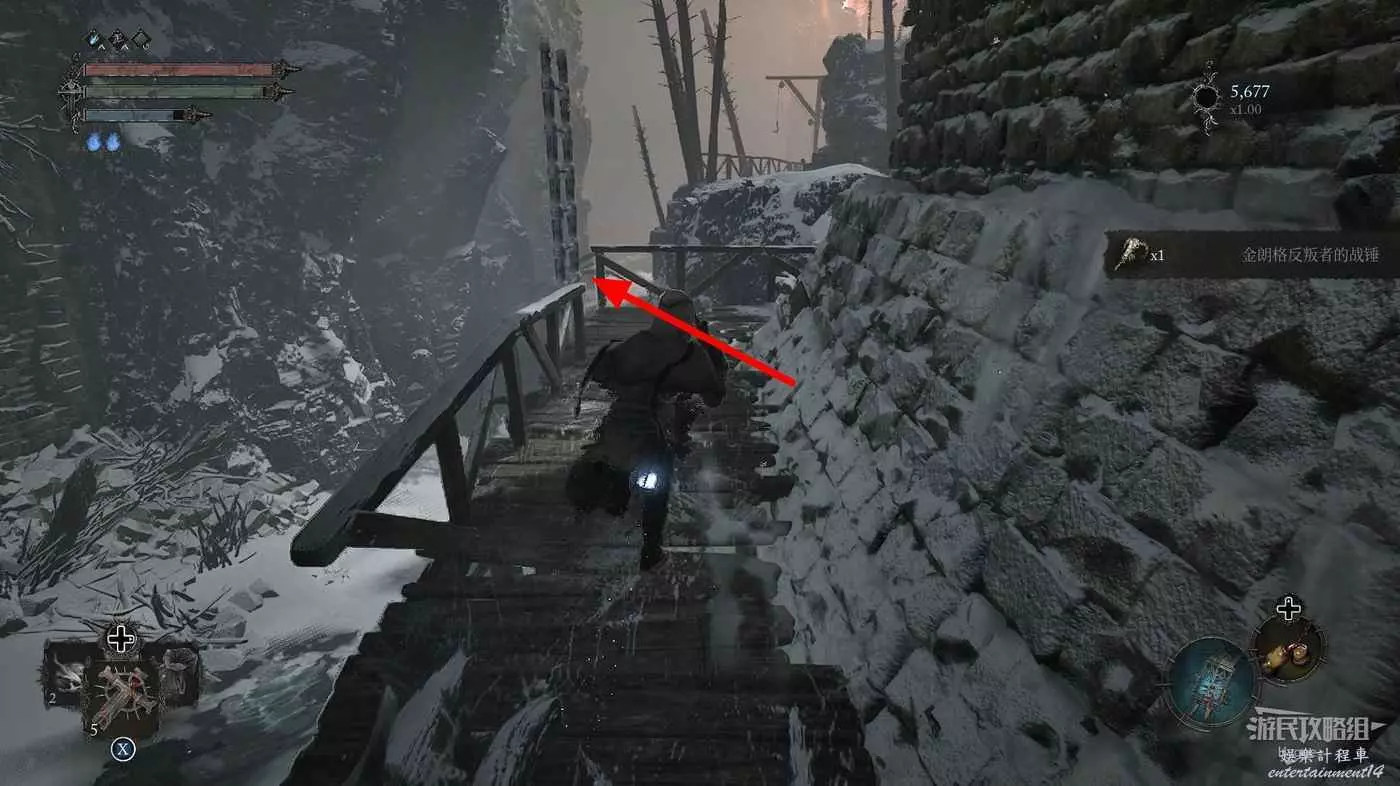 在前方被封堵住的城門旁拿到投擲武器【強化切割飛刀】後從旁邊的梯子向上正式進入寒冰詛咒之地。
