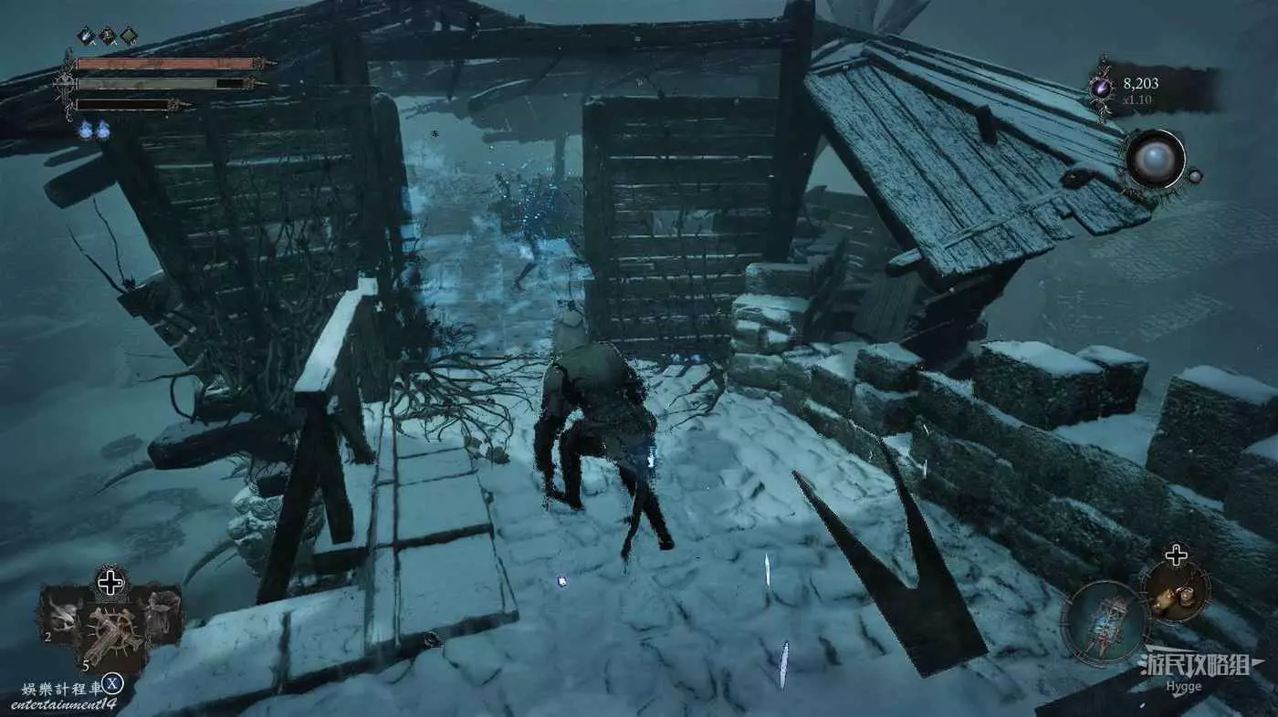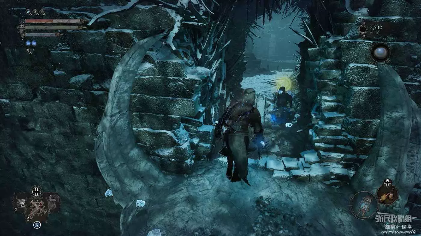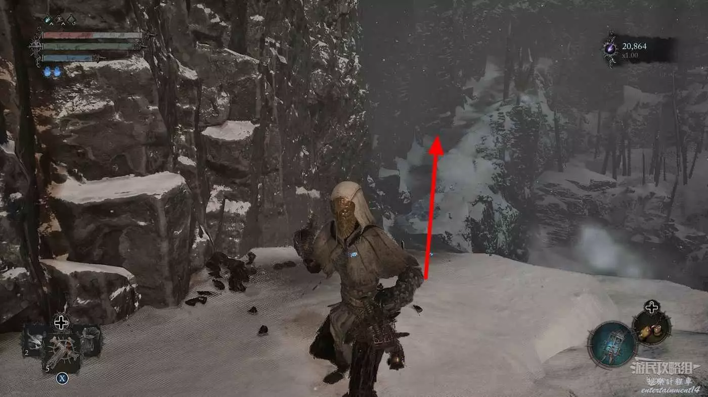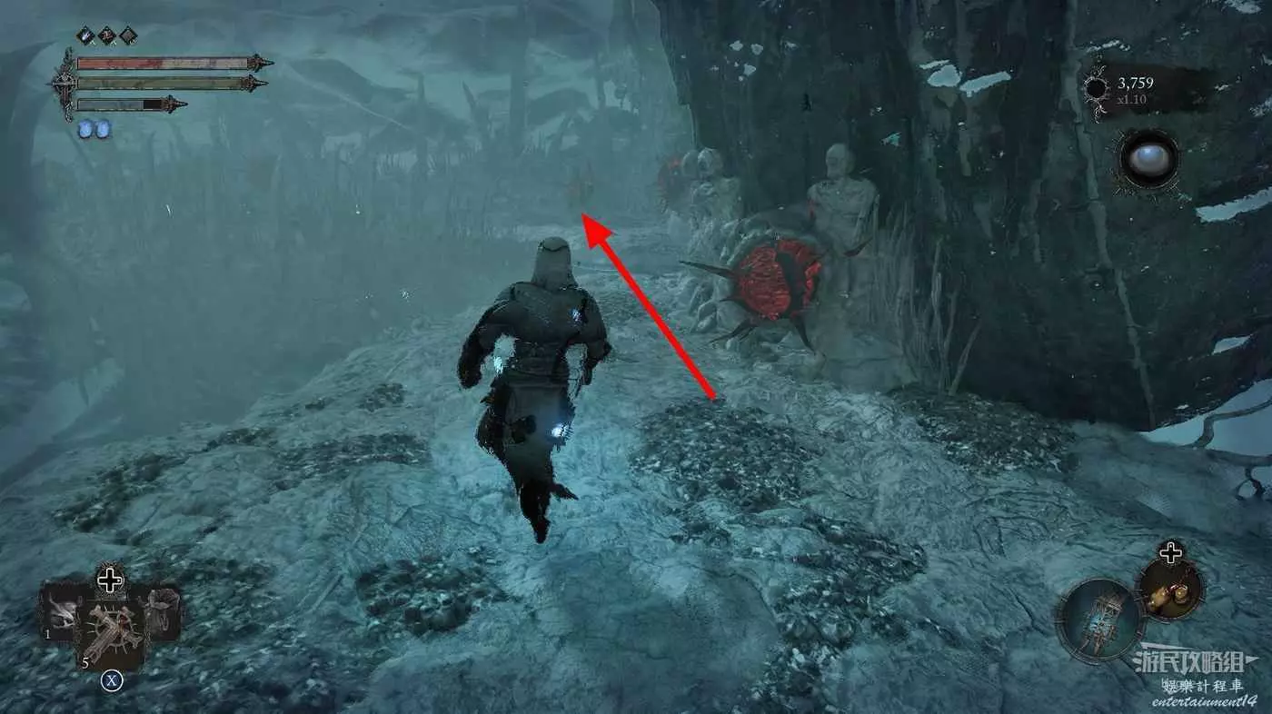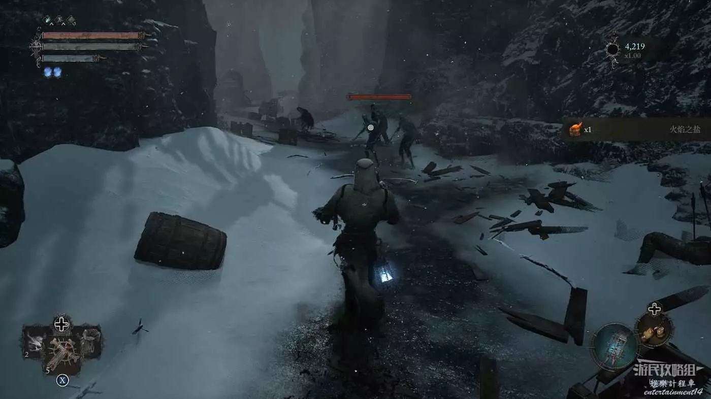 在前方被封堵住的城門旁拿到投擲武器【強化切割飛刀】後從旁邊的梯子向上正式進入寒冰詛咒之地。