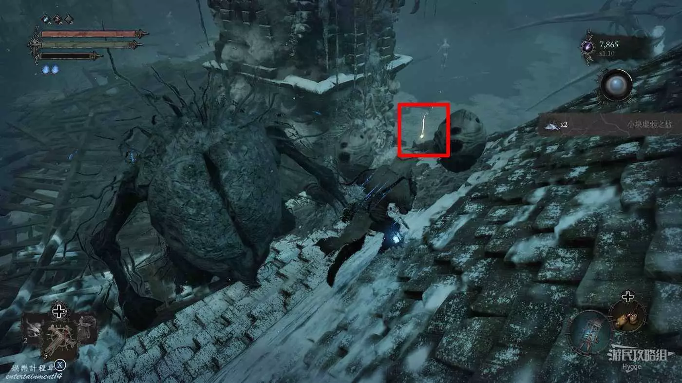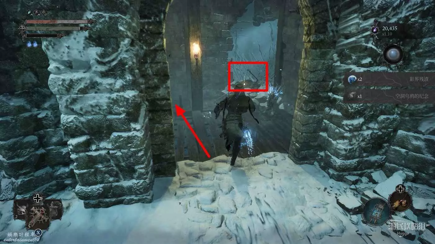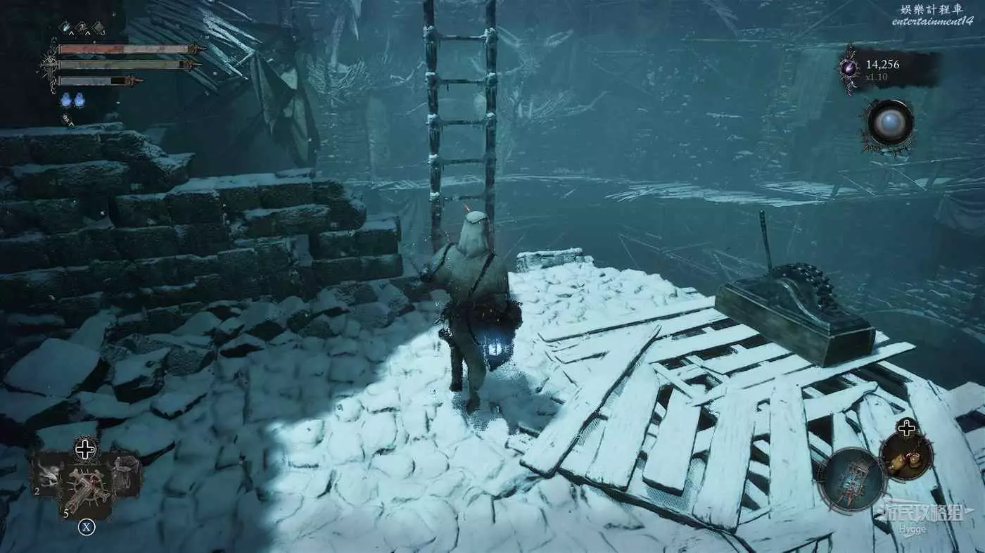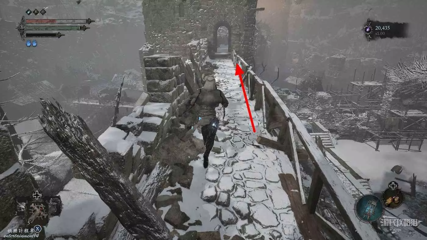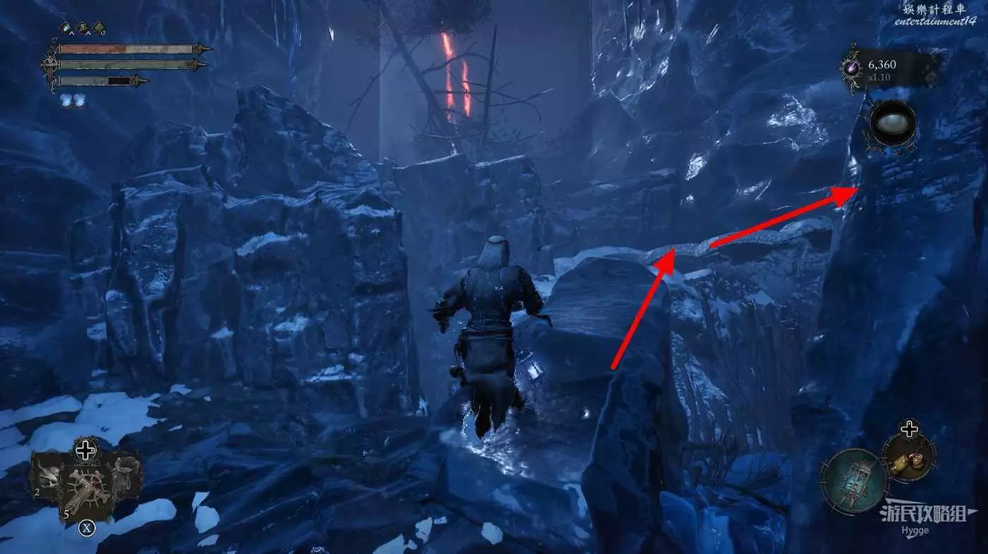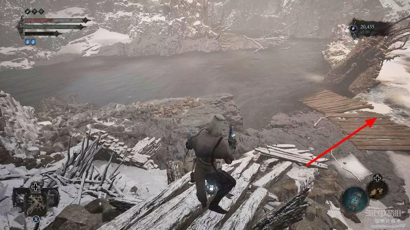 在前方被封堵住的城門旁拿到投擲武器【強化切割飛刀】後從旁邊的梯子向上正式進入寒冰詛咒之地。