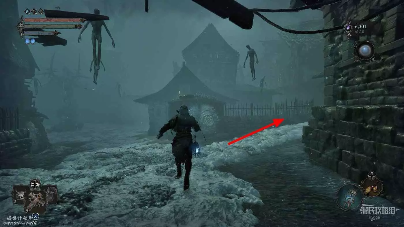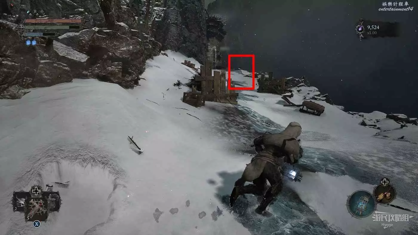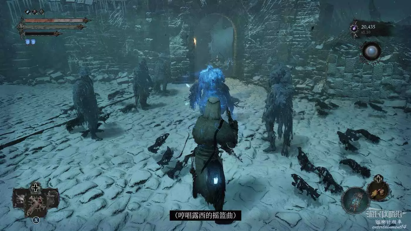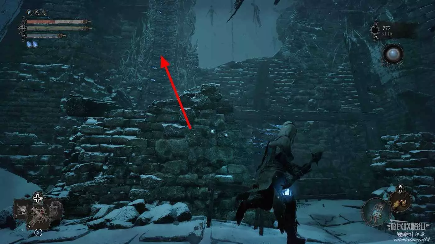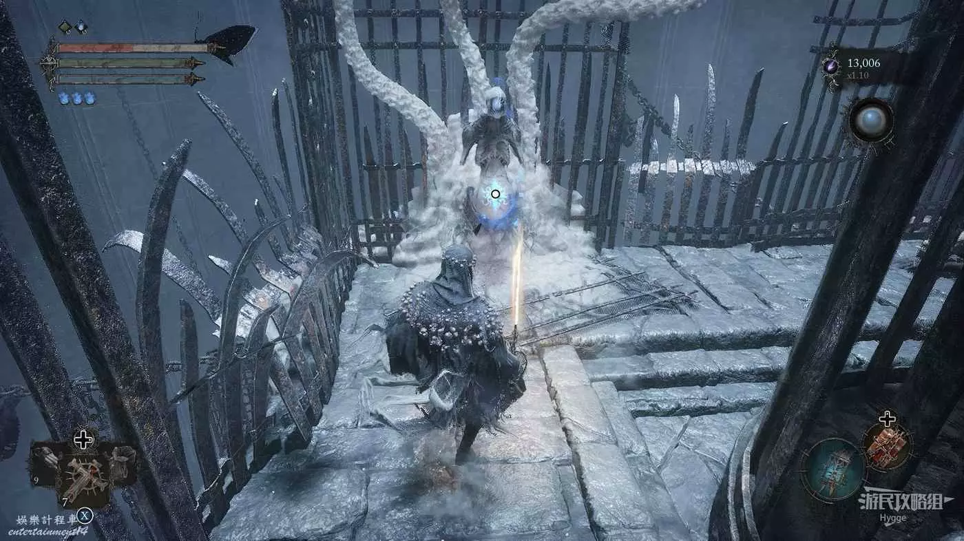 在前方被封堵住的城門旁拿到投擲武器【強化切割飛刀】後從旁邊的梯子向上正式進入寒冰詛咒之地。