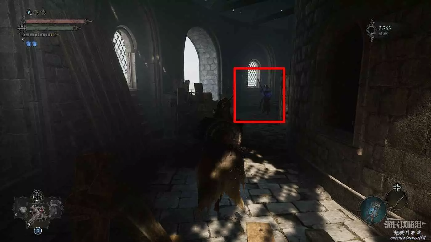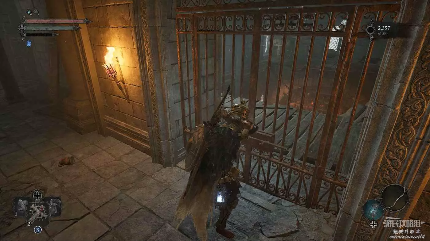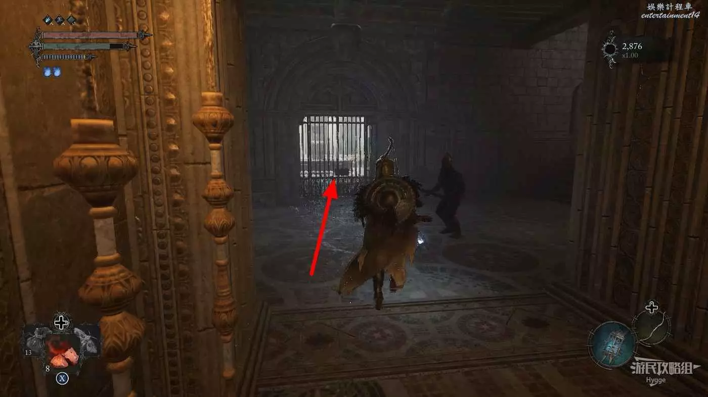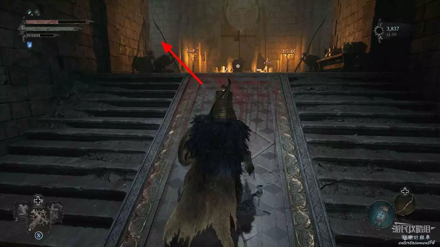 隨後來到大殿的左側區域,擊殺兩名士兵和一隻獵犬後可以打開通往噴泉位置的單向門。