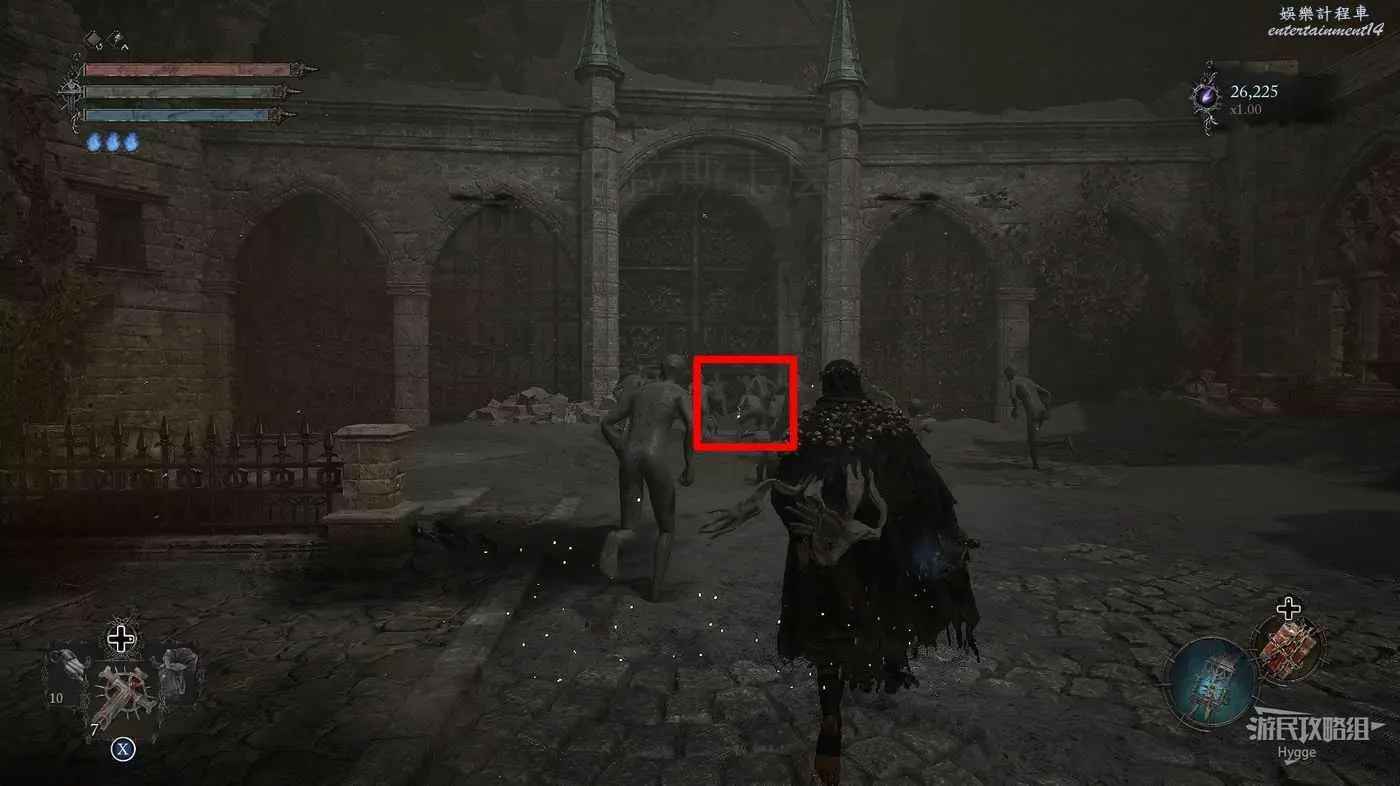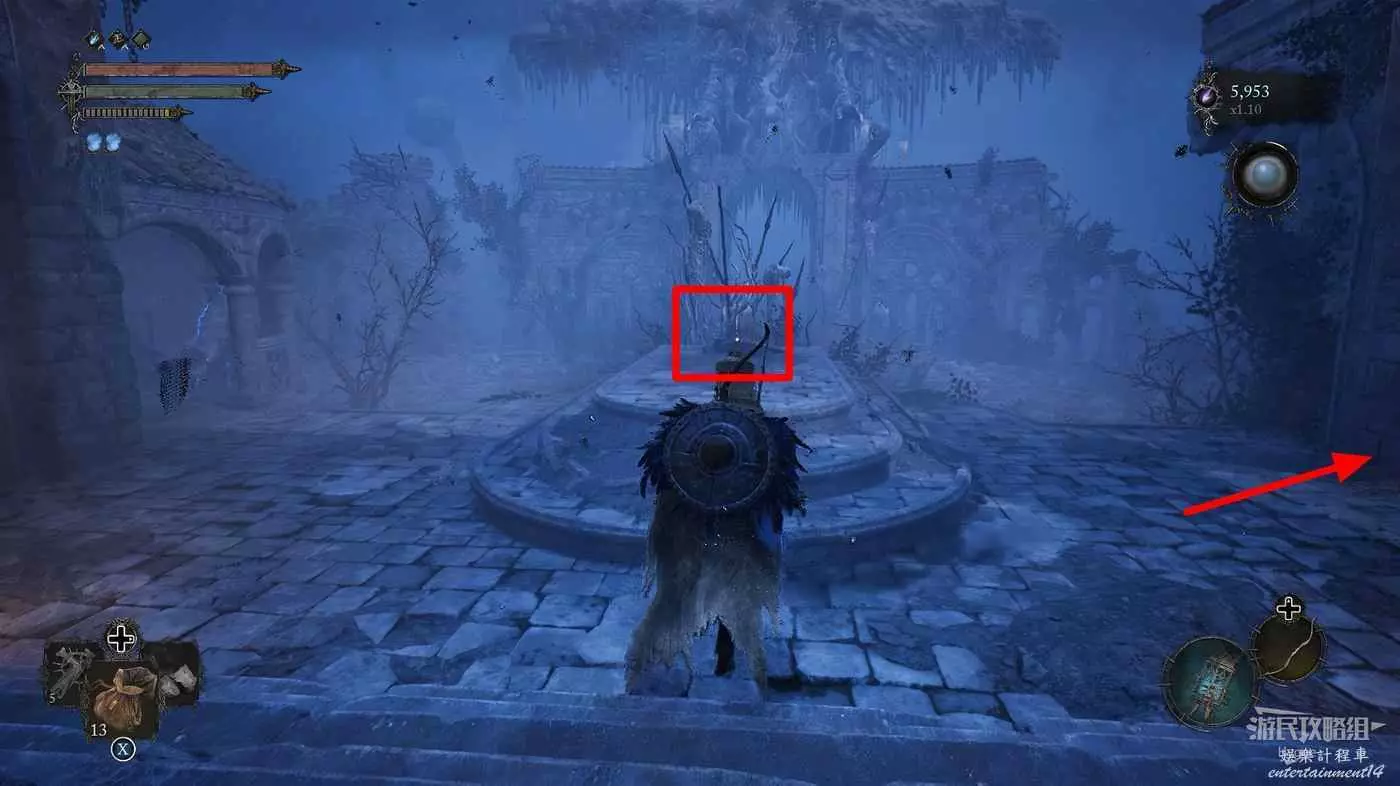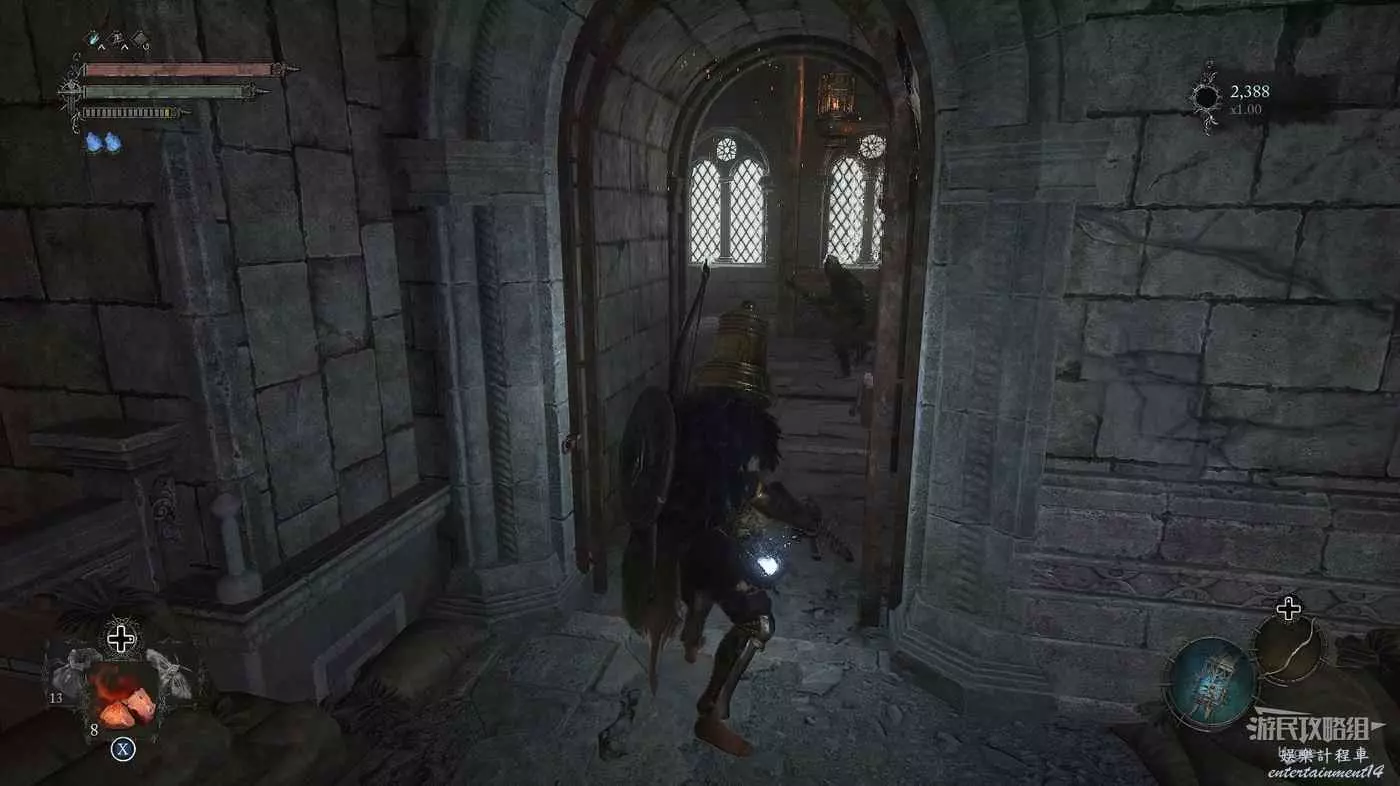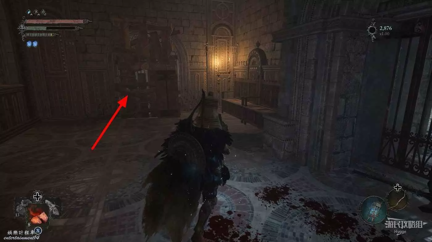 隨後來到大殿的左側區域,擊殺兩名士兵和一隻獵犬後可以打開通往噴泉位置的單向門。