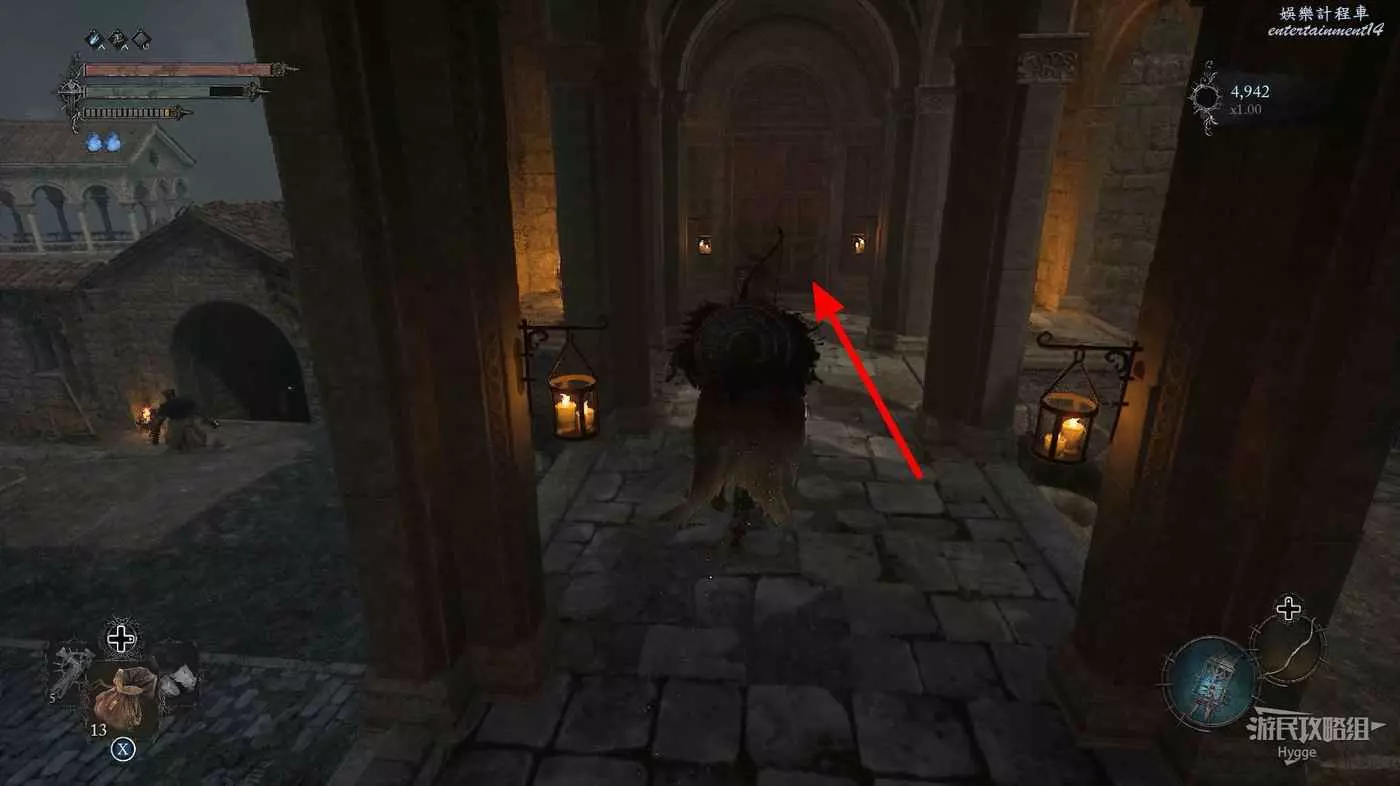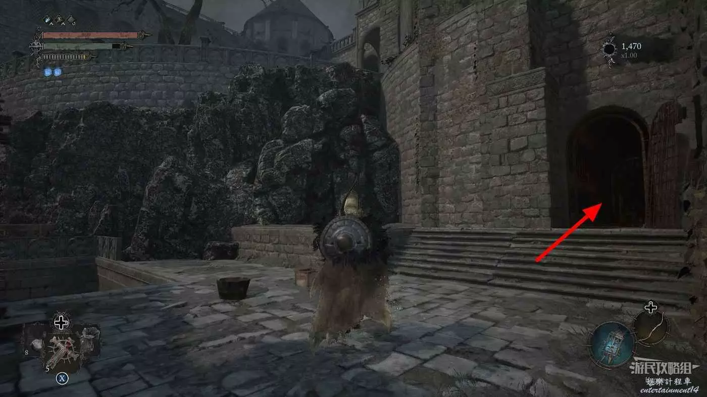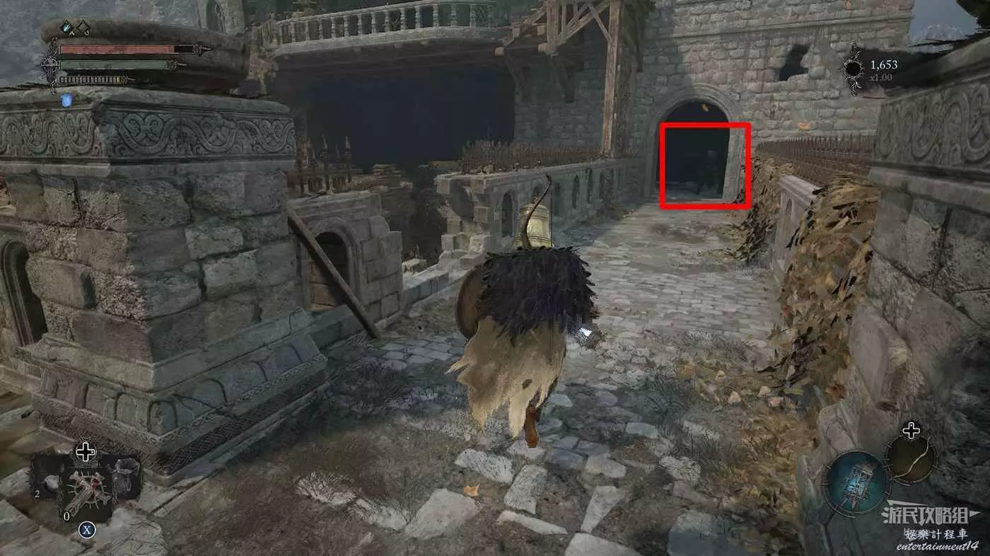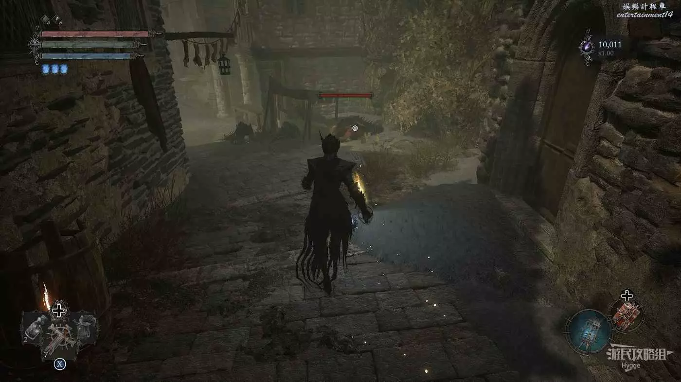 另一側的單向門則可以回到廚房門外的廣場上,在水池處可以拿到一些道具,不過要小心平臺上的弩手和獵犬。