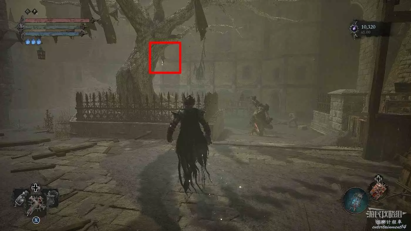 來到前方廣場後擊殺一名剝皮者,在旁邊大樹上懸掛的屍體上可以拿到飾品【飛蛾戒指】。