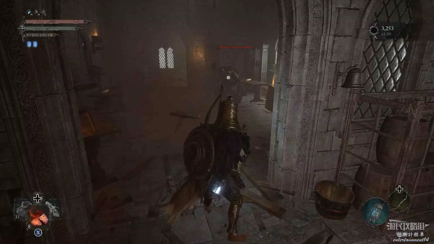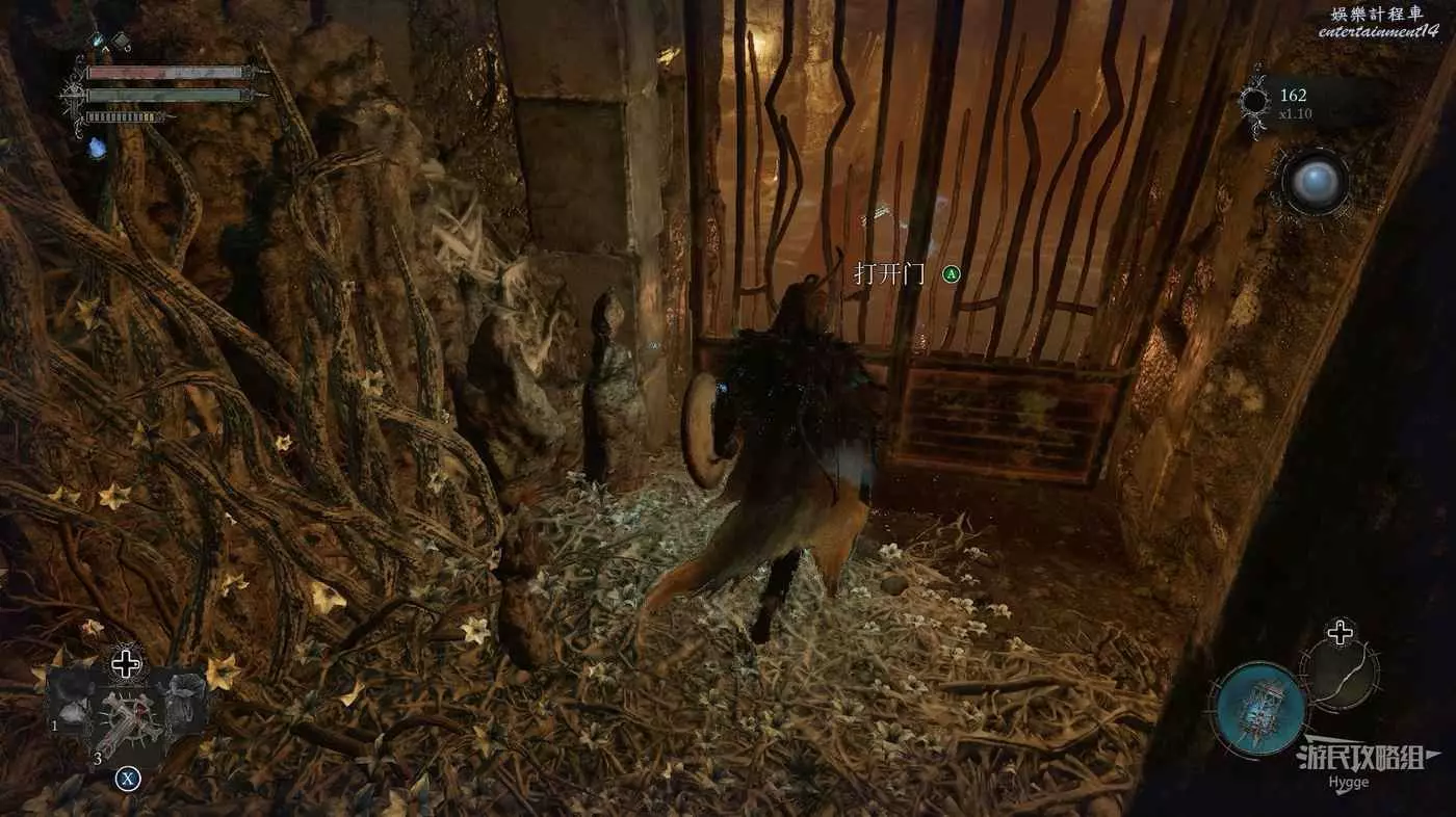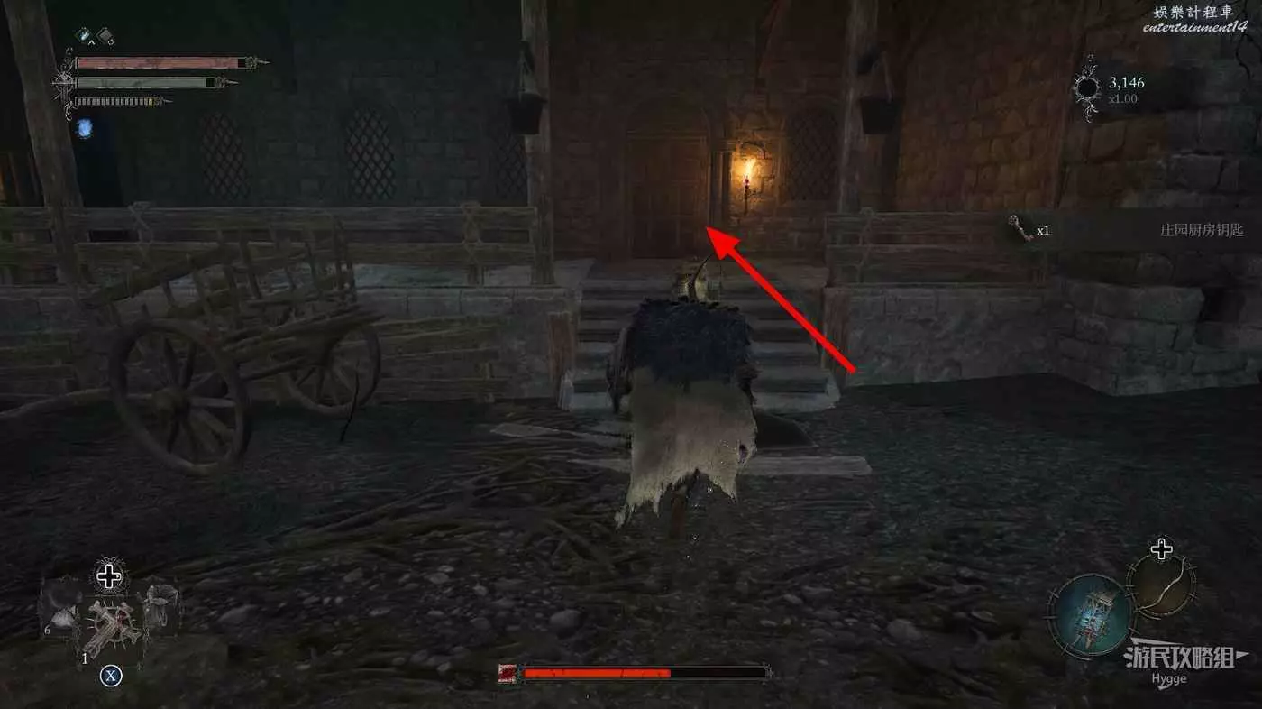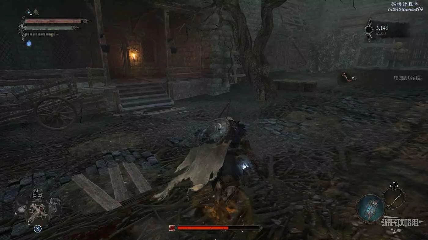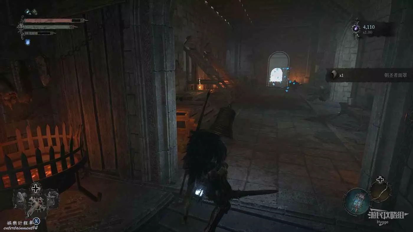 利用提燈穿過柵欄後可以在房間內拿到武器【臨終低語】,然後打通連接廚房對面的遺骸的捷徑。