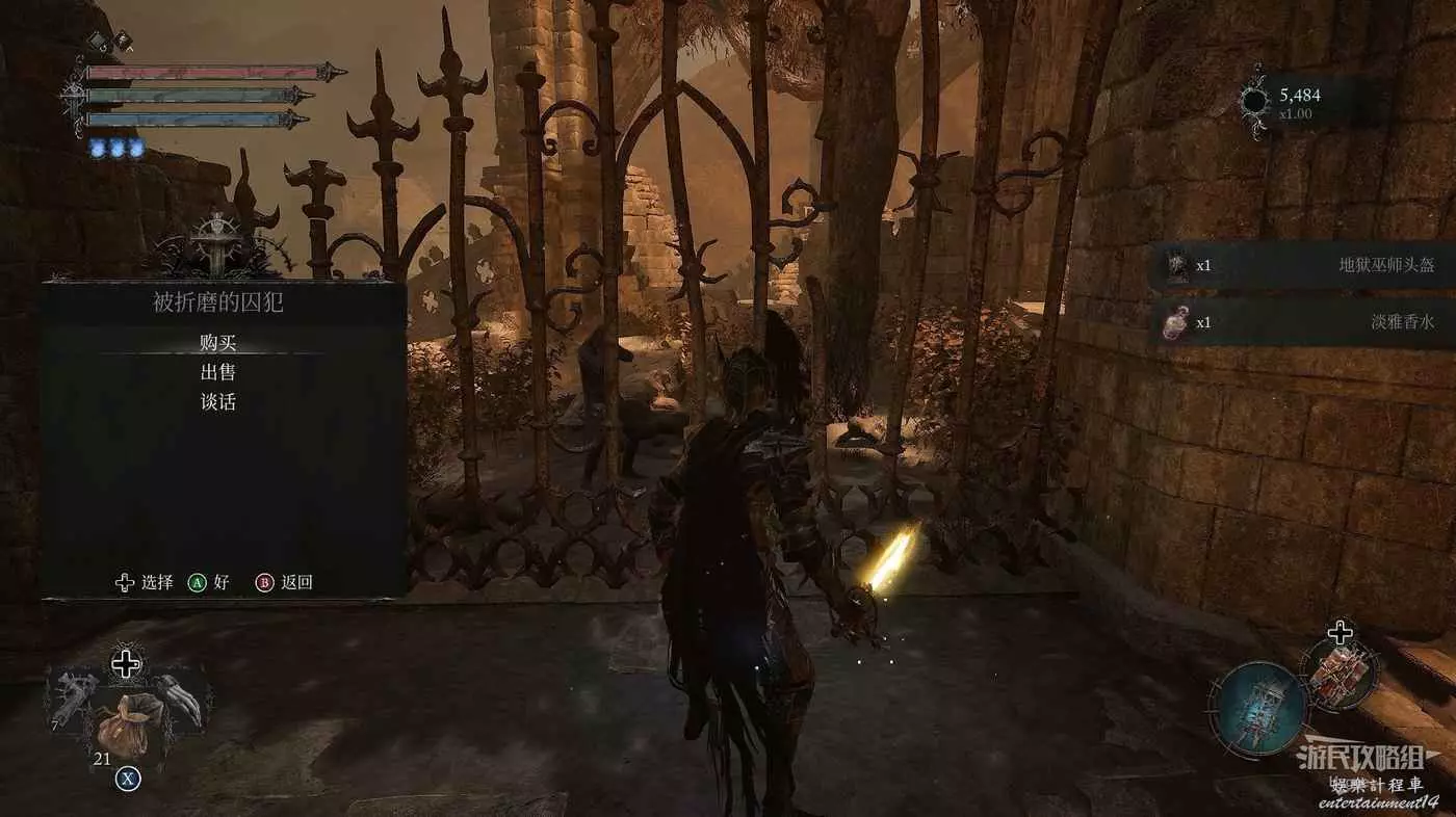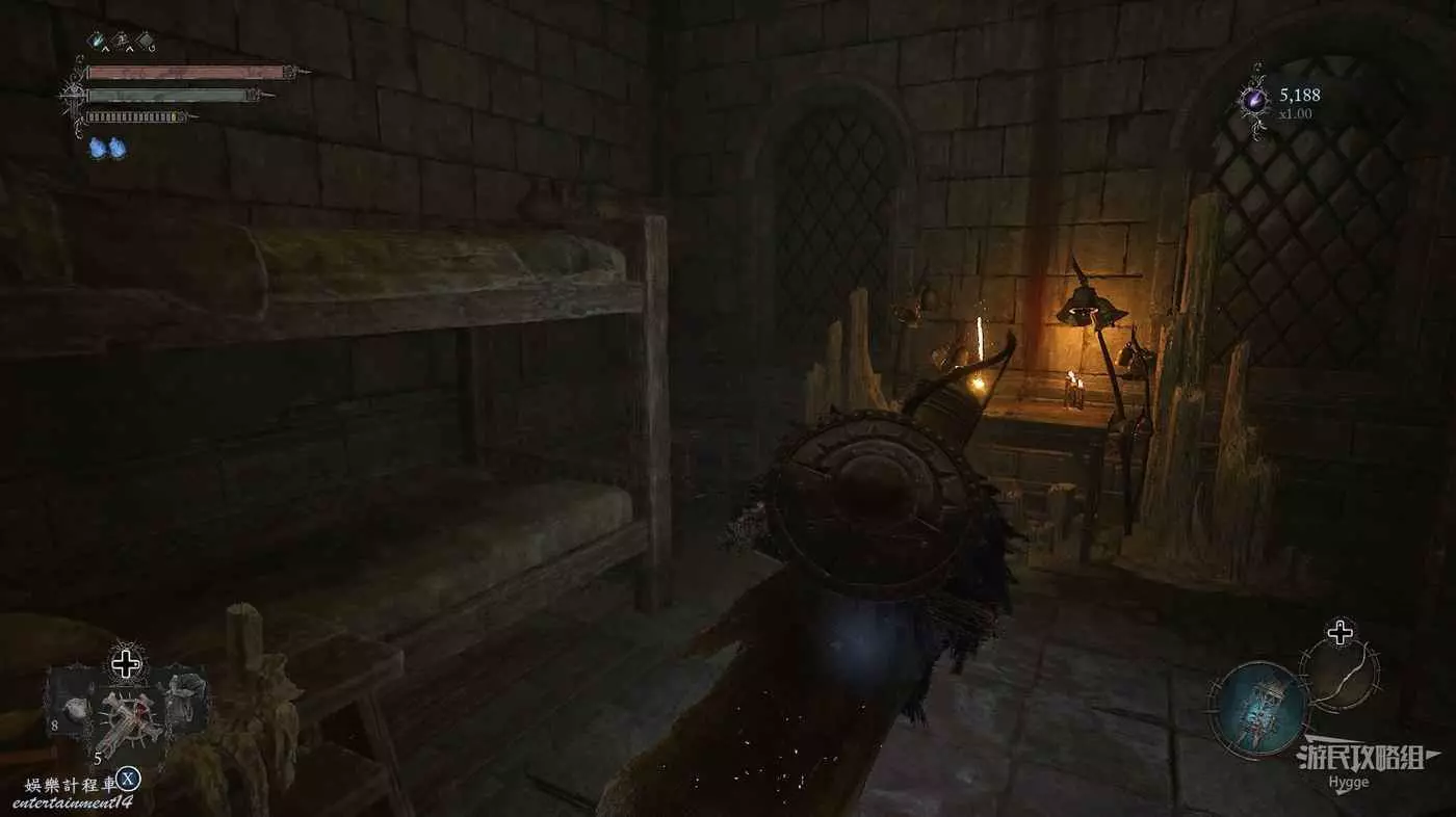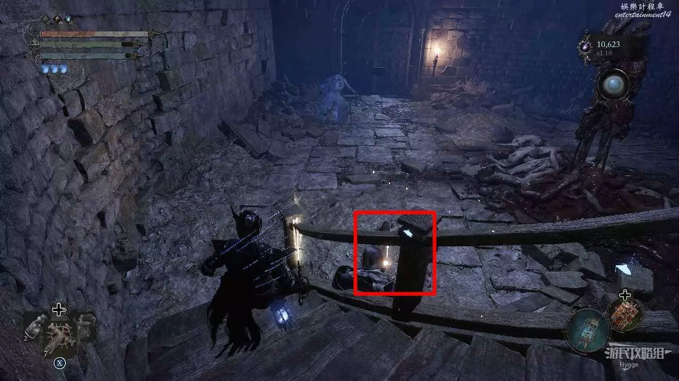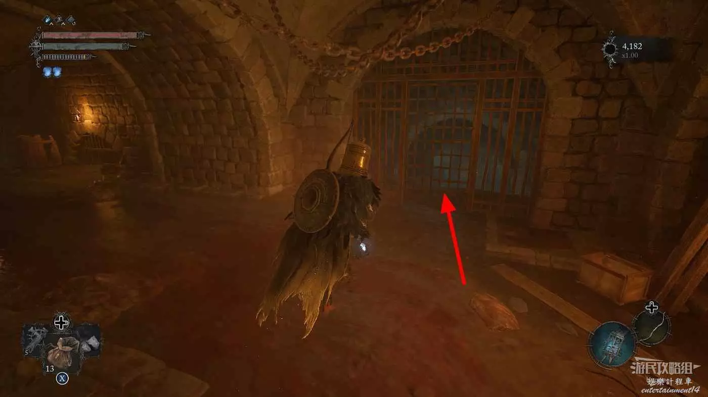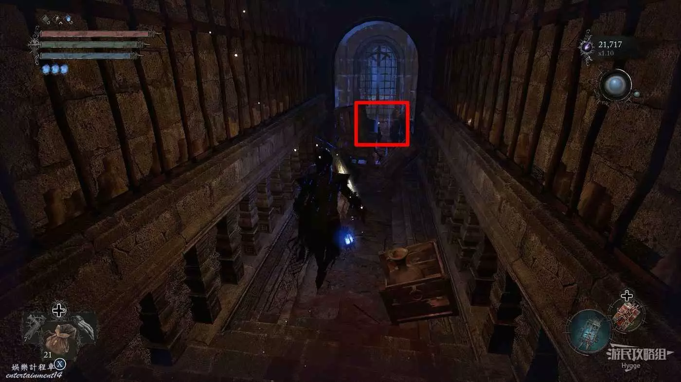 利用提燈穿過柵欄後可以在房間內拿到武器【臨終低語】,然後打通連接廚房對面的遺骸的捷徑。