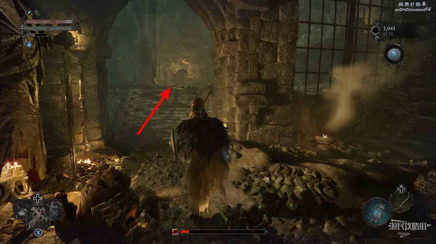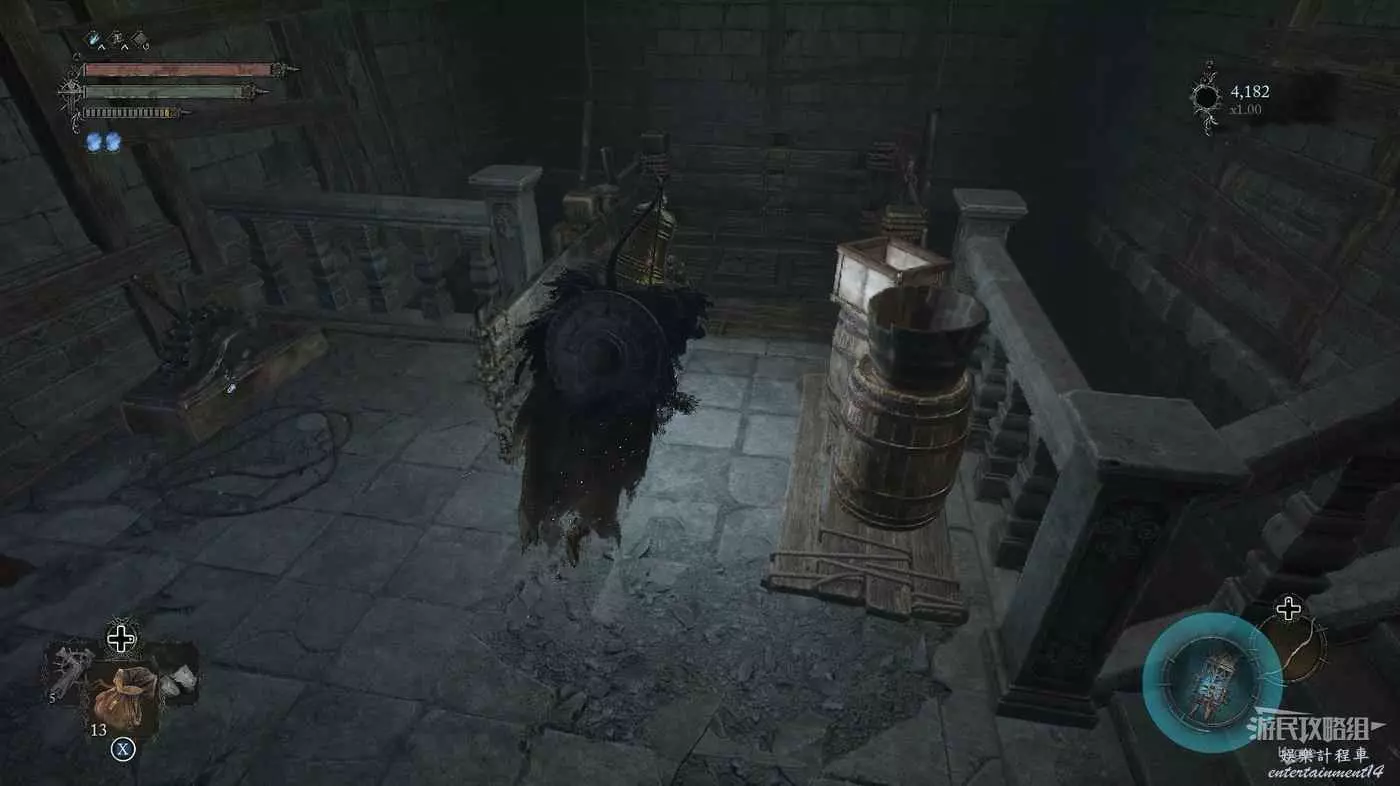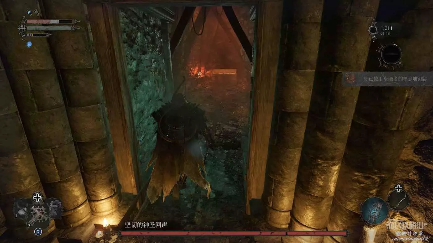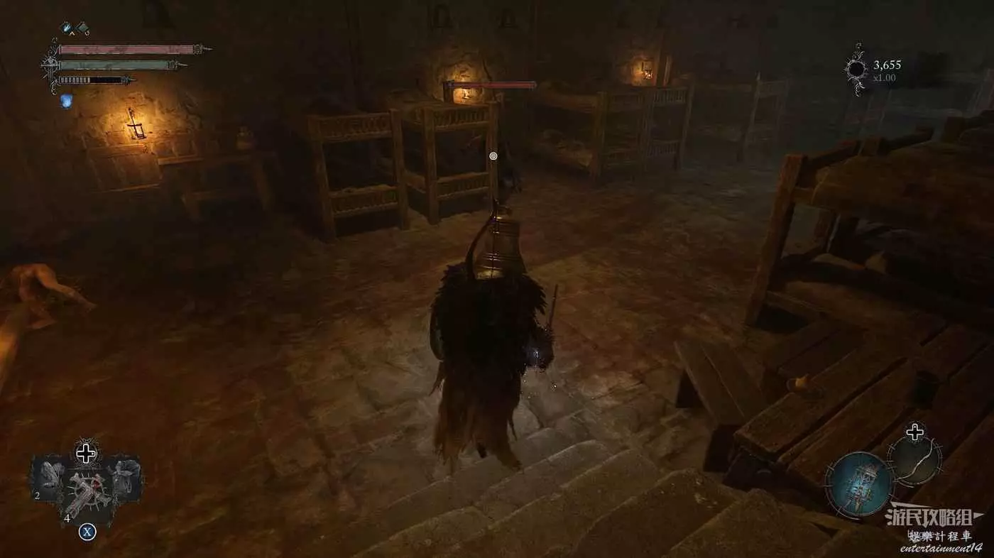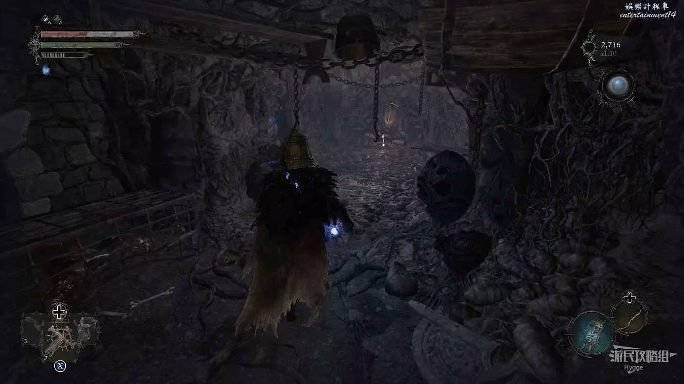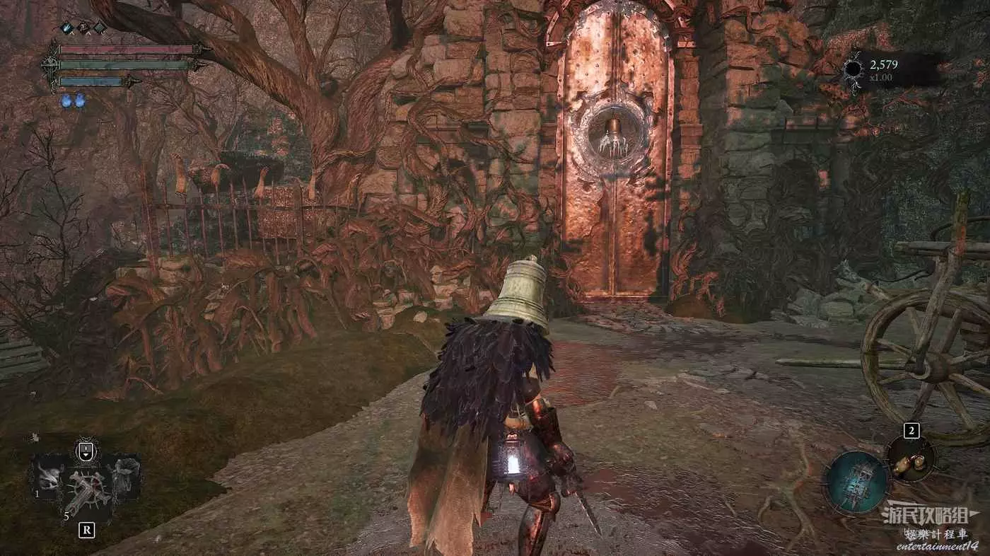 利用提燈穿過柵欄後可以在房間內拿到武器【臨終低語】,然後打通連接廚房對面的遺骸的捷徑。